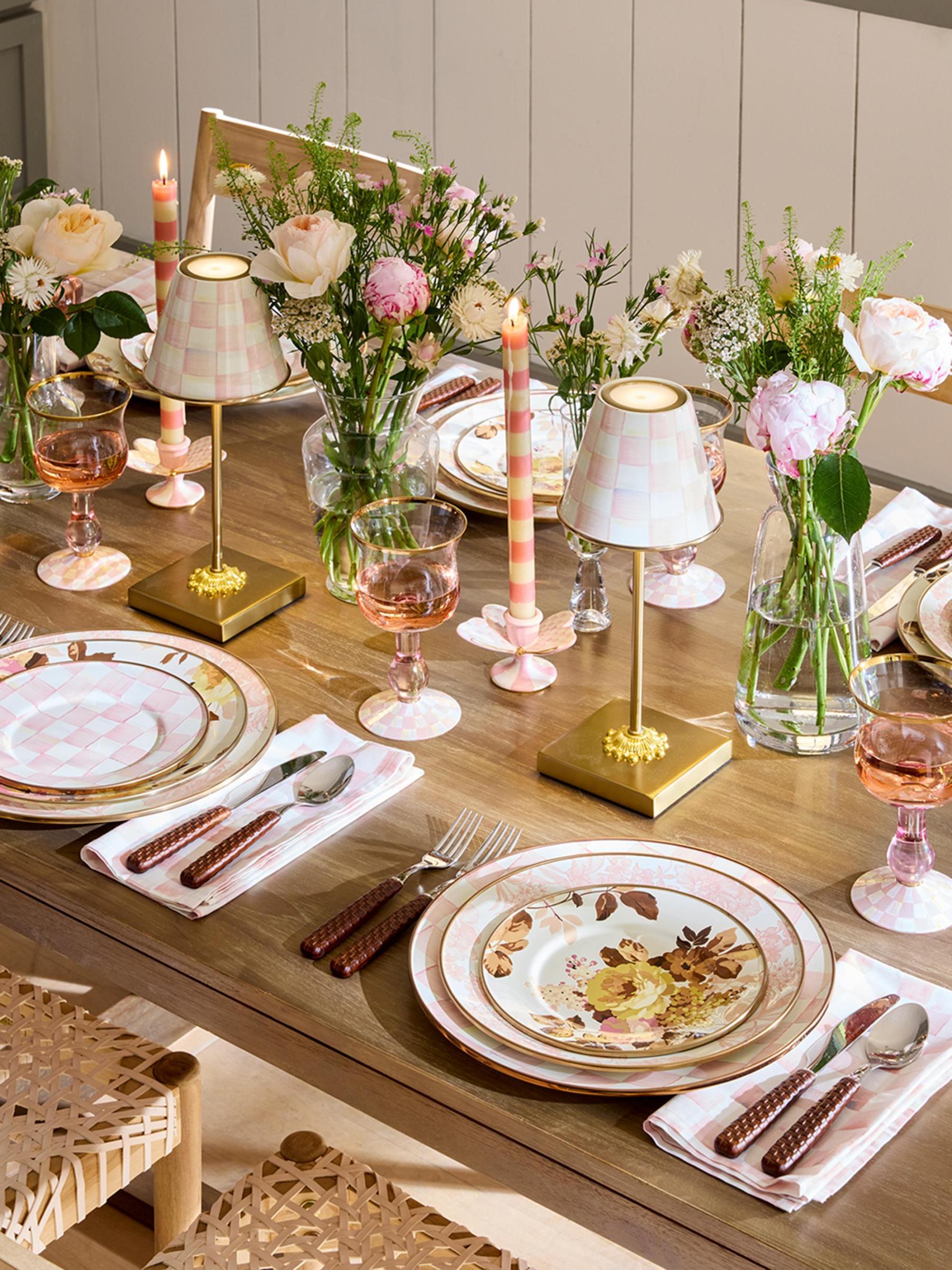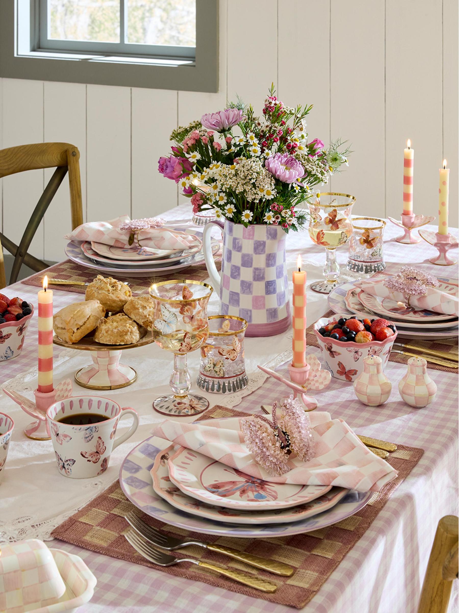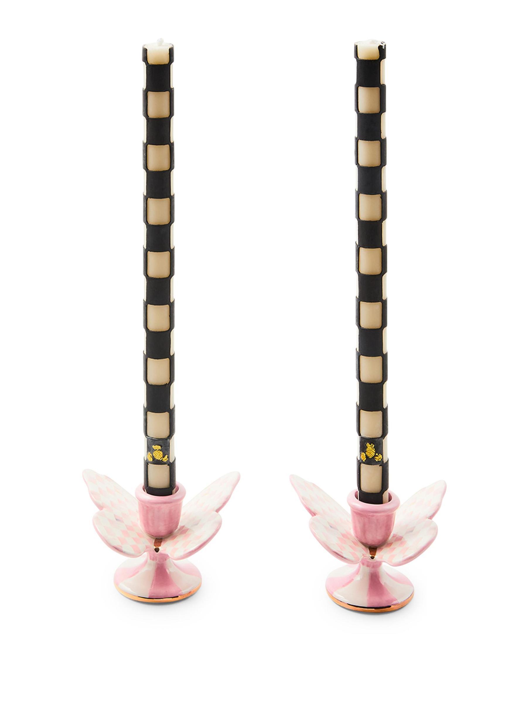 يتميز هذا الطقم الخزفي المكون من قطعتين من Mackenzie-Childs بحوامل شموع Rosy Check® Butterfly مع نمط مربعات على أجنحة الفراشة المزينة بالبريق الذهبي.