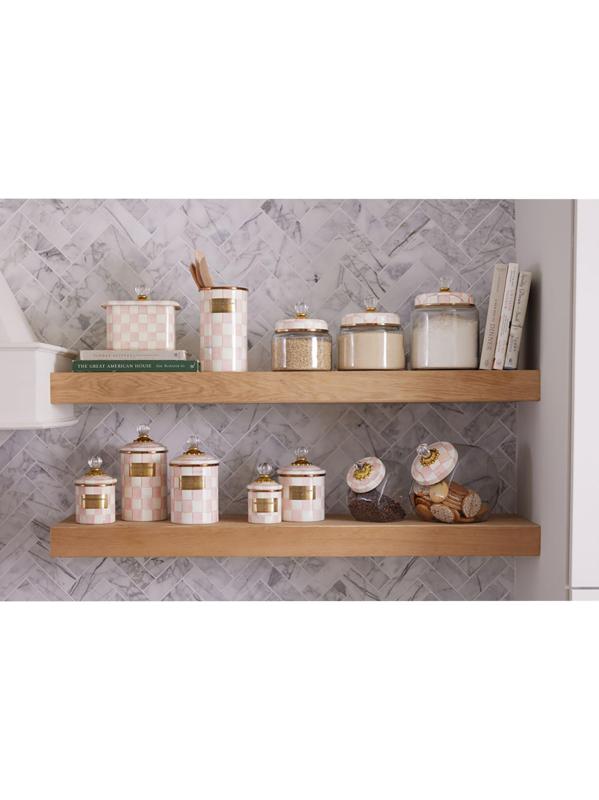 احتفظ بعلبة Rosy Check® Demi من Mackenzie-Childs في المطبخ أو ابتكر استخدامات جديدة في جميع أنحاء المنزل. كل علبة فولاذية مطلية بالمينا مطلية يدويًا بفحوصات مرسومة بالألوان في مجموعة من الأشكال وتعلوها مقبض زجاجي. يقوم ختم السيليكون بتأمين الغطاء.