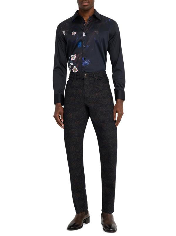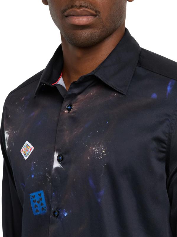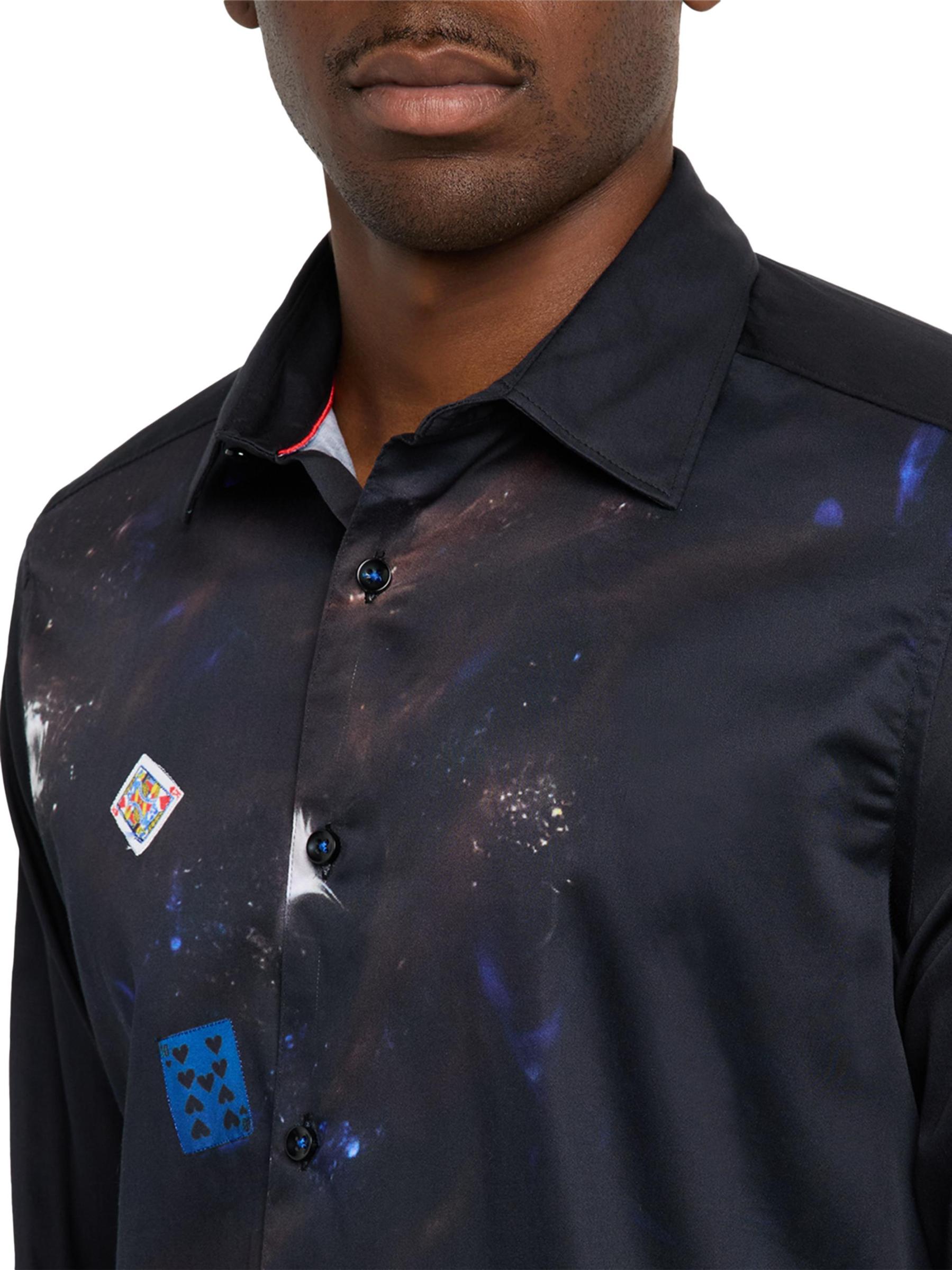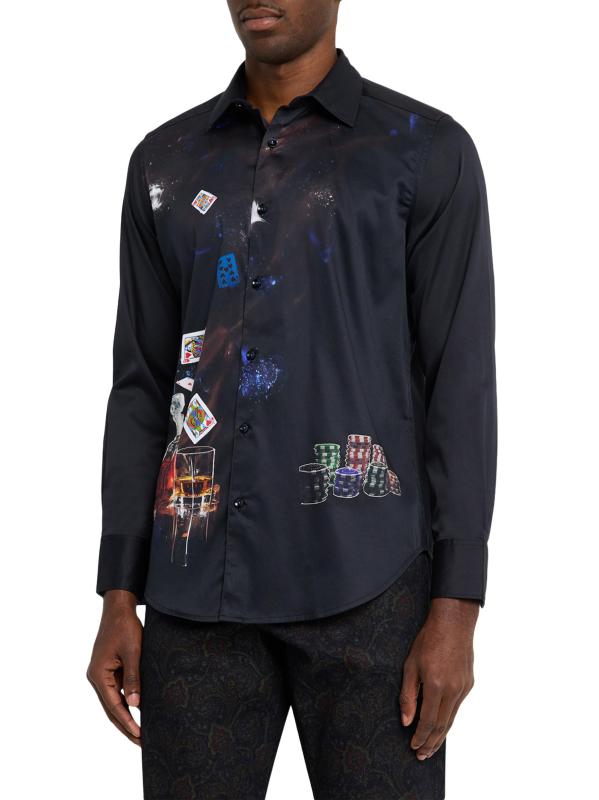 تضفي بطاقات البوكر والرقائق ووعاء المشروبات الكحولية الفاخر جوًا من الأناقة الملكية على هذا القميص الفاخر المصنوع من القطن القابل للتمدد من روبرت جراهام.