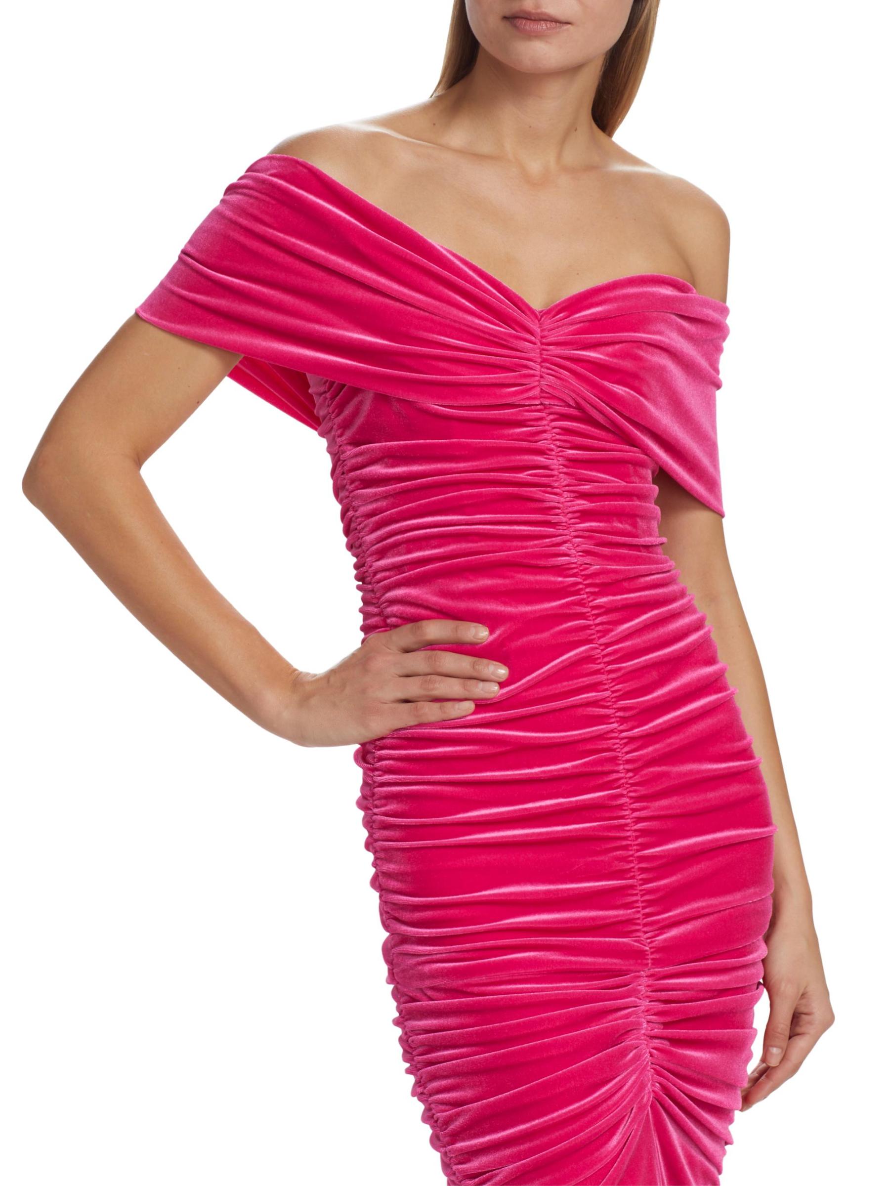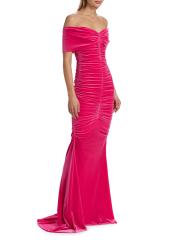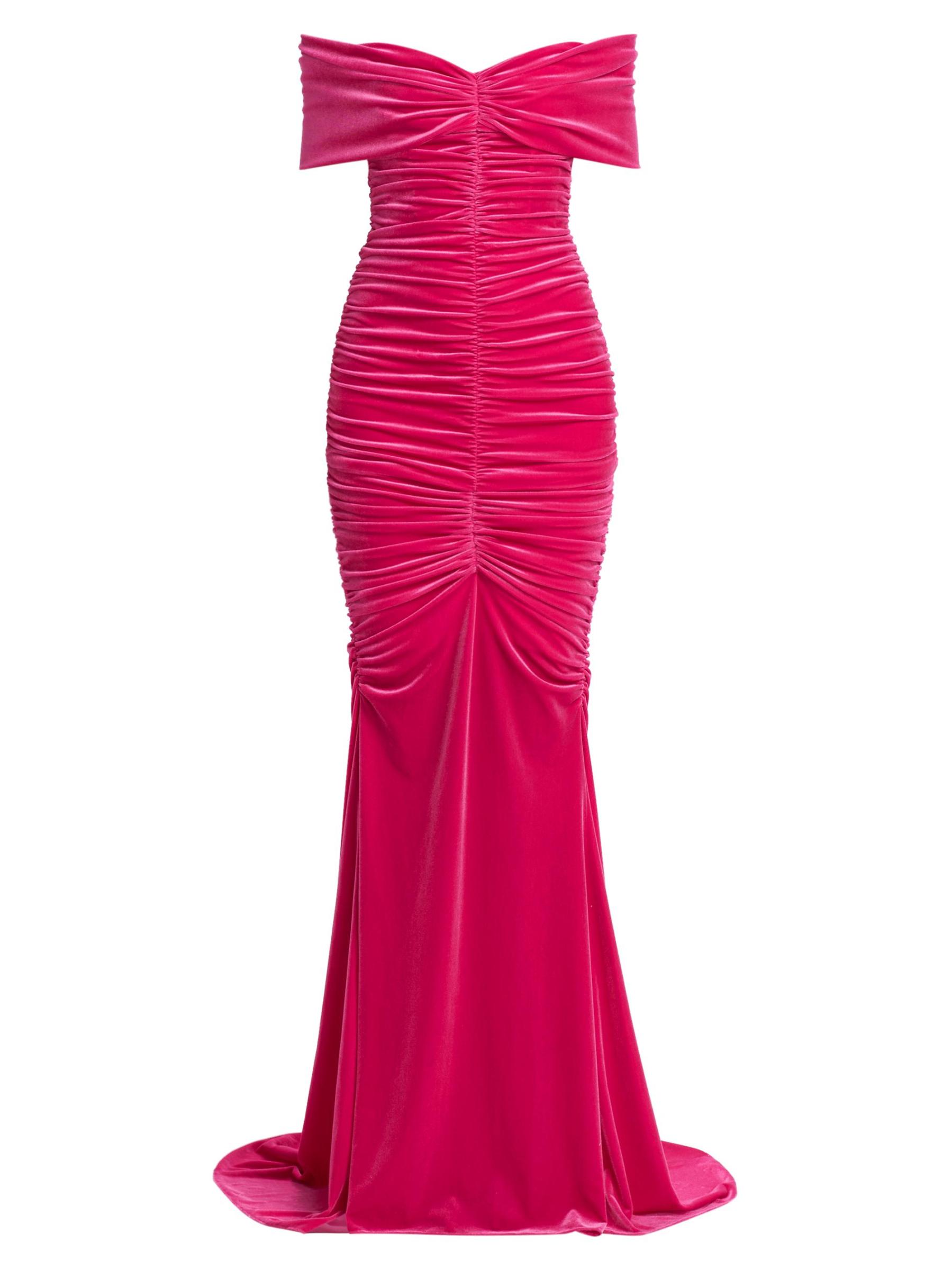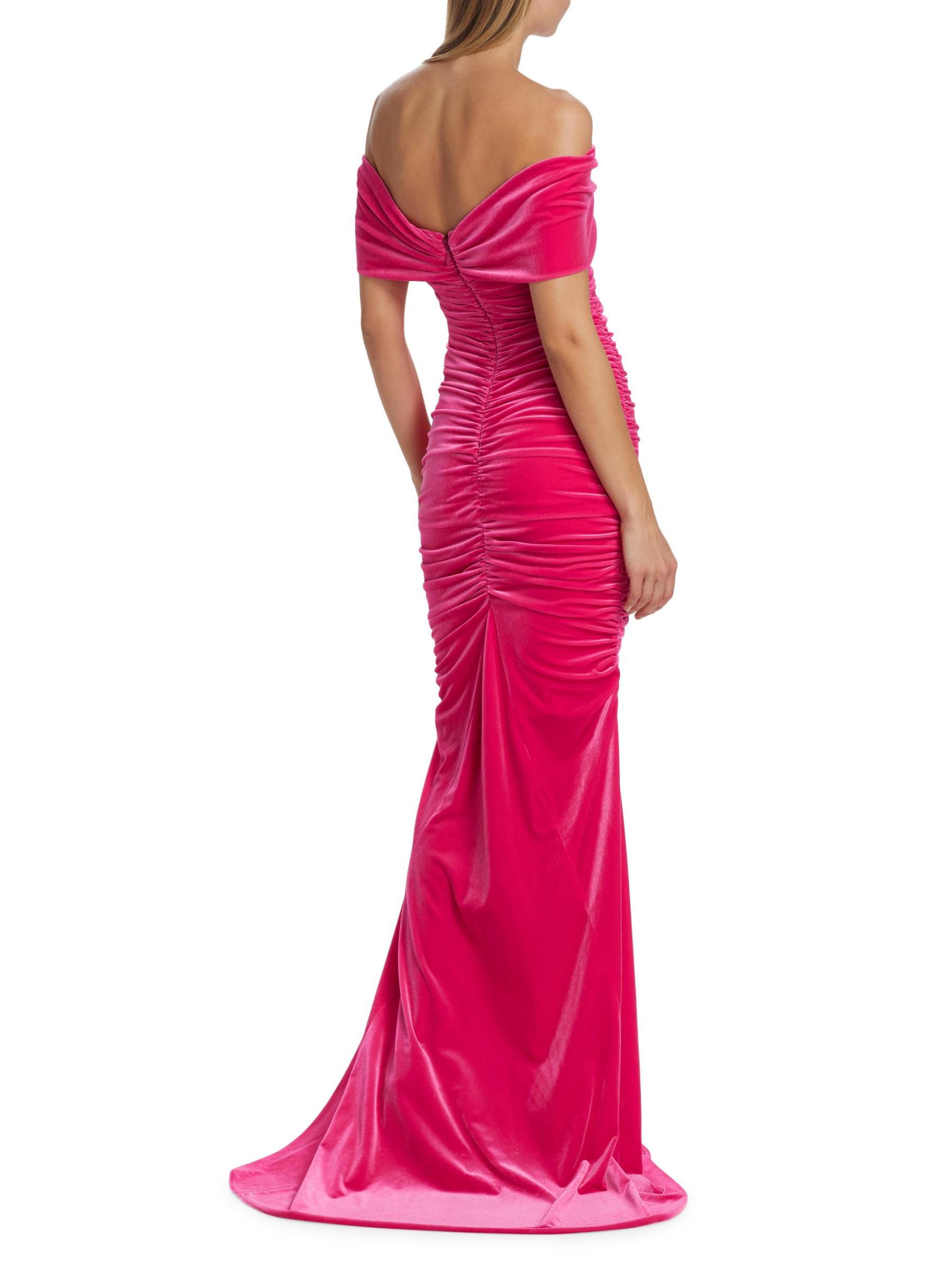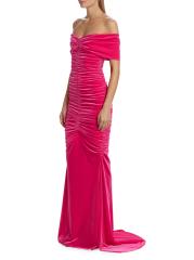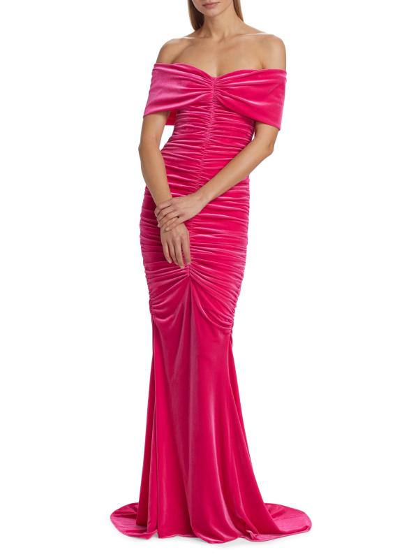 يتميز فستان Monique Lhuillier ذو الأكتاف المكشوفة والمصنوع من المخمل الناعم بالجزء الخارجي المزركش والحاشية الخلفية الأنيقة.