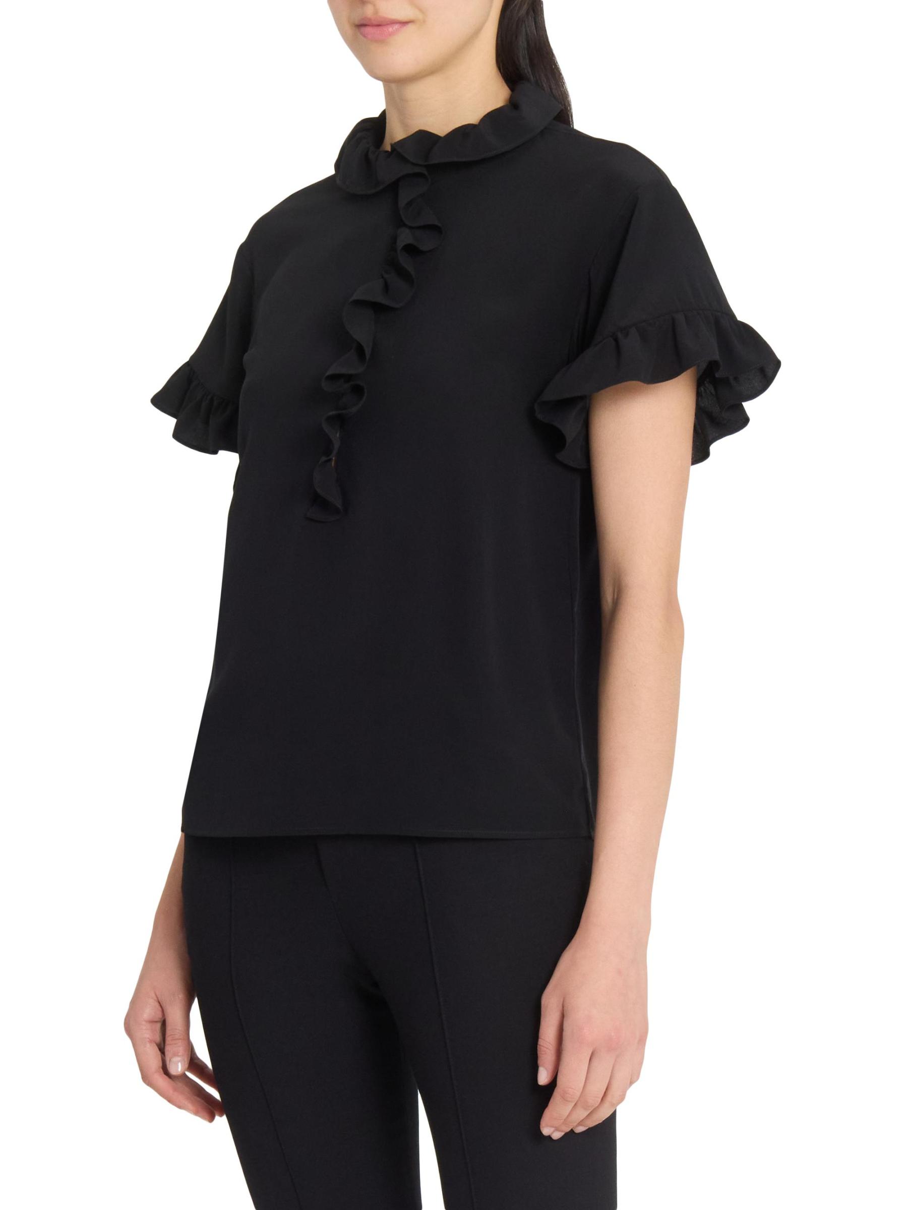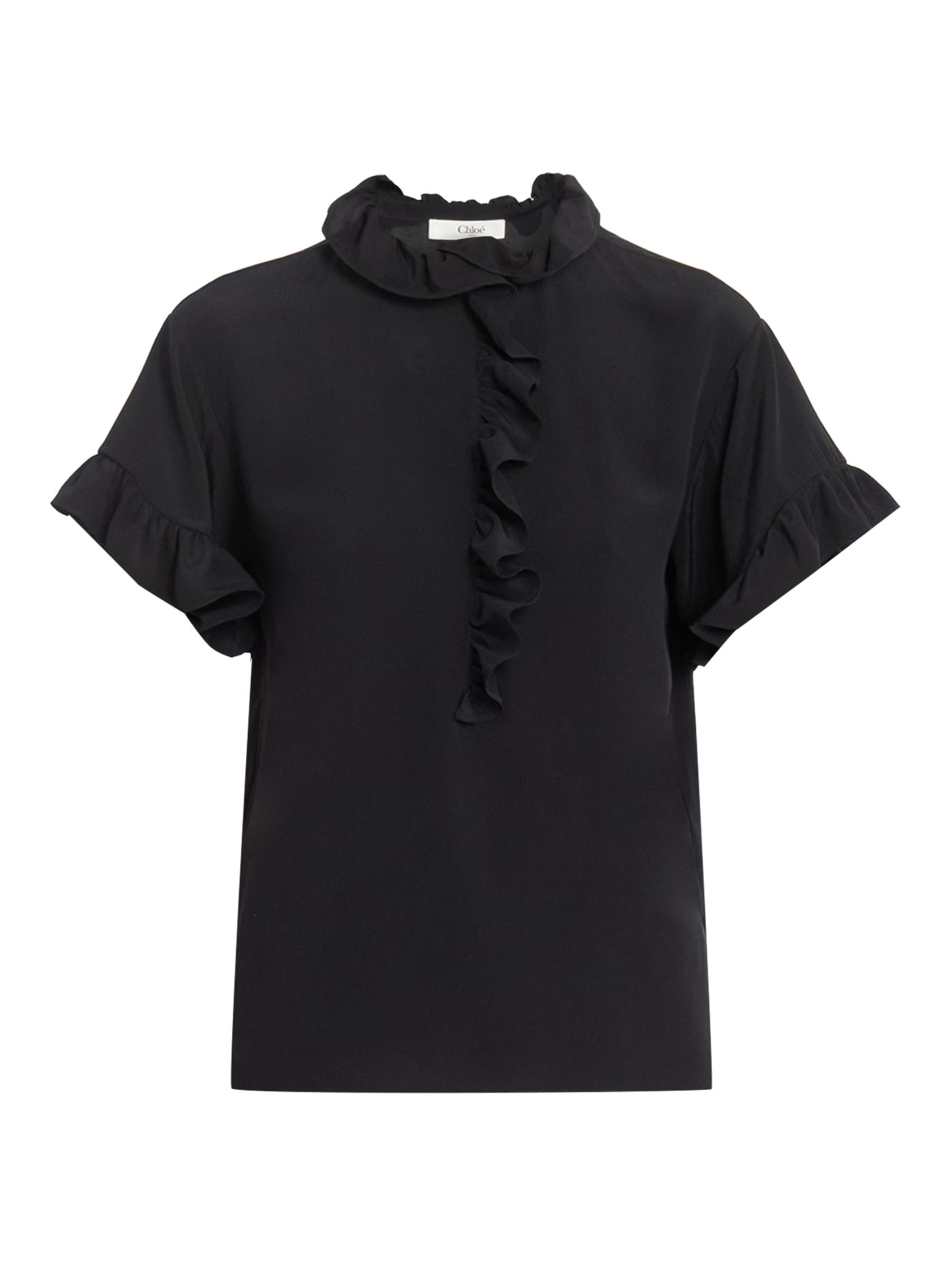 تتميّز بلوزة Chloé ذات الأكمام القصيرة هذه المصنوعة من الحرير الفاخر بزخرفة رقيقة مكشكشة تتدرج بشكل جميل أسفل خط العنق وتشمل الأساور.