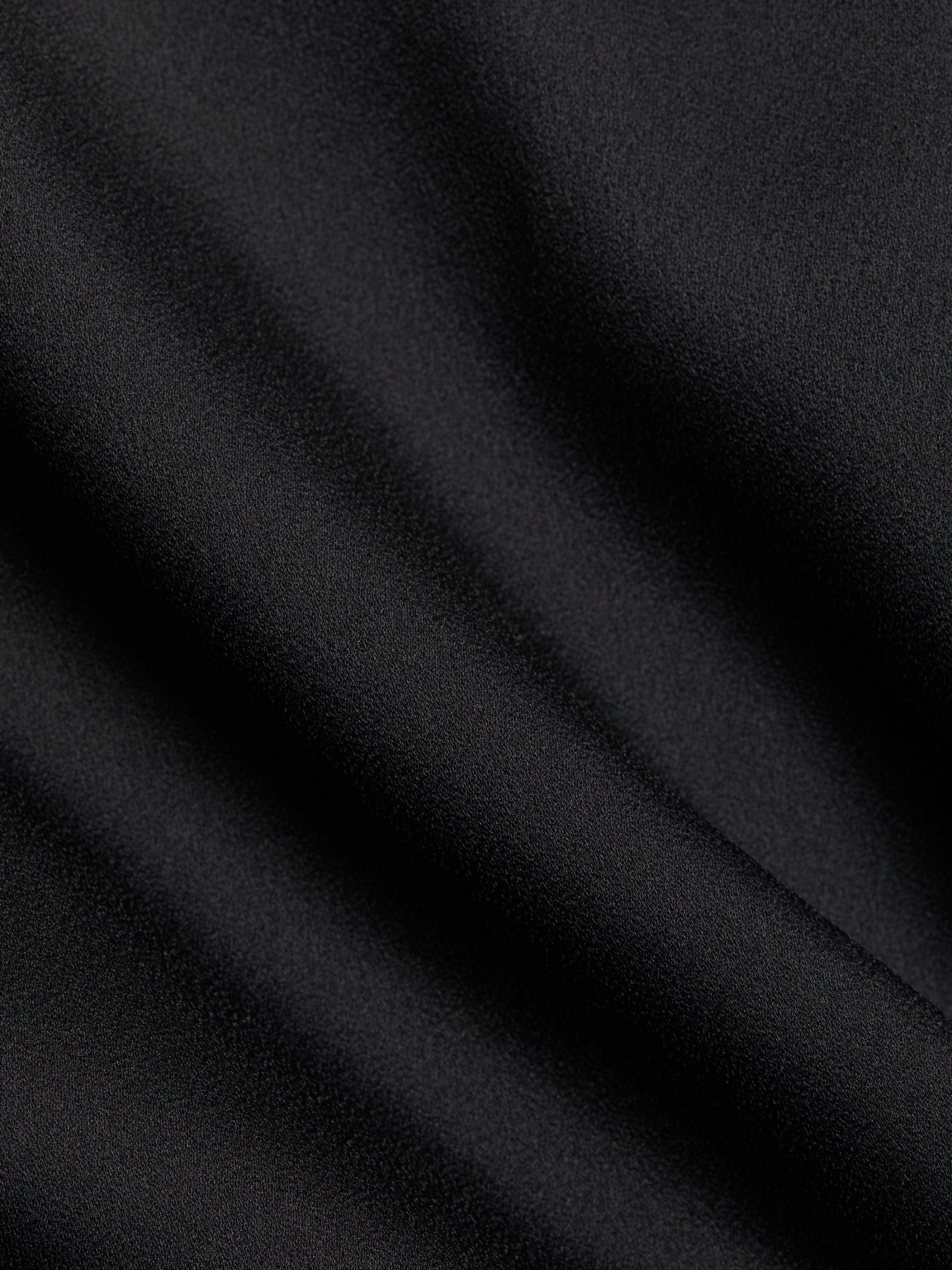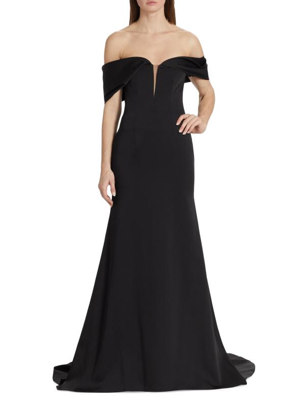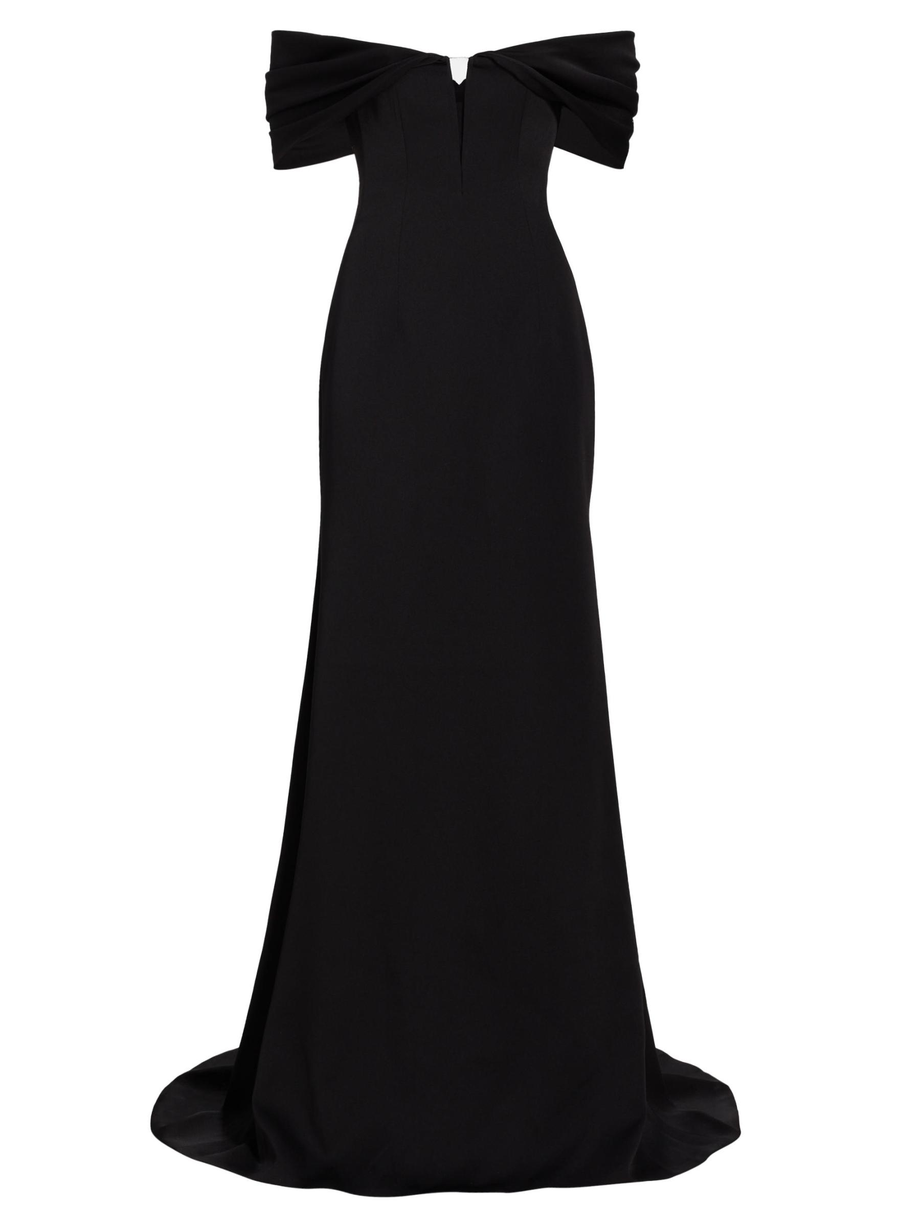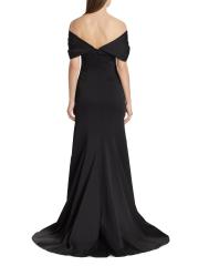 فستان OZGUR MASUR مكشوف الكتفين مصنوع من كريب الساتين. يتميز هذا الطراز الأنيق بأكمام منفوخة منسدلة وعظام داخلية عند الصدّار وحافة خلفية.