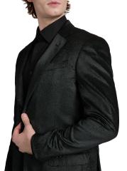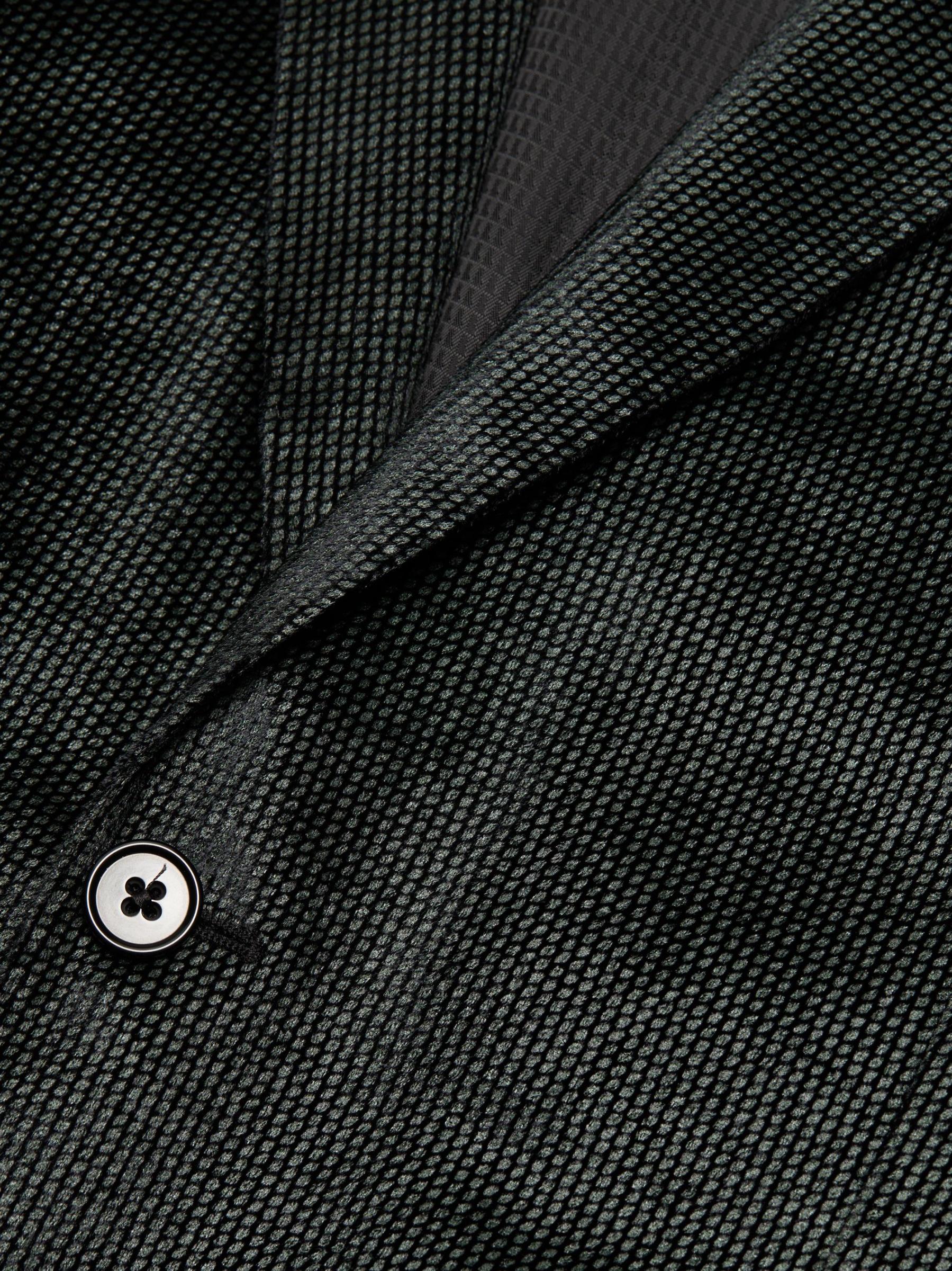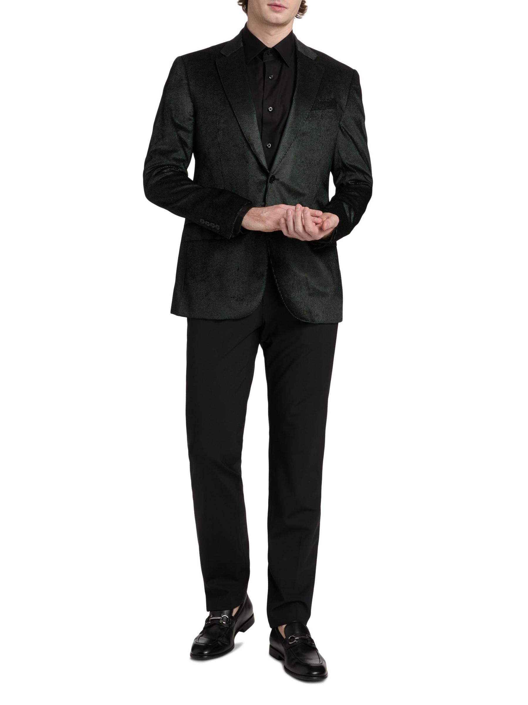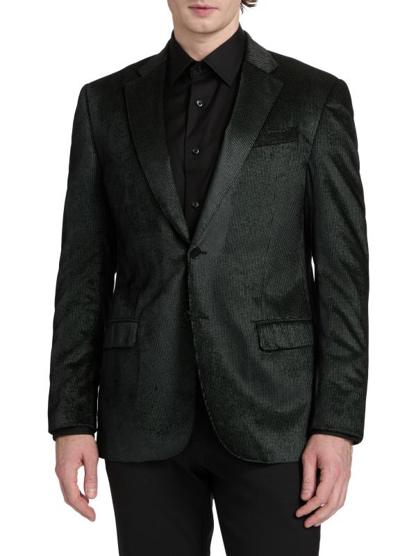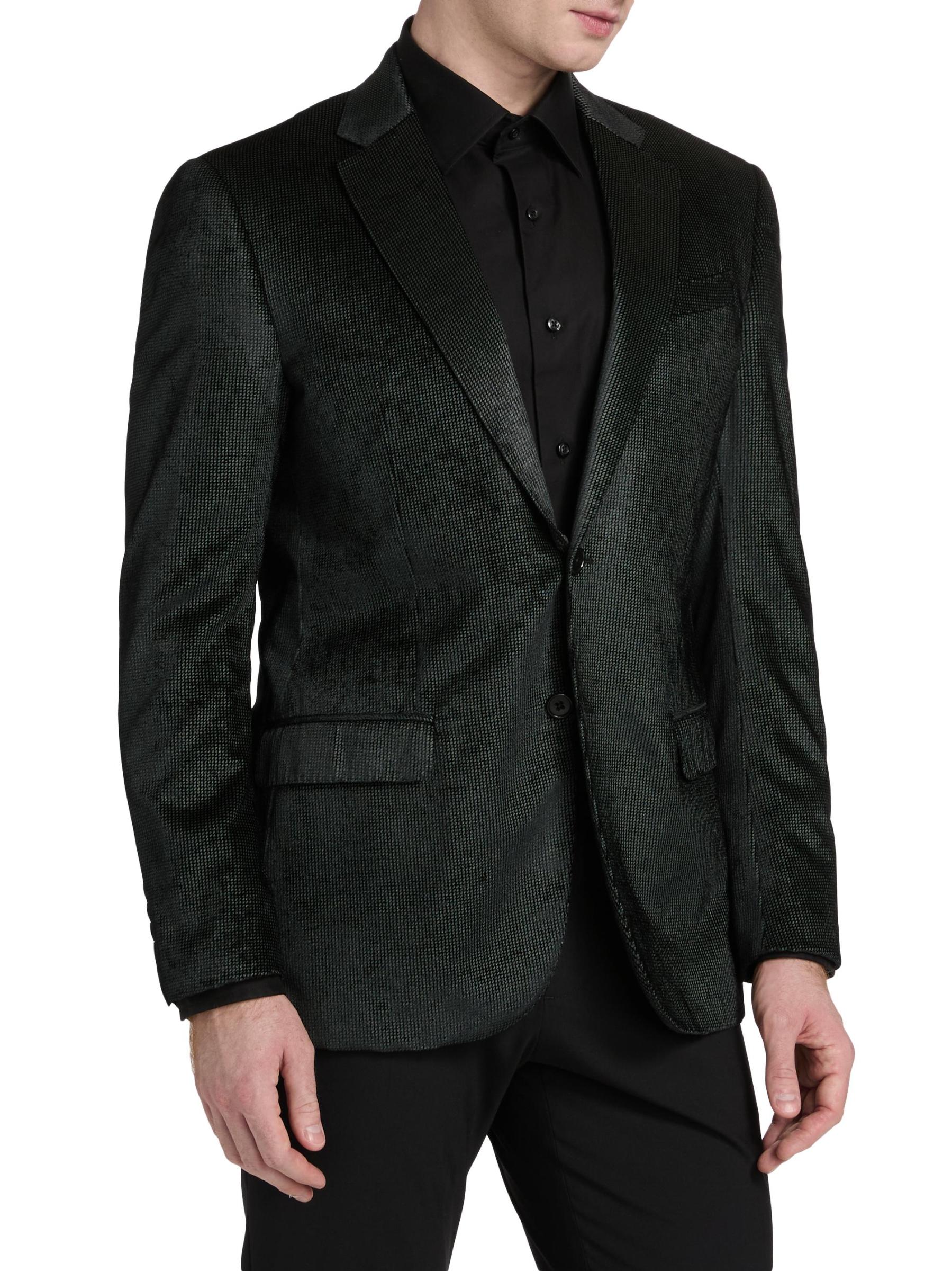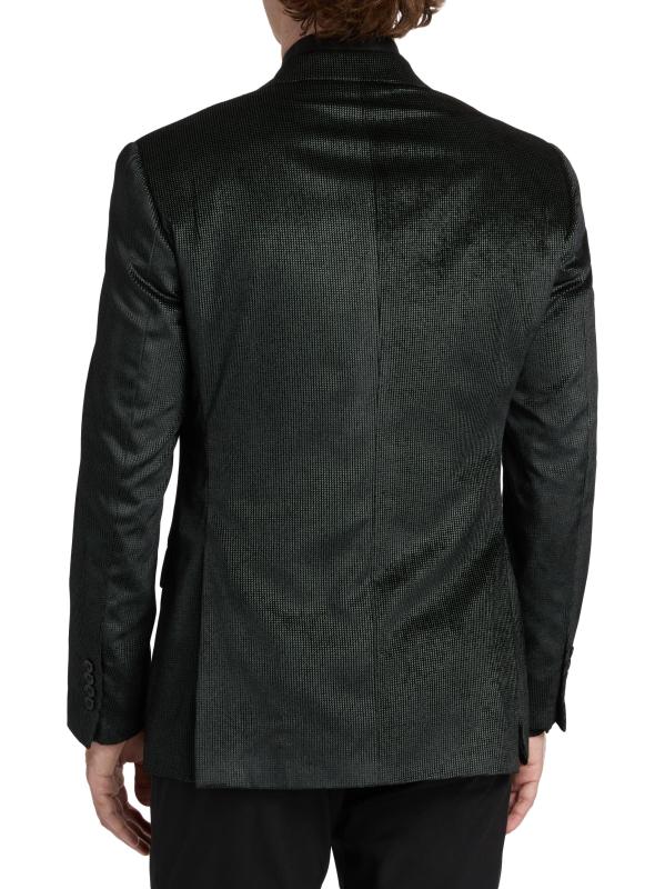 تم تعزيز جاكيت العشاء التقليدي من Emporio Armani بلمسة نهائية لامعة من الساتان ونسج معقد يشبه الشبكة. تتميز هذه القطعة المصممة بتصميم أحادي الصدر بطيات مشقوقة وجيب على الصدر وجيوب جانبية قابلة للطي.