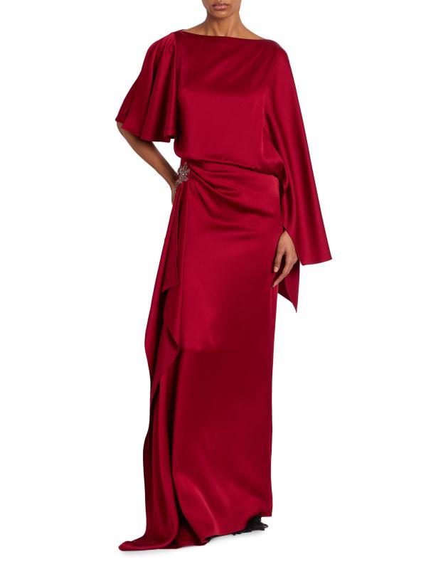 يتميز فستان Erdem المزركش المصنوع من الساتان الفاخر بزخرفة مزخرفة على الورك وصدّار بلوسون وأكمام مختلطة الطول.