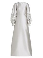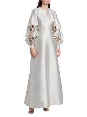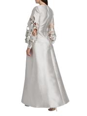 يتميّز فستان ريم أكرا المذهل والمناسب والمشرق بلون الساتان اللامع، ويزيّن الصورة الظلية بأكمام مطرزة مزيّنة بنقوش مزهّرة. يتميز هذا التصميم الملكي برقبة دائرية خالدة ودرزات الأميرة وجيوب على الدرز.