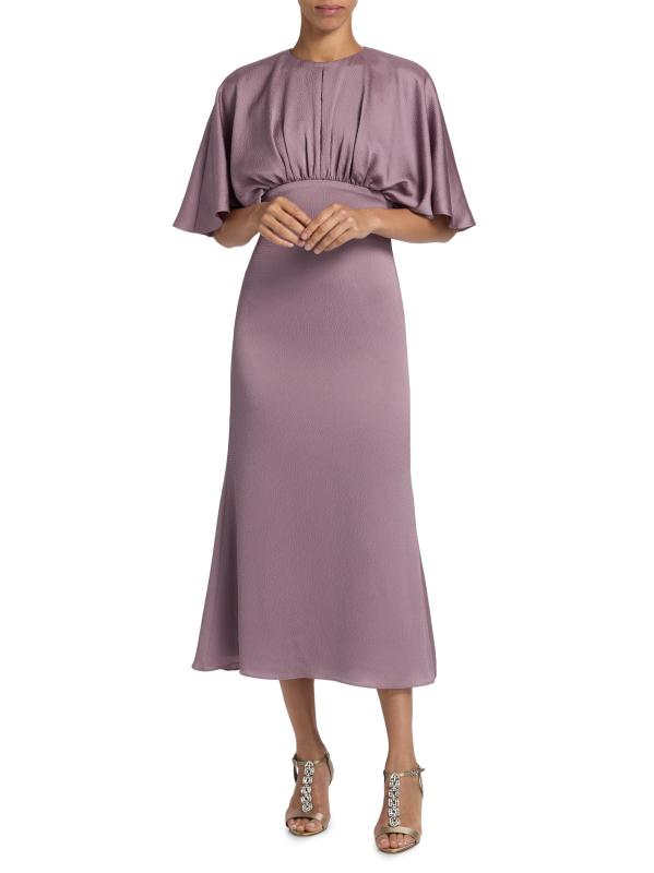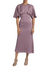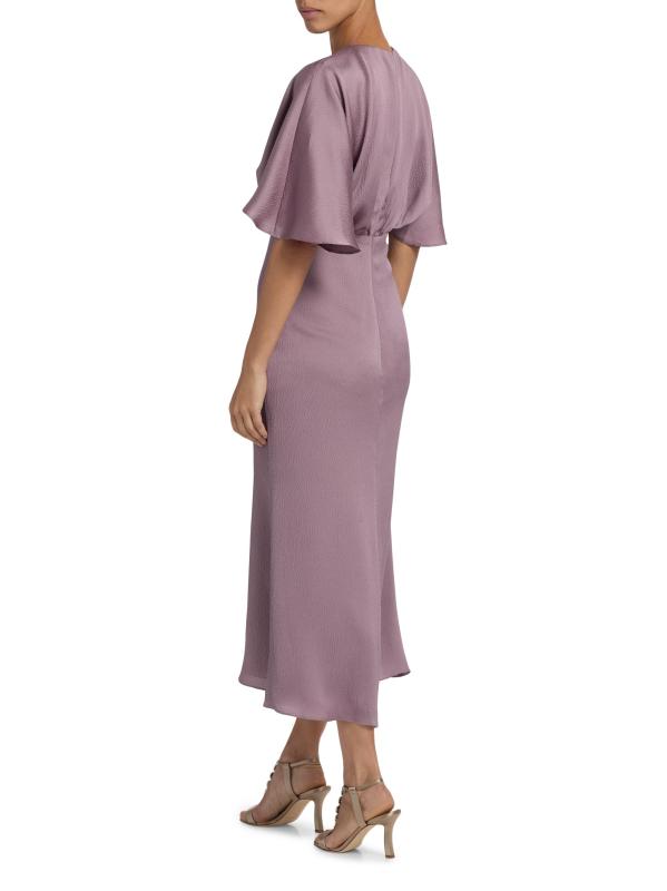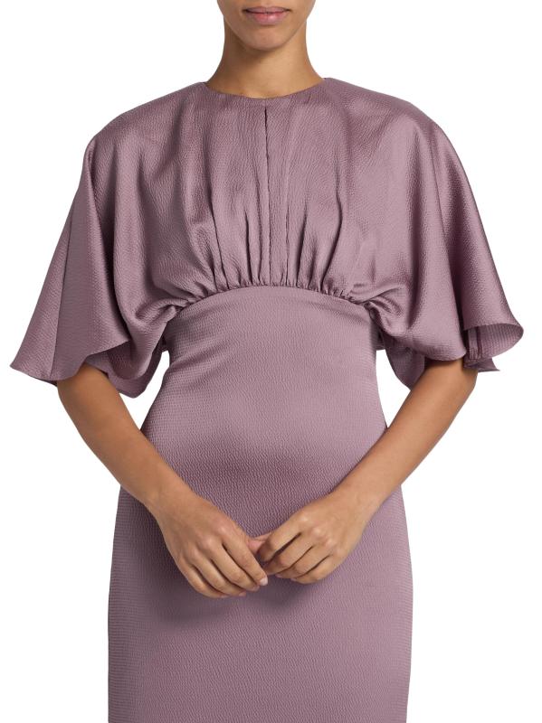 يتميز فستان Amsale المتوسط هذا المصنوع من الساتان برقبة مستديرة وصدّار مجمّع وأكمام رفرفة بطول الكوع.