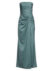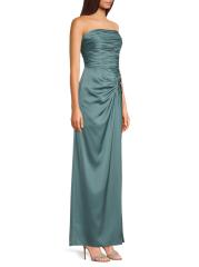 يُضفي هذا الفستان بدون حمالات من Aidan Mattox، المصنوع من الساتان المدعم بالكريب، طابعًا مميزًا على شكل العمود من خلال صدّار مكشكش وخصر صغير ملفوف مزين بحلقة على شكل حرف O.