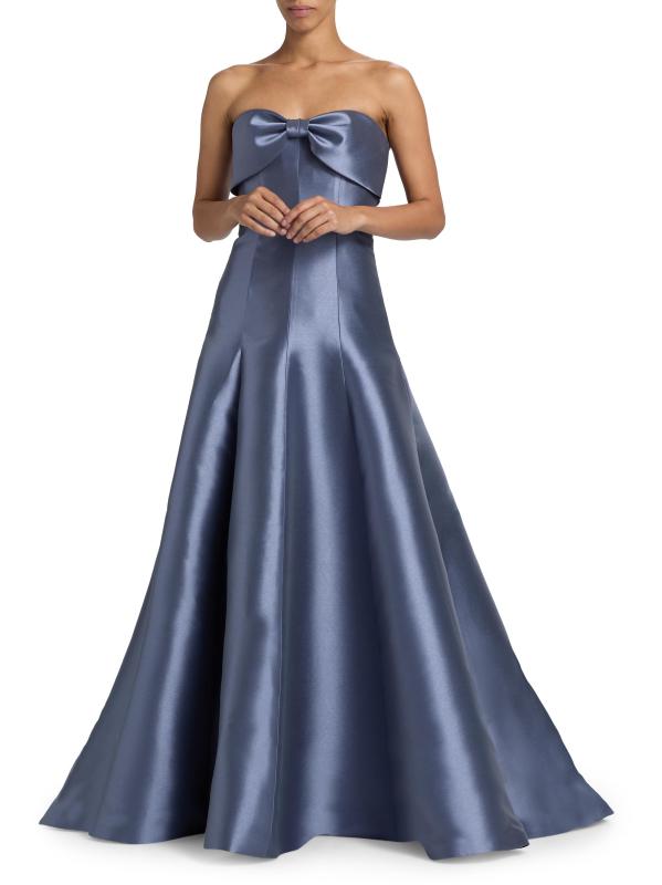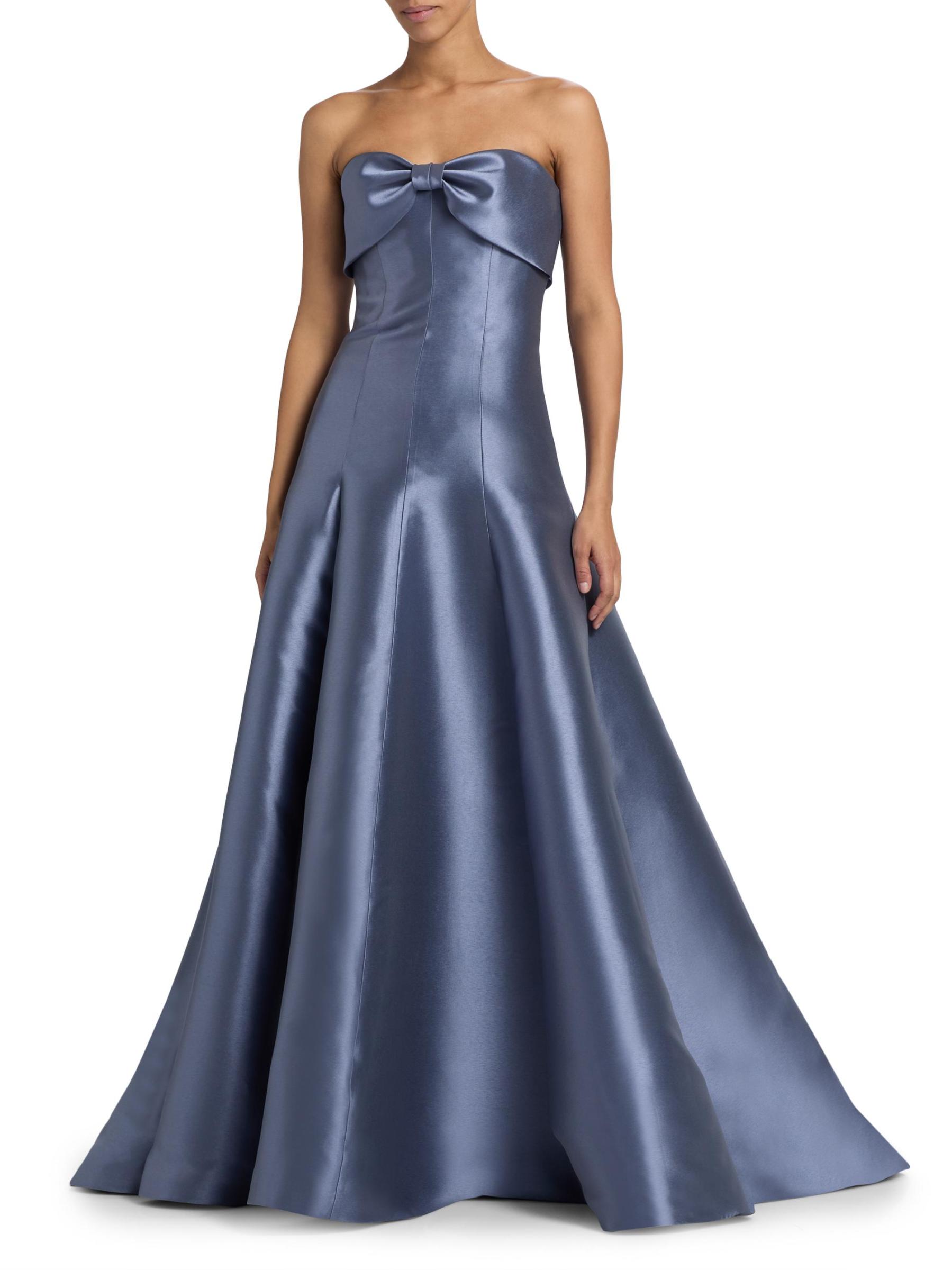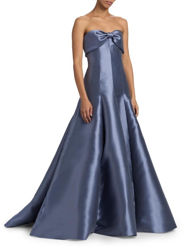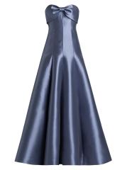 صُنع فستان Amsale هذا من الساتان اللامع، مع تقويرة بدون حمالات.