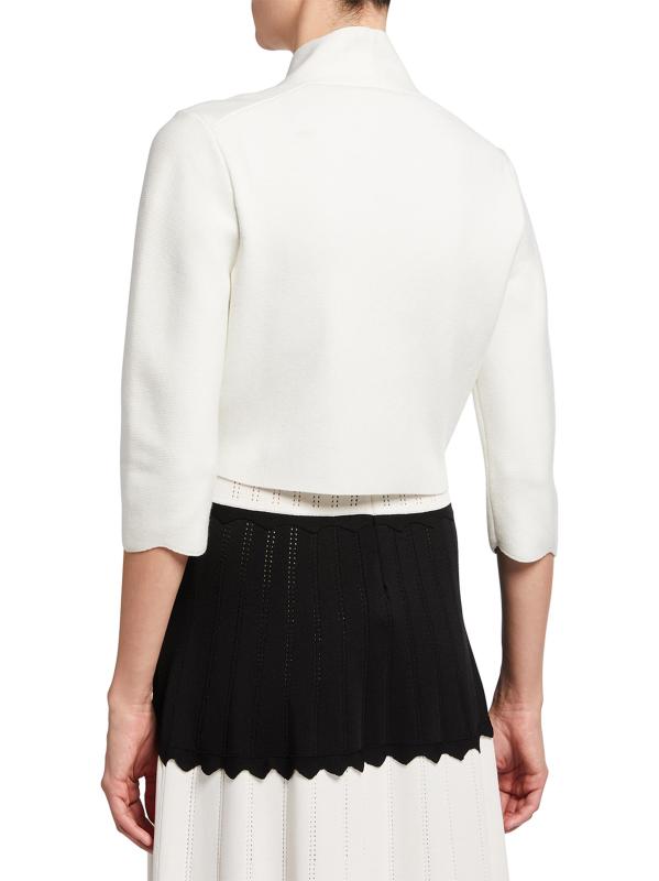 تضيف الحافة الصدفيّة بلطف الأنوثة إلى هذا الكارديجان المفتوح من الأمام. إن تصميمه القصير يجعله الثوب المثالي لارتدائه فوق الفستان.