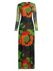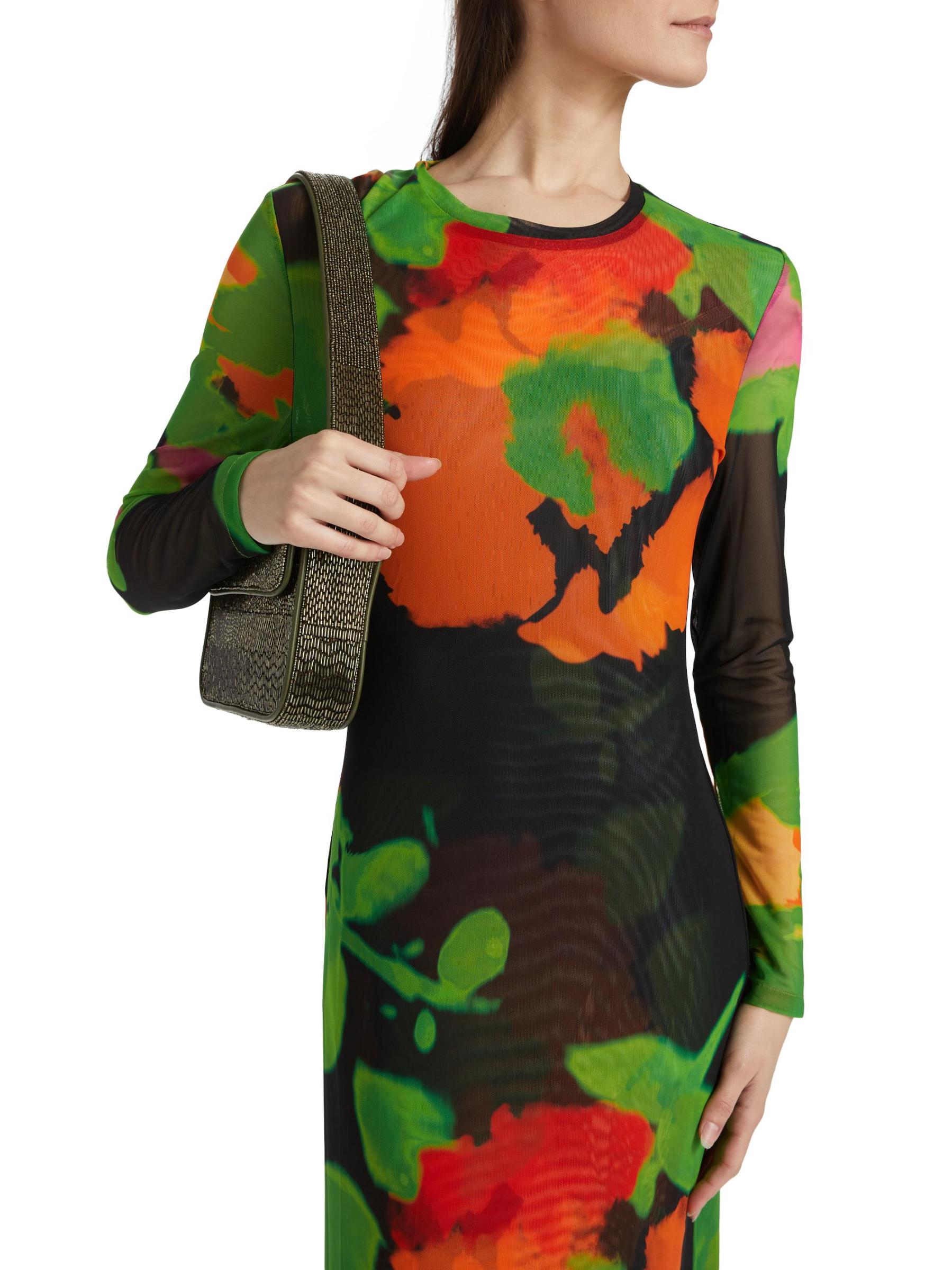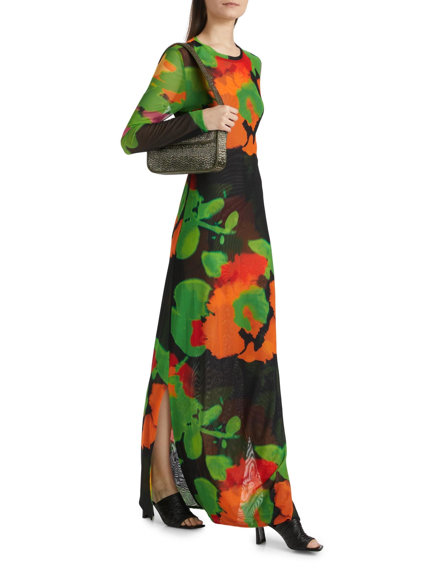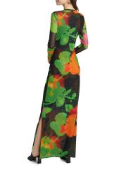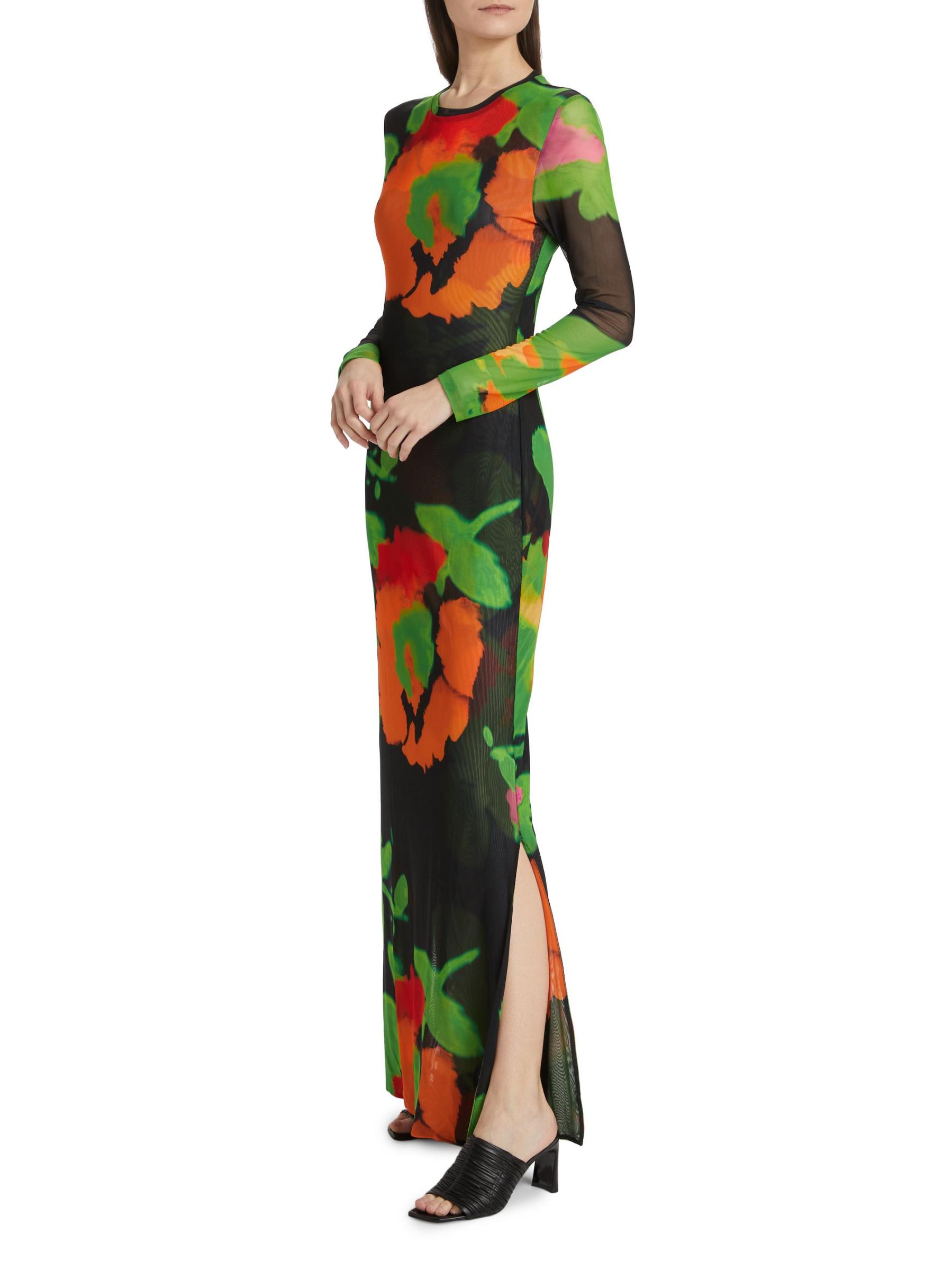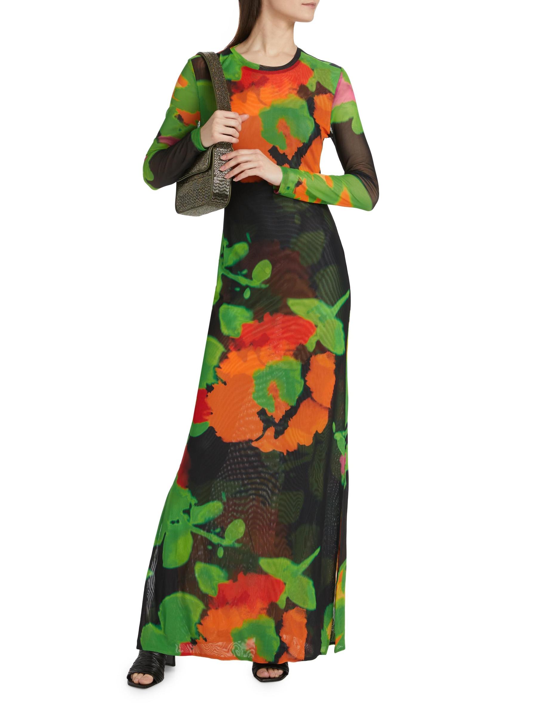 تم تصميم هذا الفستان الطويل القرمزي من Eywasouls Malibu بطبعة زهرية جريئة وأكمام طويلة وشقوق جانبية.