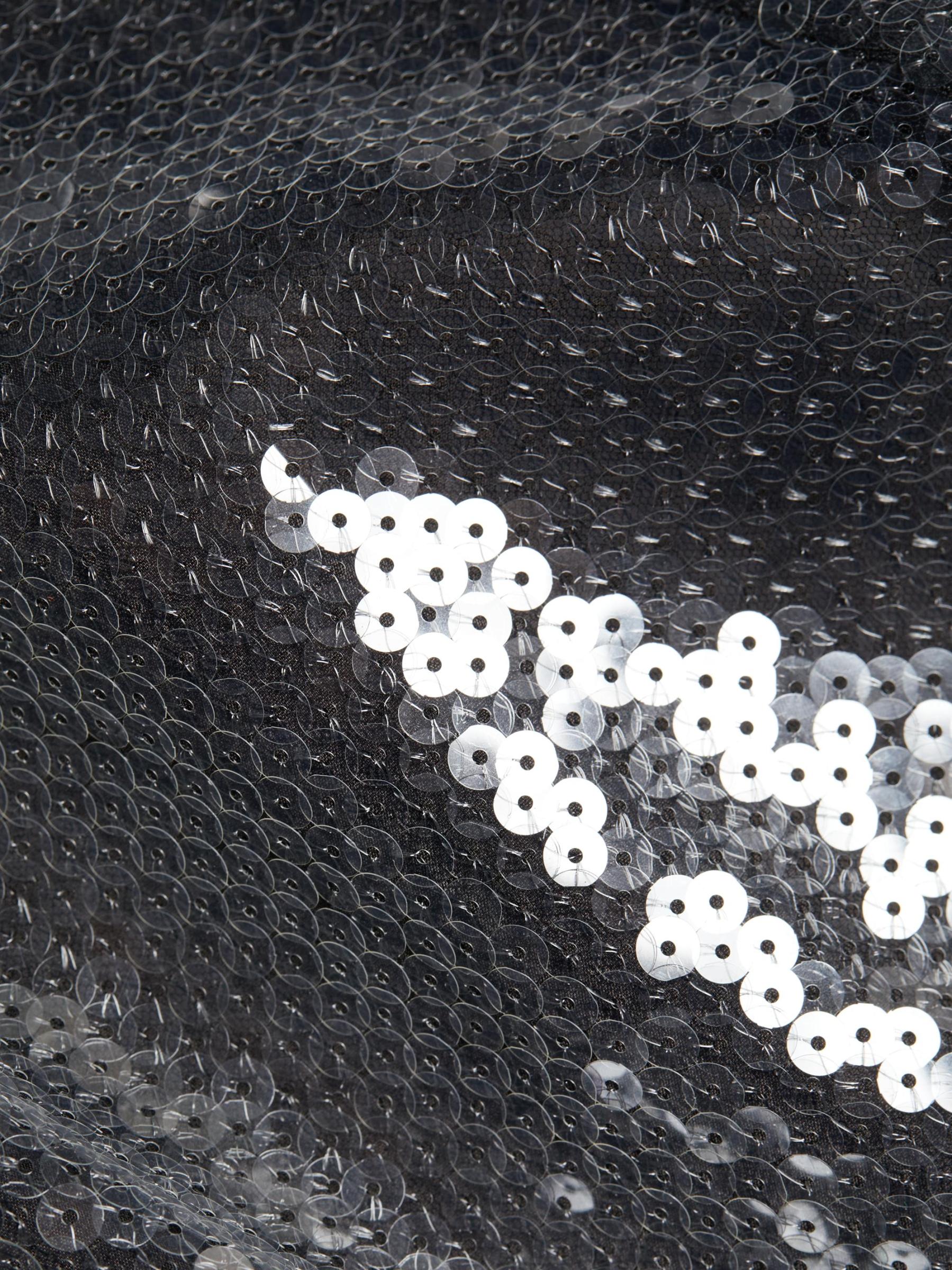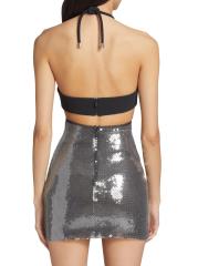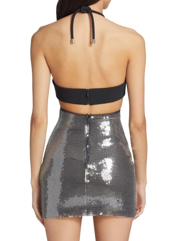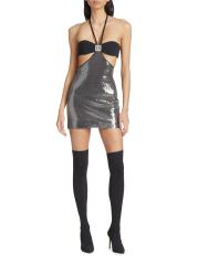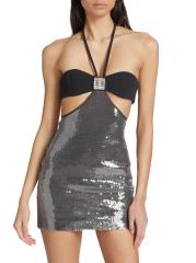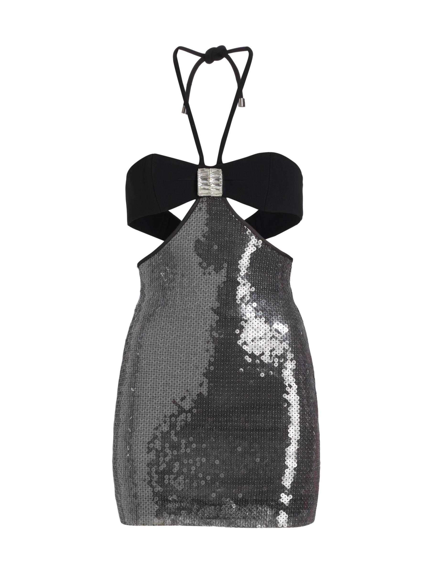 يتميّز فستان David Koma القصير الأنيق بصدّار مقصوص وتنورة ضيقة مزيّنة بالترتر.