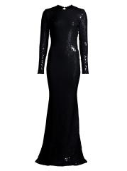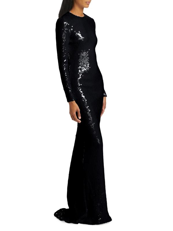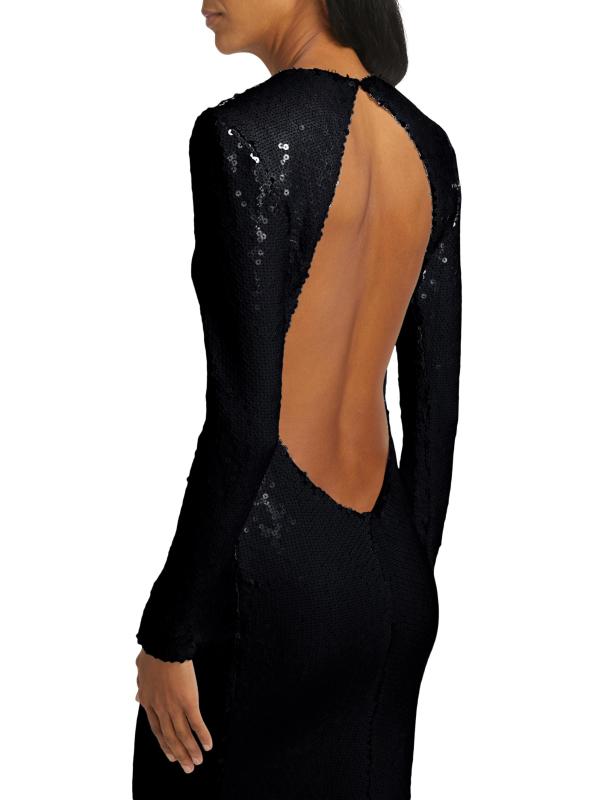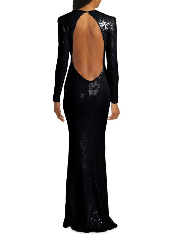 تم تزيين فستان البوق هذا ذو الأكمام الطويلة من Sergio Hudson بالترتر اللامع ويتميز بظهر مفتوح.