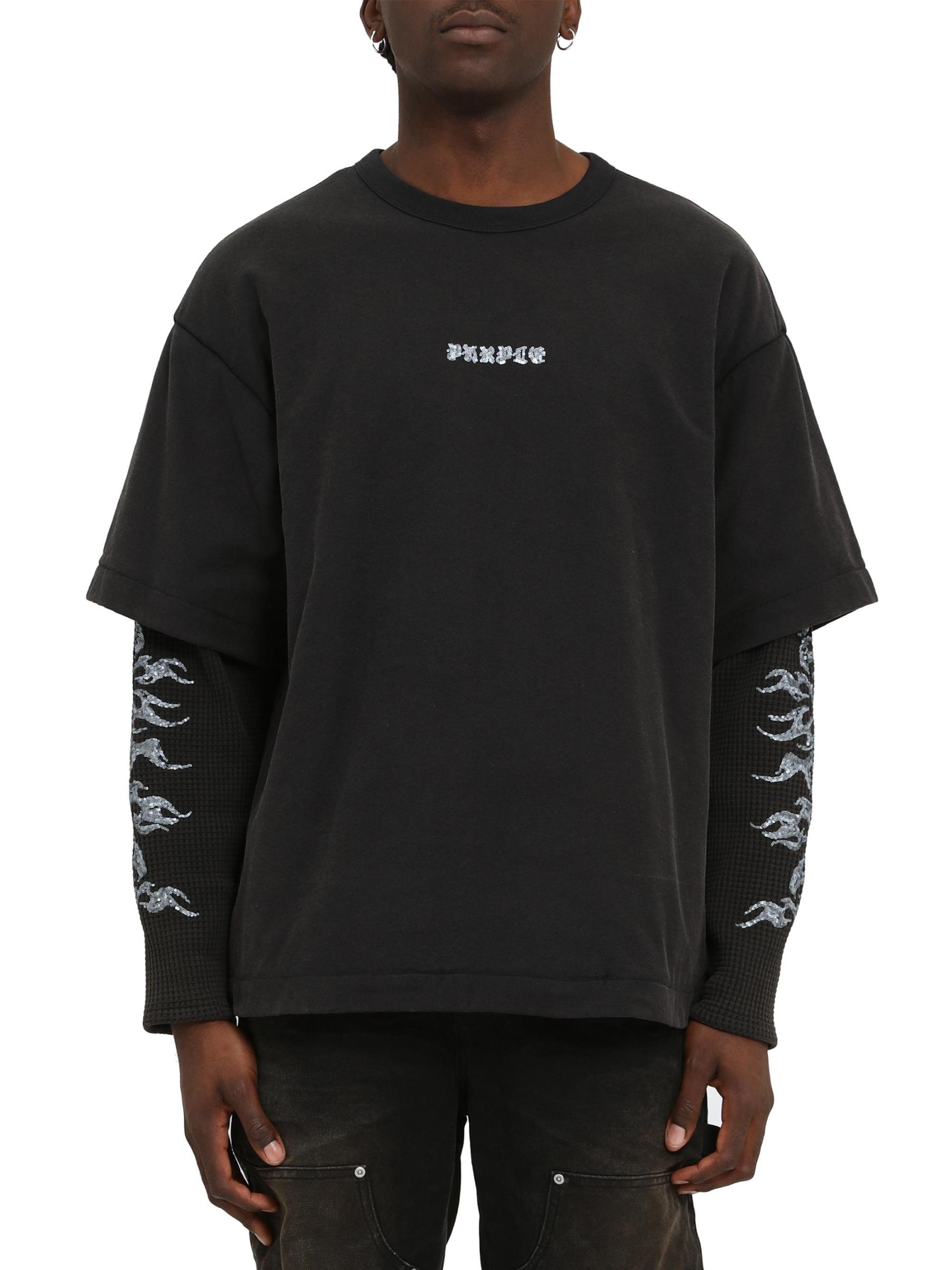 تم تصميم هذا التيشيرت ذو الحجم الكبير من Purple Brand بأكمام قصيرة على نمط وافل محبوك بأكمام طويلة ومزين بالترتر.