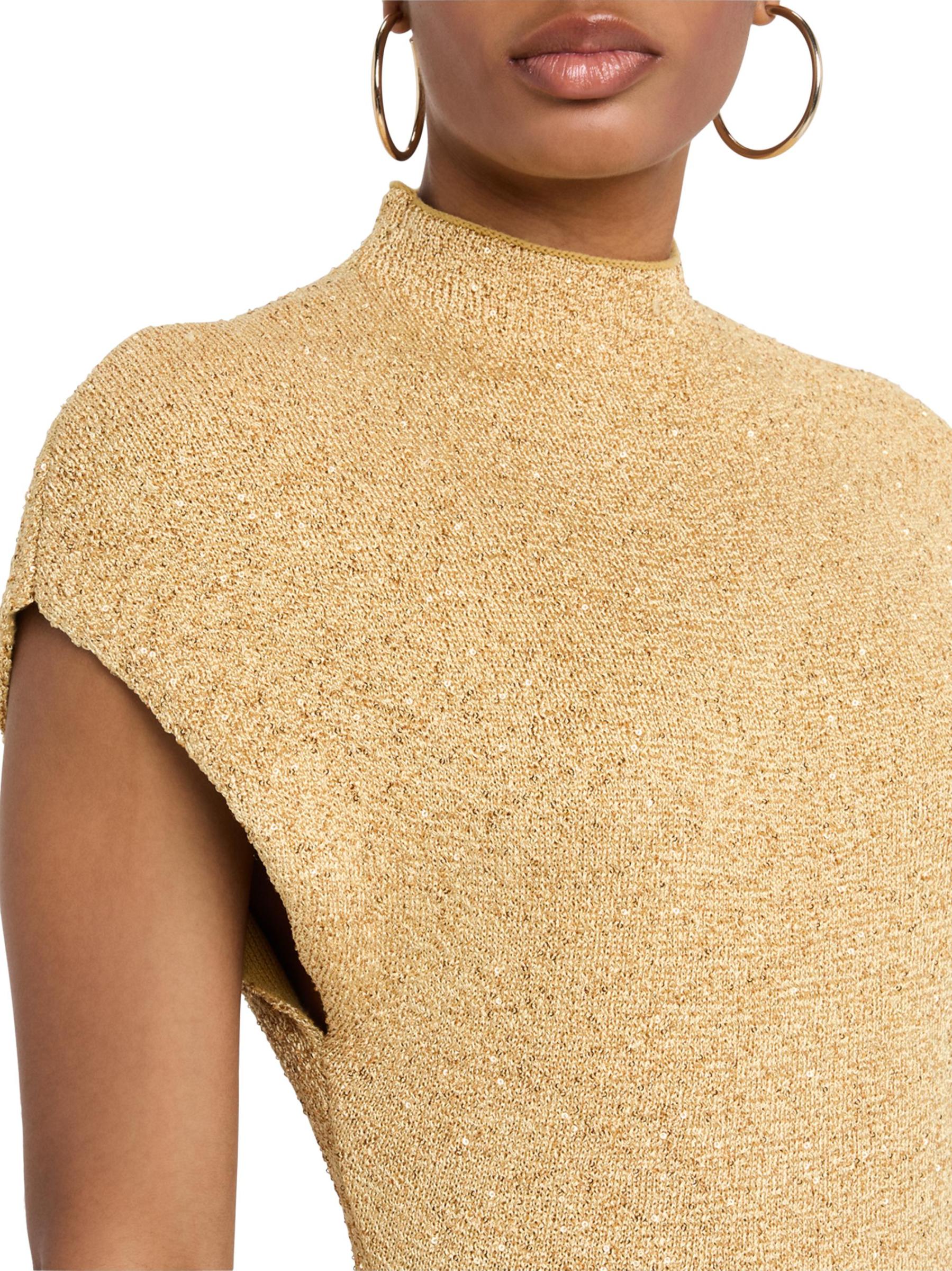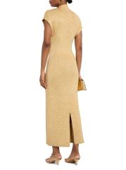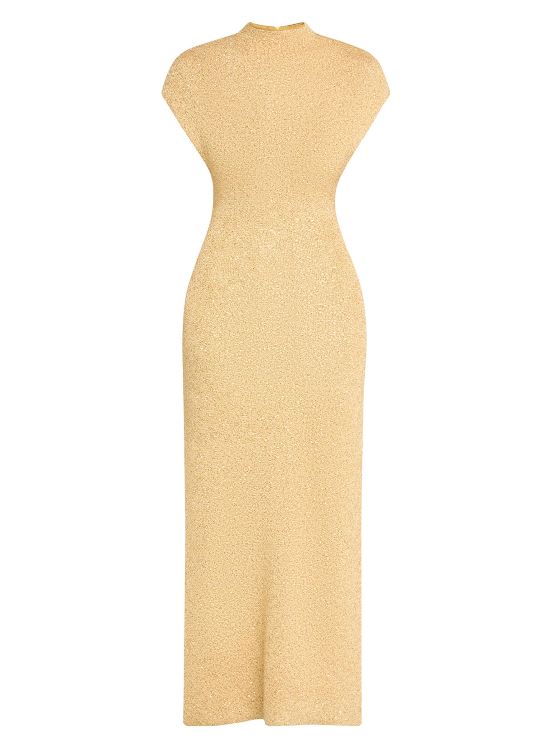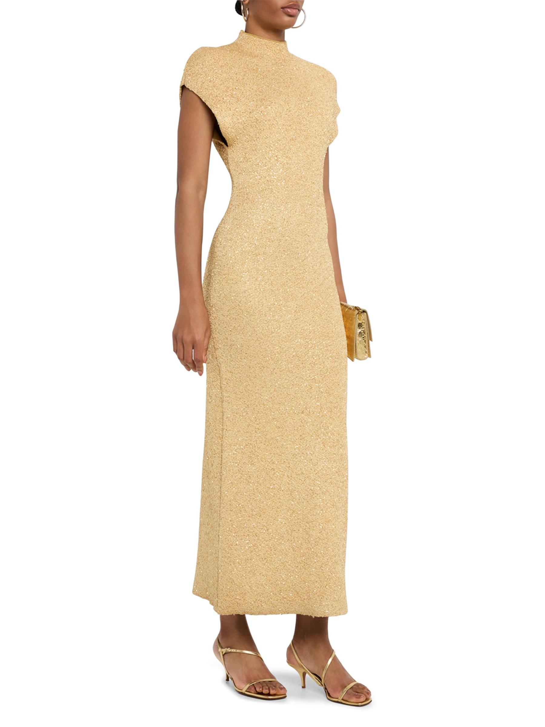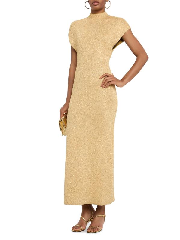 يتميز فستان Lela Rose الطويل المحبوك والمزين بالترتر بياقة مدورة عصرية وأكمام قصيرة تكمله صورة ظلية أنيقة للجسم.