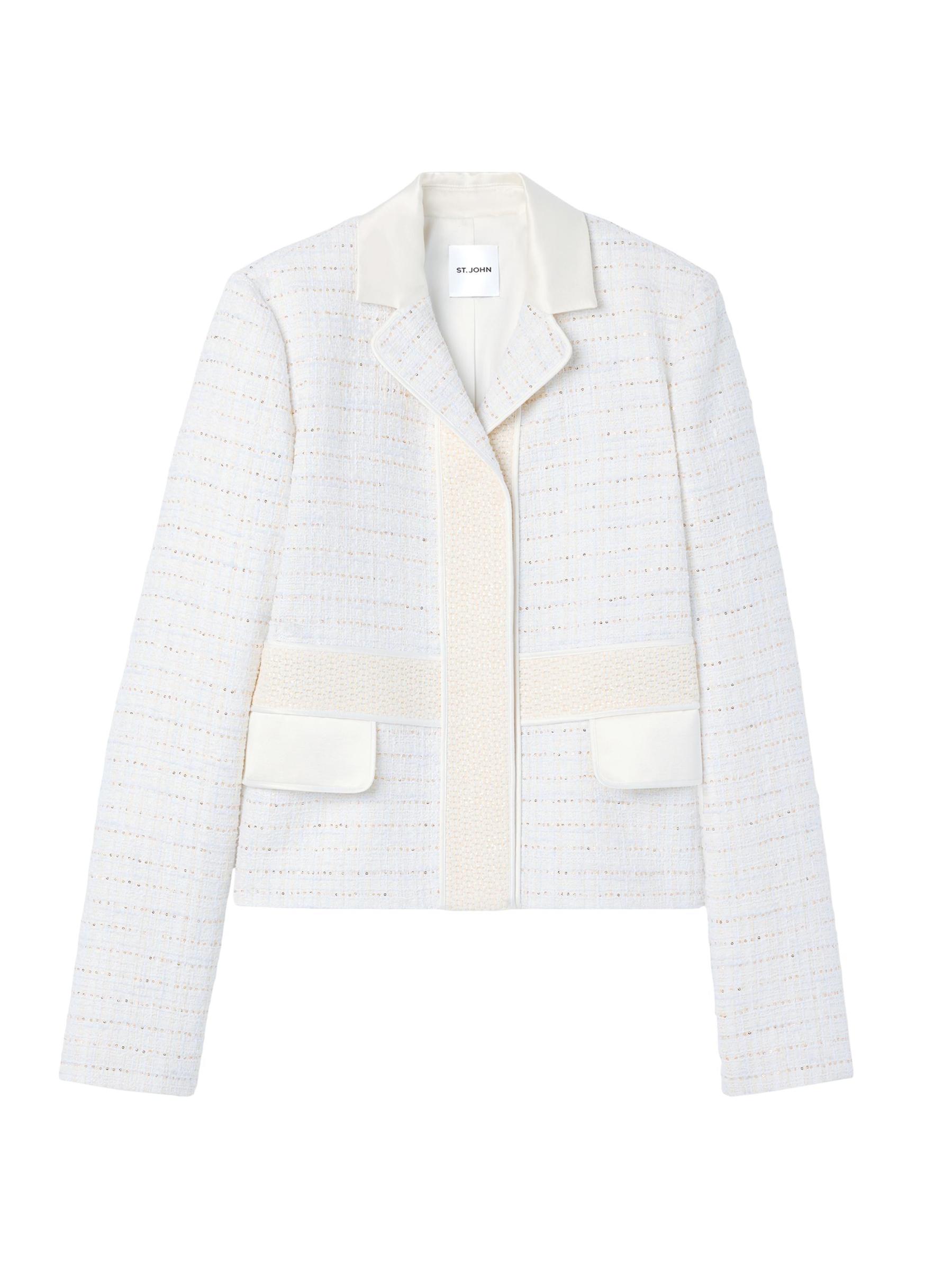 من مجموعة المساء. يُضفي الجاكيت المصنوع من التويد المطرّز خفيف الوزن من سانت جونز جوًا من الرقي السهل، ويُظهر الاهتمام الدقيق بالتفاصيل ومزيجًا جذابًا من القوام.