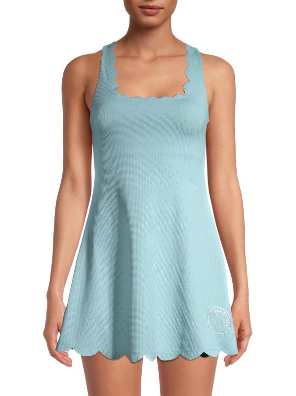 يكتمل هذا الفستان القصير المحبوك بزخرفة الإسكالوب مع شورت مدمج وتطريز العلامة التجارية على الحافة الأمامية.