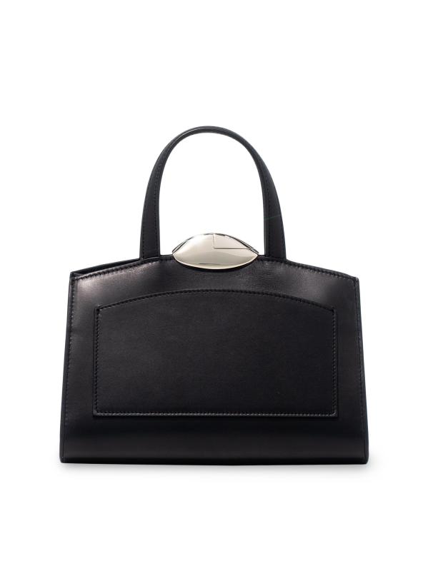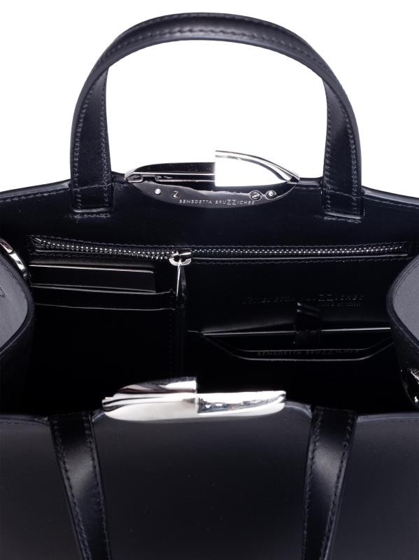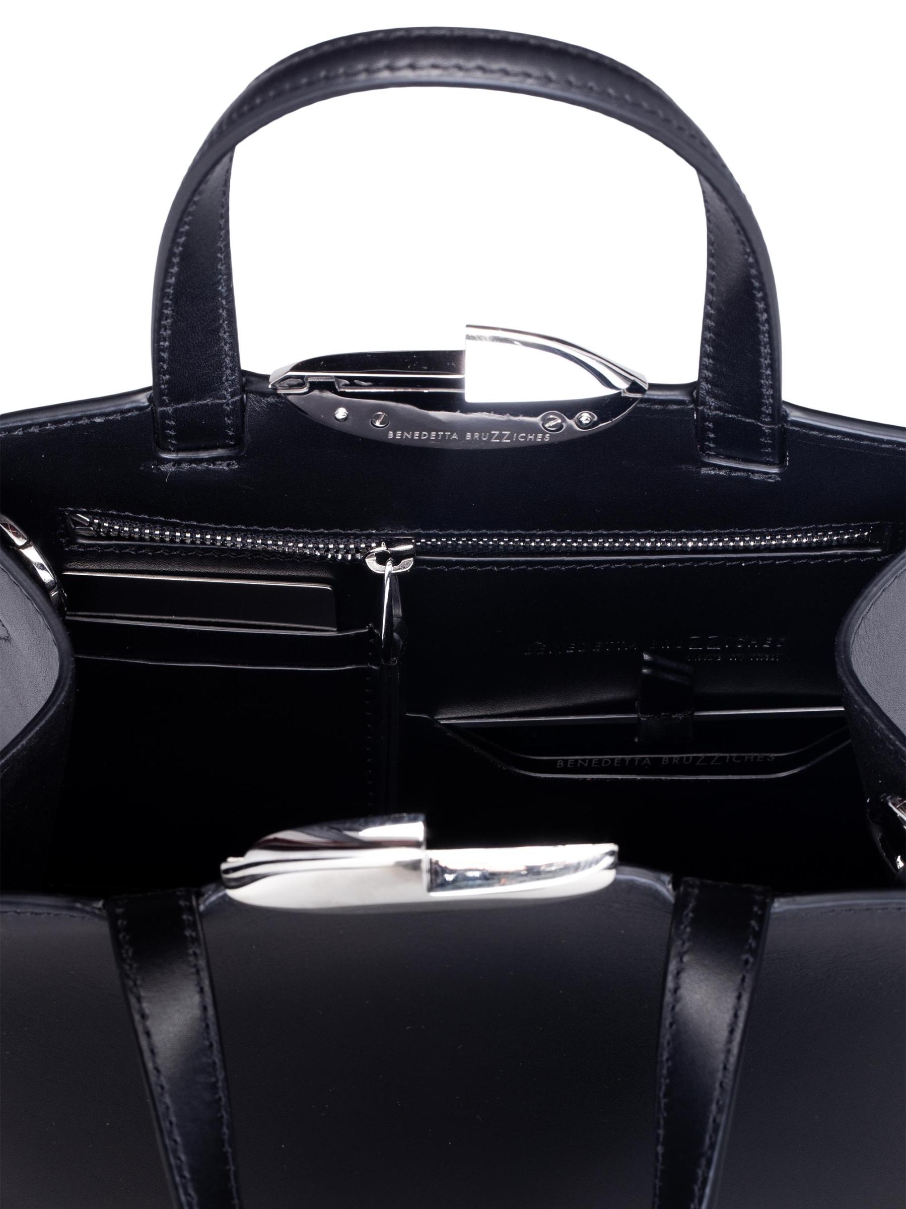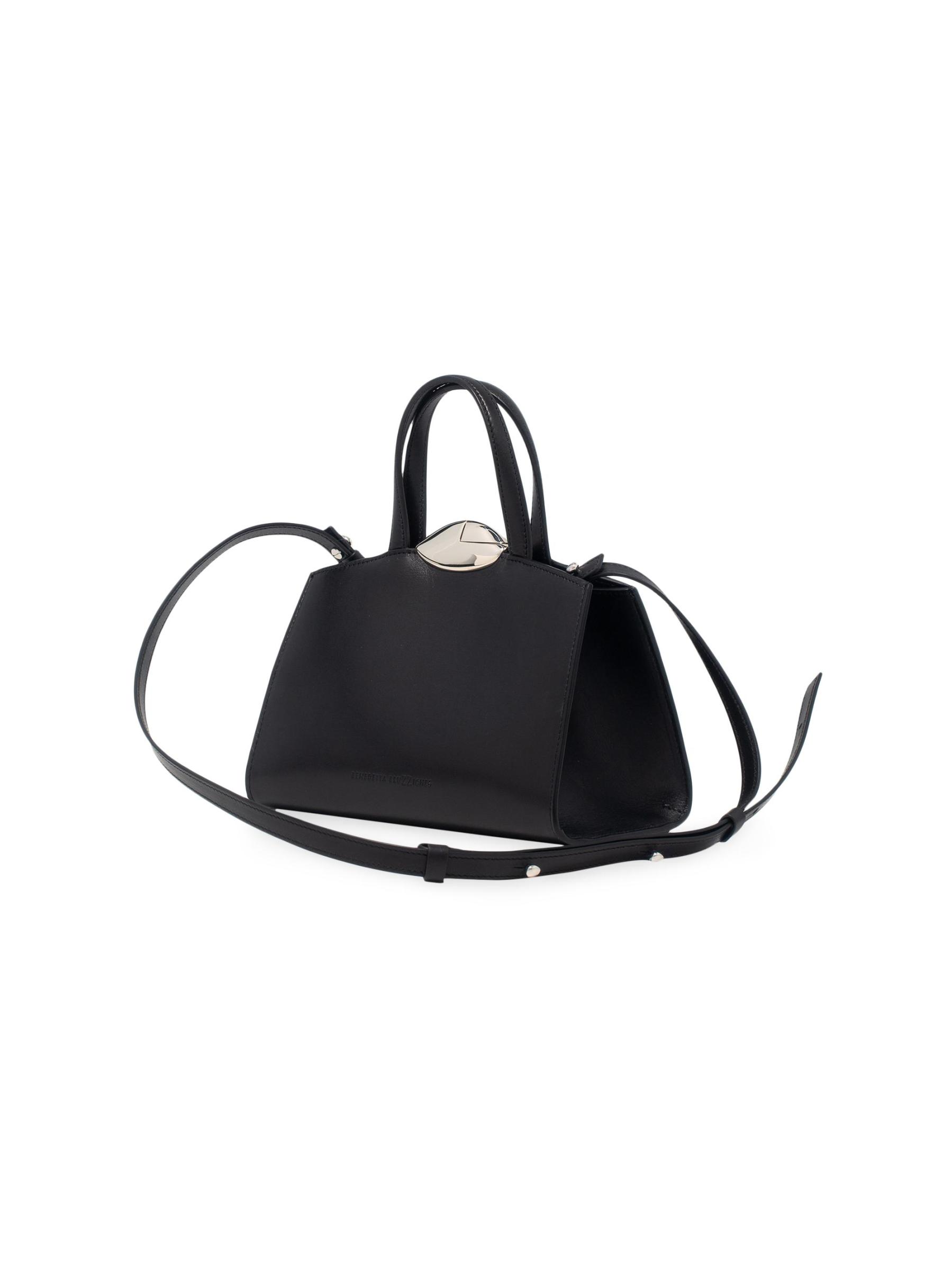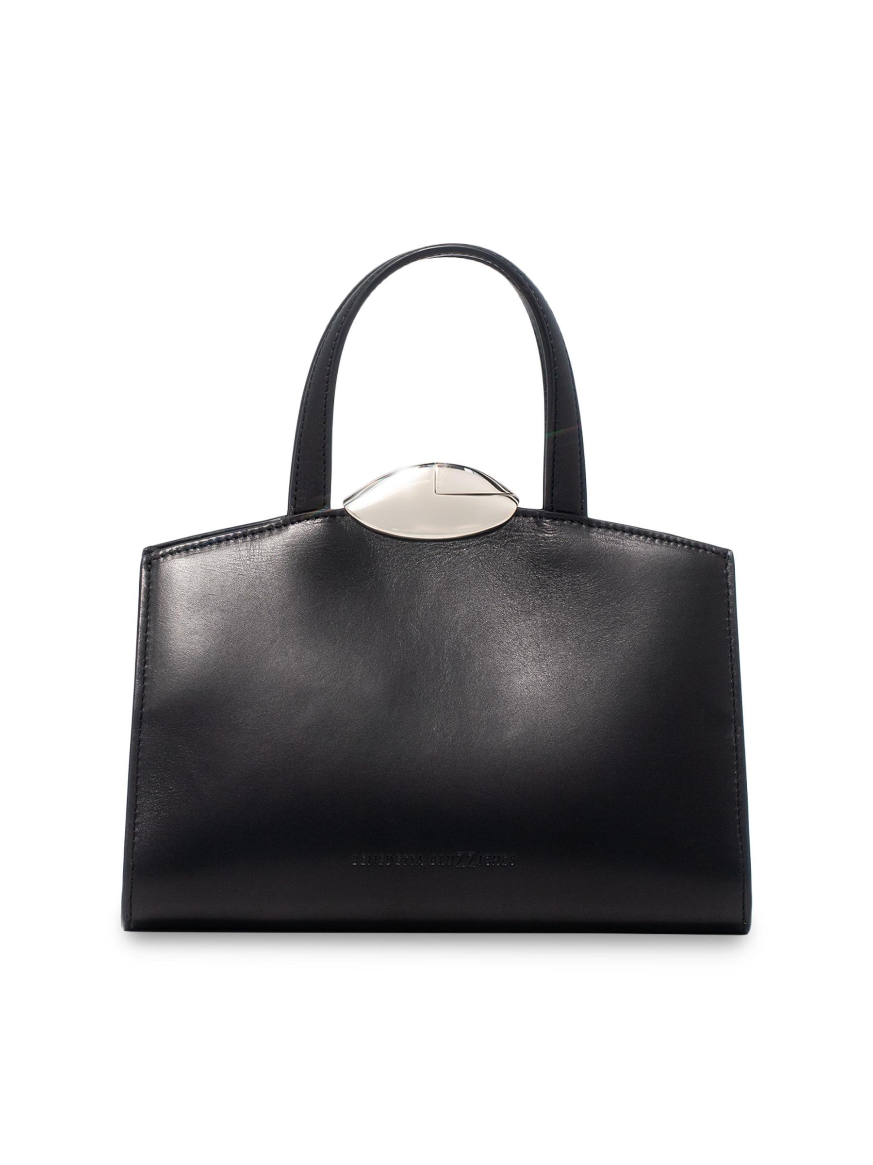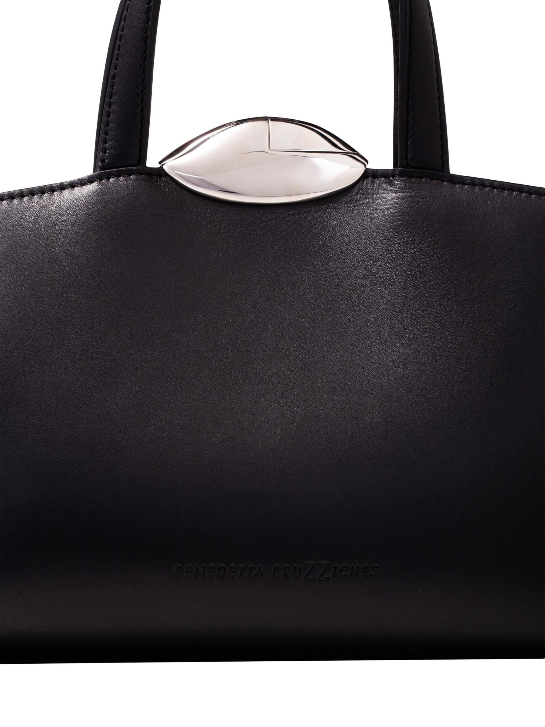 حقيبة Serena La Petite من Benedetta Bruzziches مصنوعة من الجلد الناعم وتتميز بإغلاق مغناطيسي باللون الفضي وشعار منقوش.