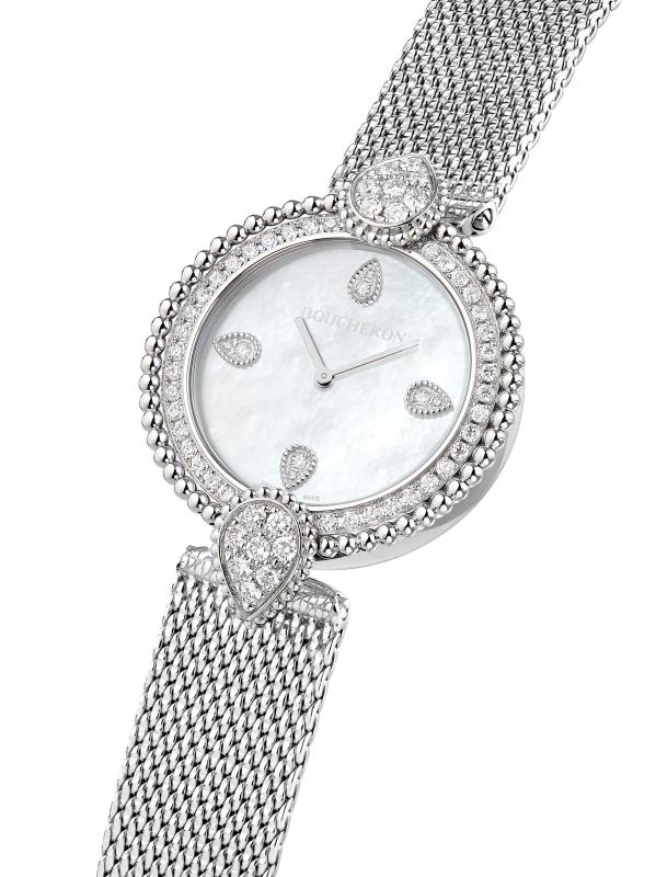 من مجموعة سيربنت بوهيم. تتميّز هذه الساعة من بوشيرون بالزخارف المتدلية الأيقونية للعلامة وخطوطها المزيّنة بالخرز، وهي مصنوعة من الفولاذ المقاوم للصدأ والمرصّع بأحجار الماس المتلألئة. يُكمل قرص أبيض مضيء من عرق اللؤلؤ هذه الساعة الرائعة.