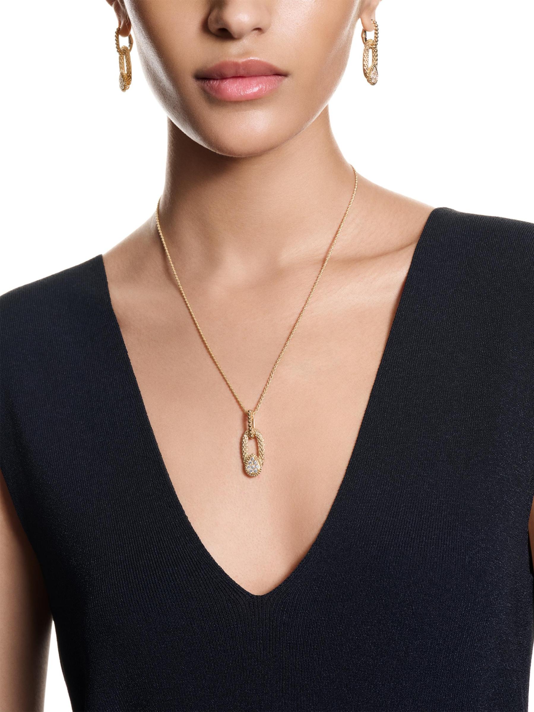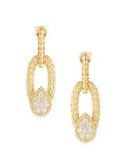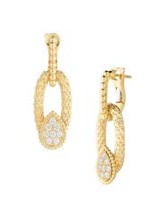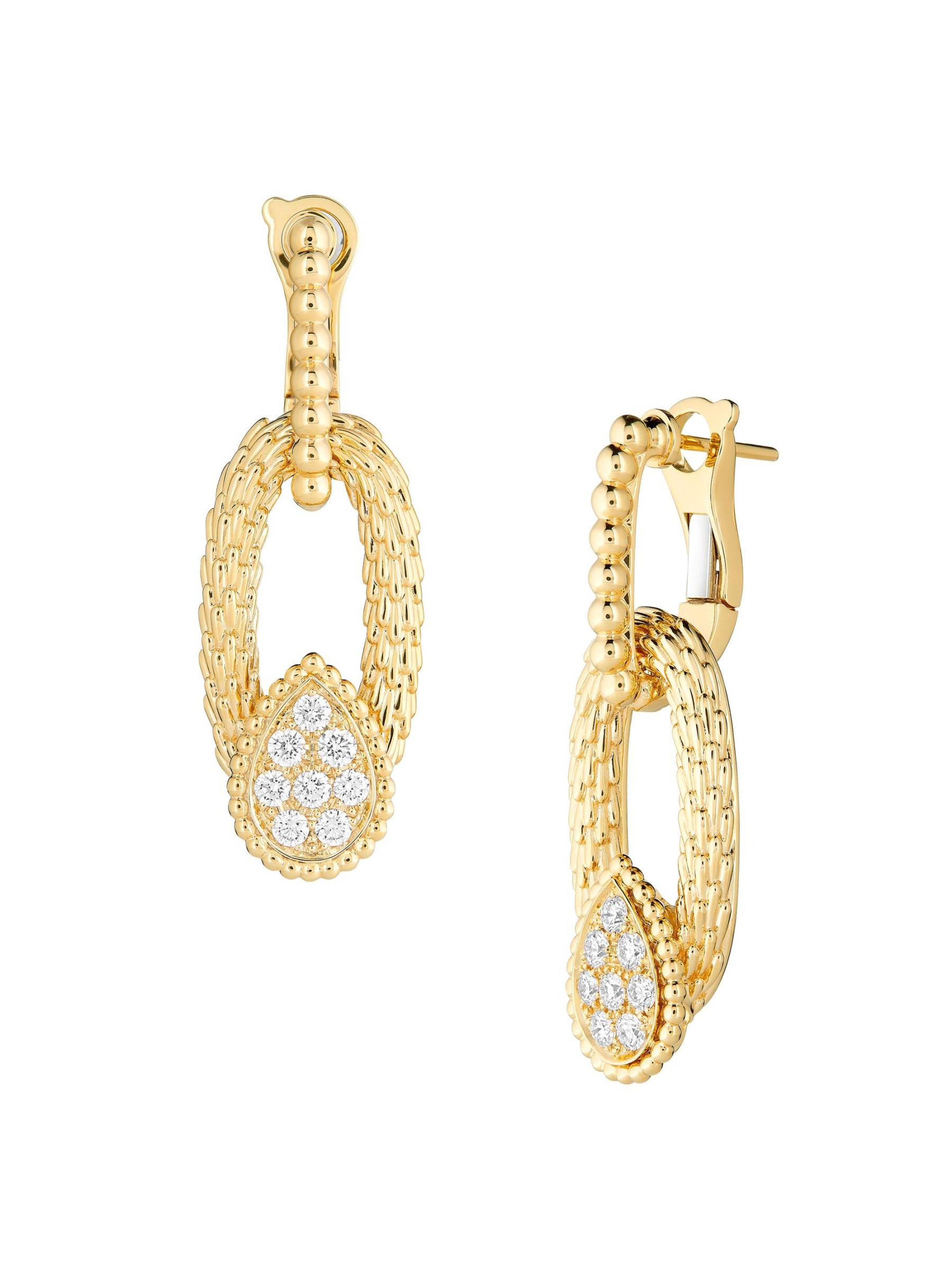 من مجموعة سيربنت بوهيم. تتميّز هذه الأقراط المصنوعة من الذهب الأصفر عيار 18 قيراطًا من بوشيرون بنقشات بيضاوية مزخرفة مستوحاة من قشور الأفعى. تُكمل الزخارف المتدلية المميزة للعلامة والمرصعة بالألماس اللامع هذا الإكسسوار المذهل.