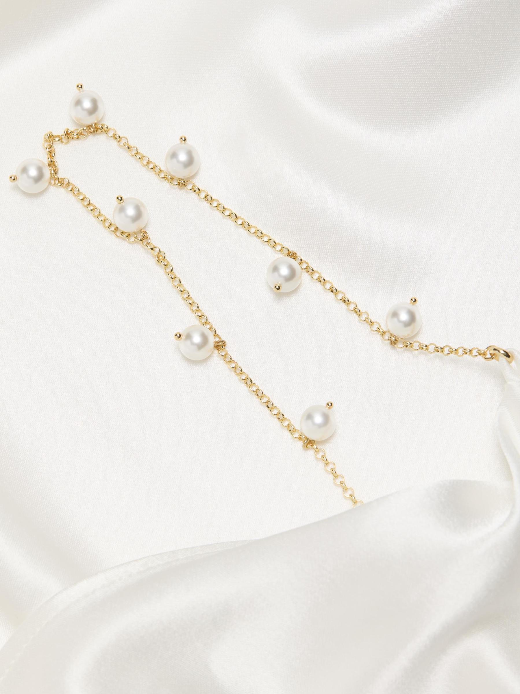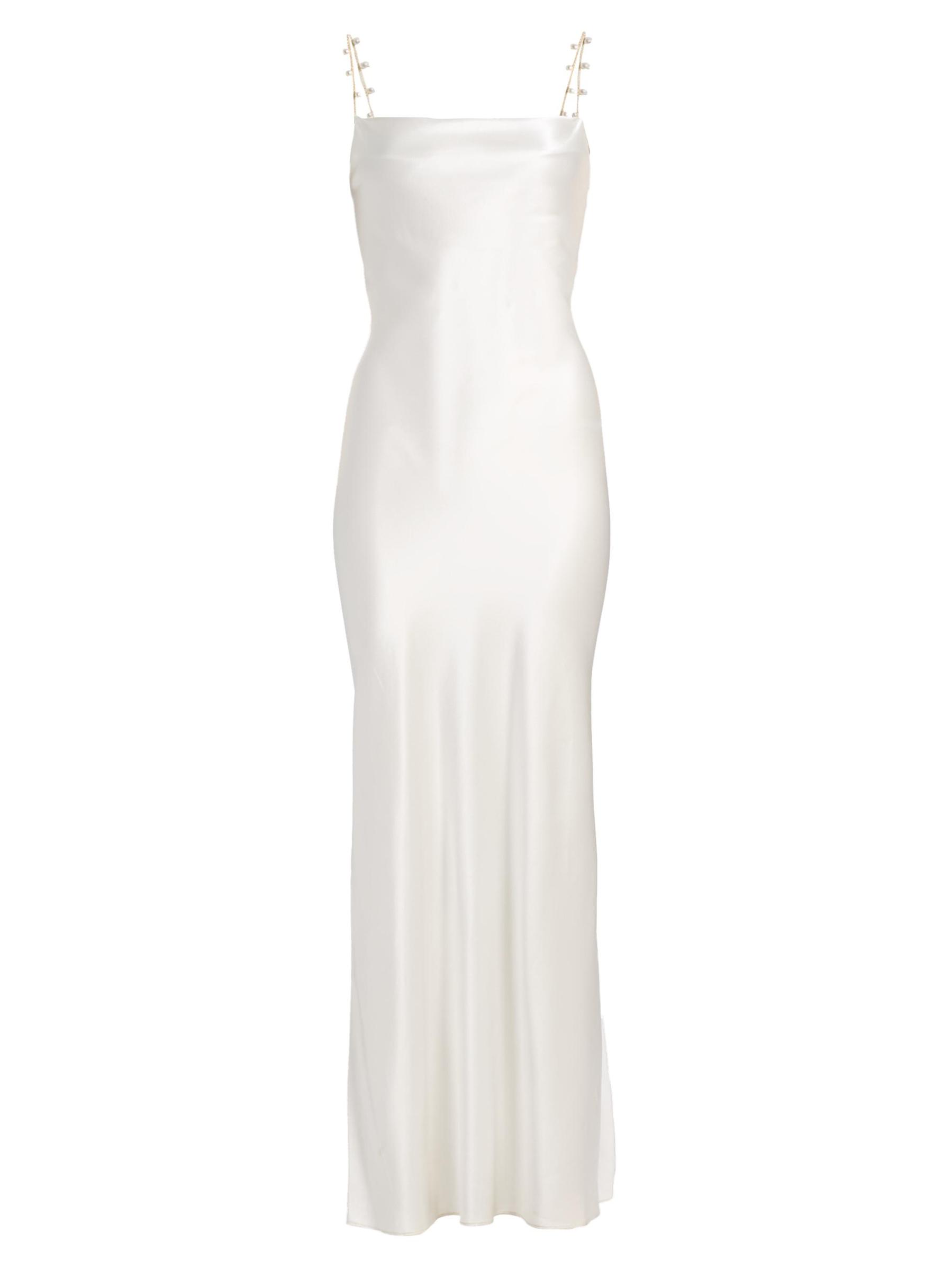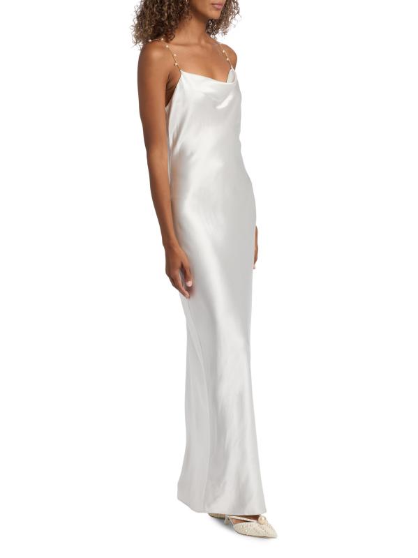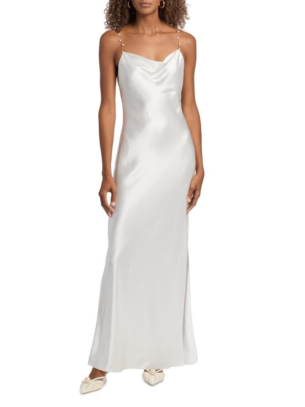 صُمم فستان Shallon سهل الارتداء هذا من Cami NYC من الحرير الفاخر برقبة على شكل قوس وأشرطة سباغيتي ذهبية اللون على شكل سلسلة مزينة باللؤلؤ الصناعي.