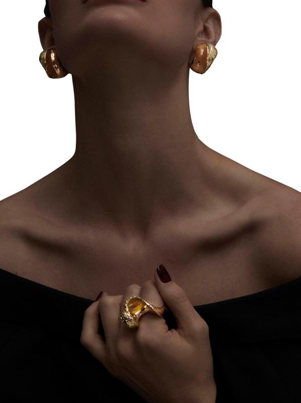 تم تصميم أقراط Shell من Demarson بشكل منحوت وتتميز بطلاء منقوش من الذهب عيار 12 قيراطًا لتعكس الضوء.