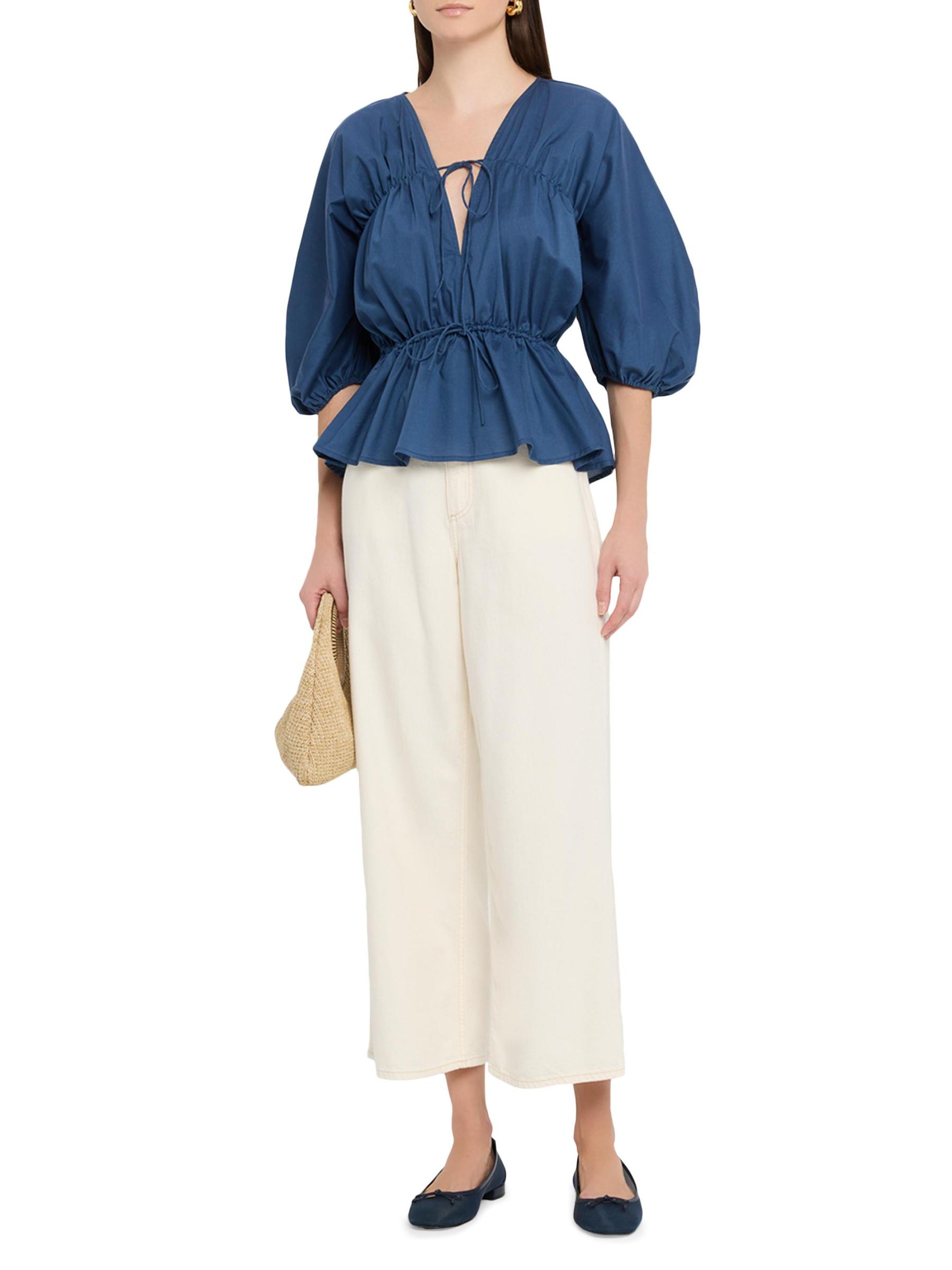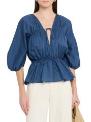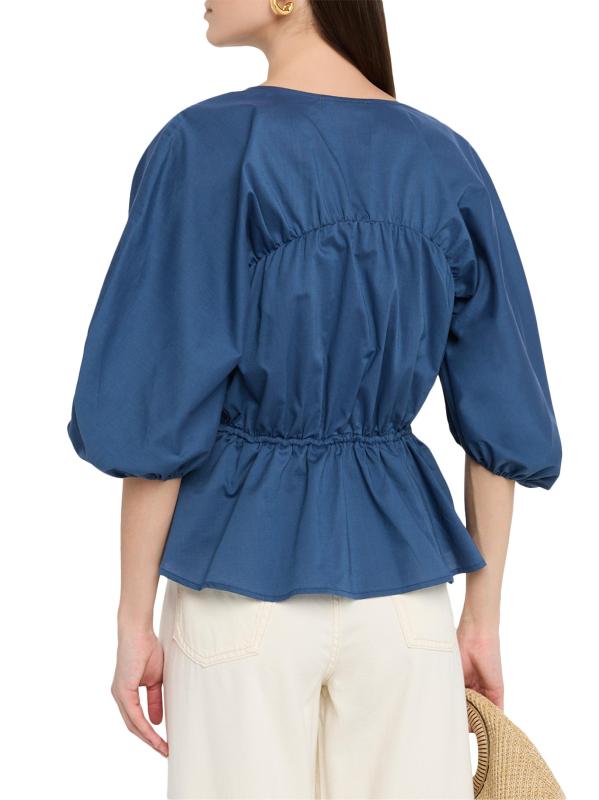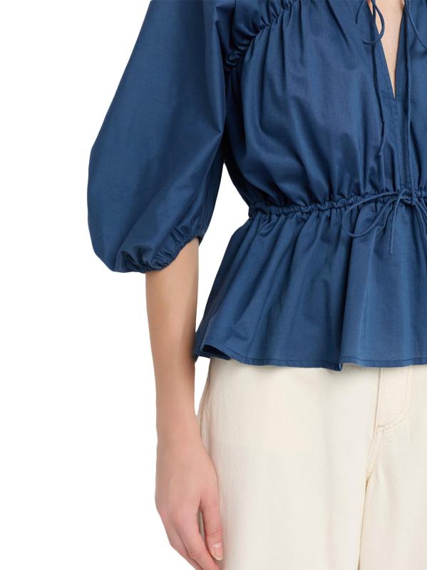 بلوزة Sigrid من Faithfull the Brand مصنوعة من القطن عالي التهوية ومزينة بشكل بيبلوم مع ربطات مزدوجة للشكل.