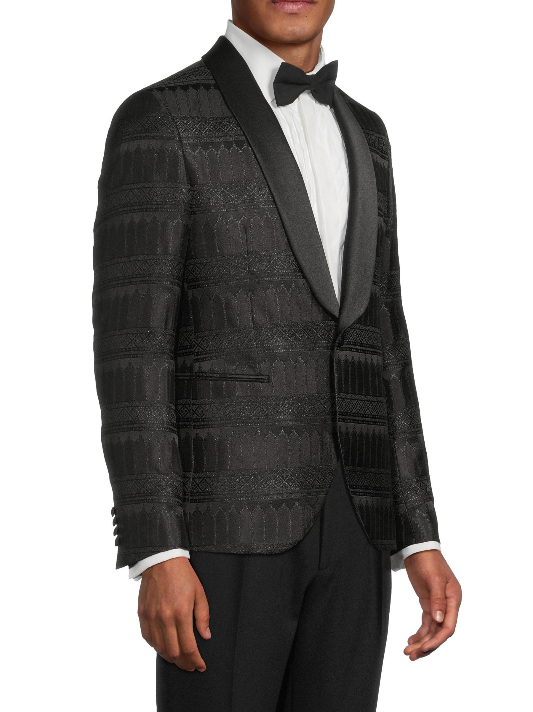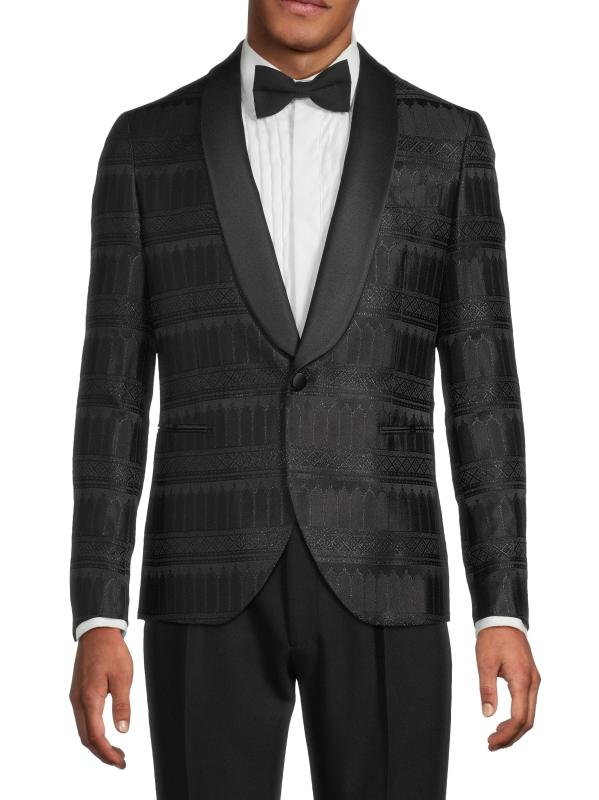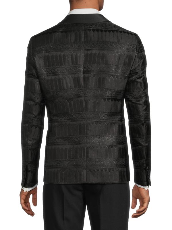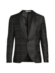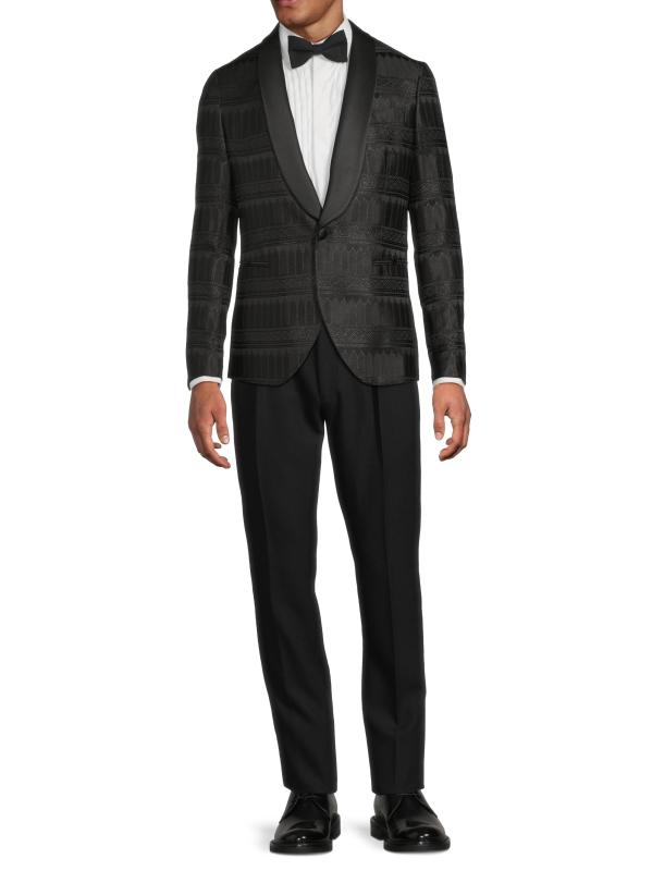 جاكيت عشاء Pal Zileri هذا مصنوع من مزيج الحرير، وهو مصمم بشكل أحادي الصدر ويتميز بزخرفة ساتان متباينة.