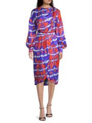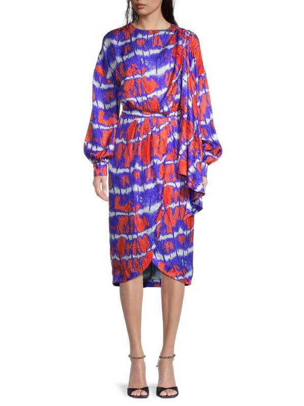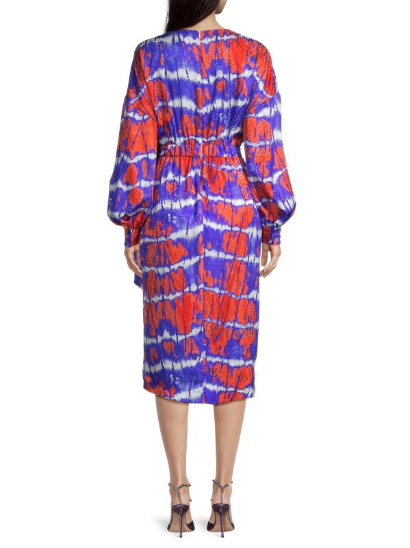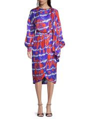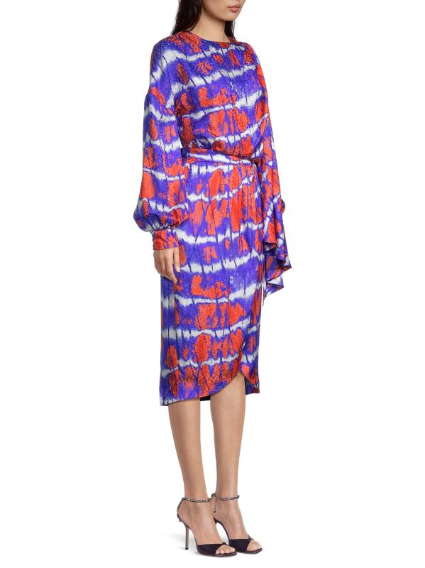 فستان Stella Jean مصنوع من الحرير الإيطالي ويسلط الضوء على طباعة نابضة بالحياة مصبوغة بربطة عنق. تُكمل أكمام البلوزة الطويلة وحافة التوليب هذا المظهر متوسط الطول.
