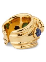 يُظهر خاتم Simone من Gas Bijoux الحرفية الحرفية، مع طلاء لامع من الذهب عيار 24 قيراطًا وثلاثة أحجار كريمة مقطوعة يدويًا.