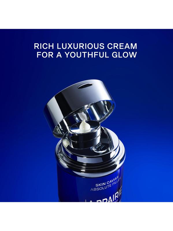 يساعد حشو Skin Caviar Absolute Filler من La Prairie على استعادة كثافة البشرة وتحسين ملامح الوجه وتحسين مرونة البشرة ولونها للحصول على بشرة ناعمة ذات مظهر شبابي. يحتوي هذا الكريم المرطب على Caviar Absolute - وهو شكل عالي التركيز من الكافيار السويسري الذي يتم الحصول عليه باستخدام عملية استخلاص دقيقة لعزل العناصر الغذائية التي تعزز حجم الكافيار - زيوت الكافيار وبروتينات الكافيار. يستهدف Caviar Absolute فقدان الحجم والمادة في الجلد لتعزيز امتلاء البشرة واستعادة كثافة الجلد وتحسين ملامح البشرة. في عام 1987، كشفت La Prairie للعالم عن قوة الكافيار الفريدة لشد البشرة وشدها وتغذيتها وتنشيطها. يعزز علم الكافيار المبتكر من La Prairie مستخلصات الكافيار الطبيعية، ويتحدى حدود الأداء للاستفادة الكاملة من إمكانات الرفع والشد الكاملة لمكونات الكافيار. غني بخصائص المركب الخلوي الحصري من لا برايري، ويتميز بتركيبة غنية ومهدئة ومرطبة، وهو مناسب لجميع أنواع البشرة بما في ذلك البشرة الجافة. تصنع La Prairie تركيبات حديثة مثل تلك الموجودة في مجموعة Skin Caviar الخاصة بنا، لترتقي بالعناية بالبشرة الفاخرة إلى شكل فني.