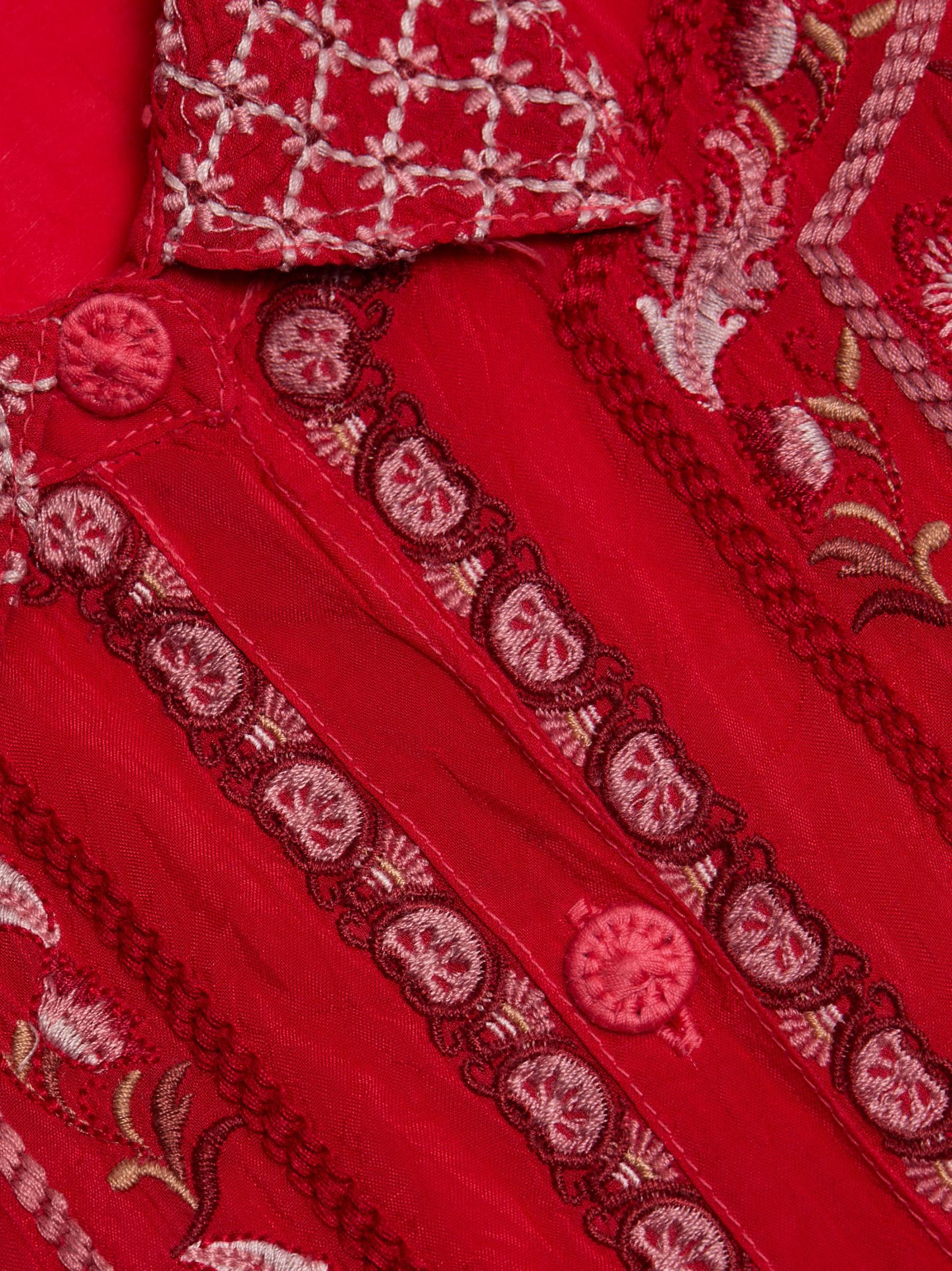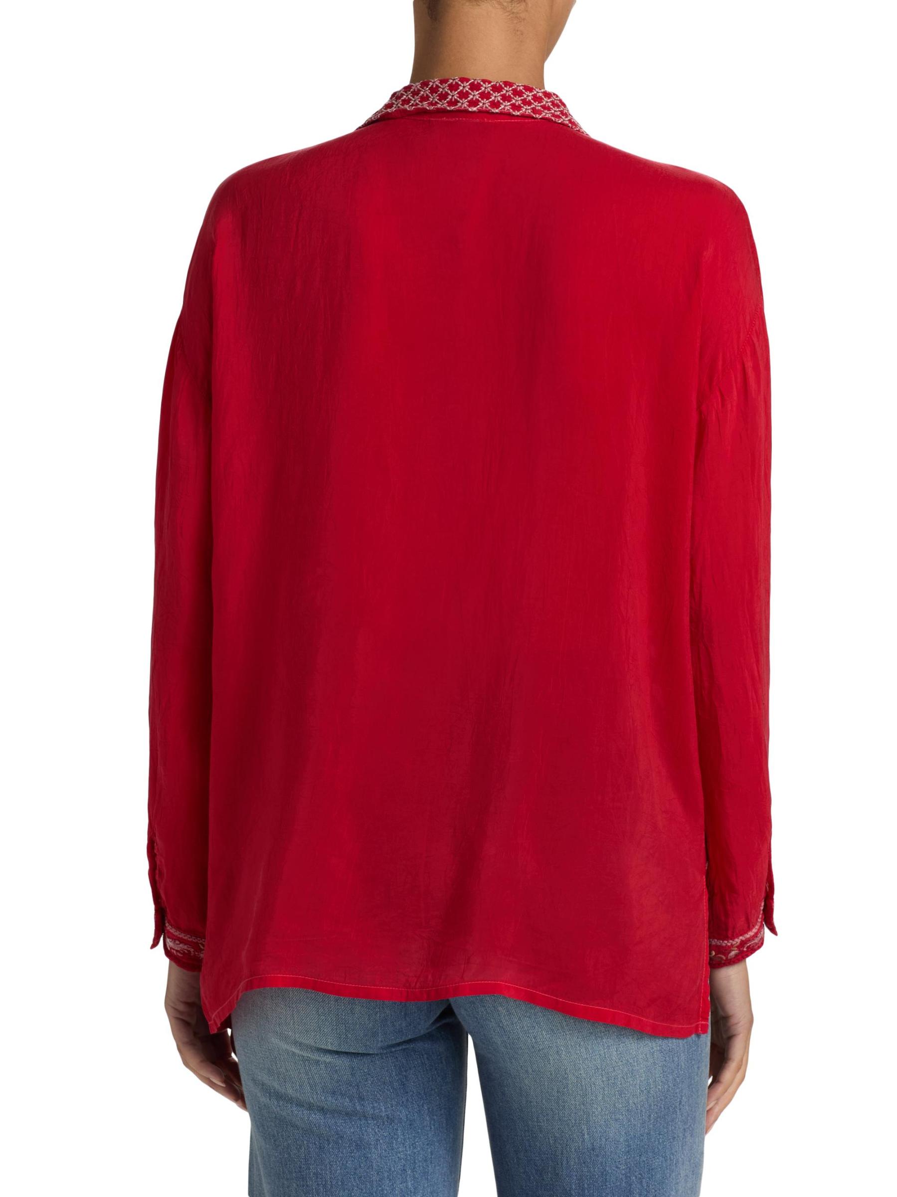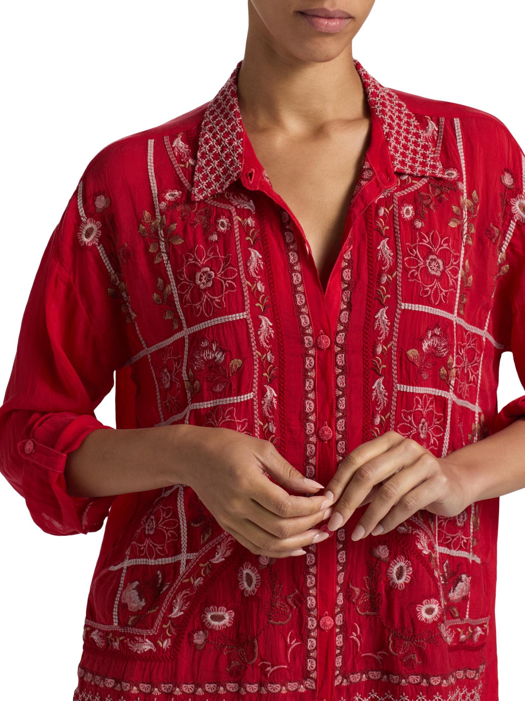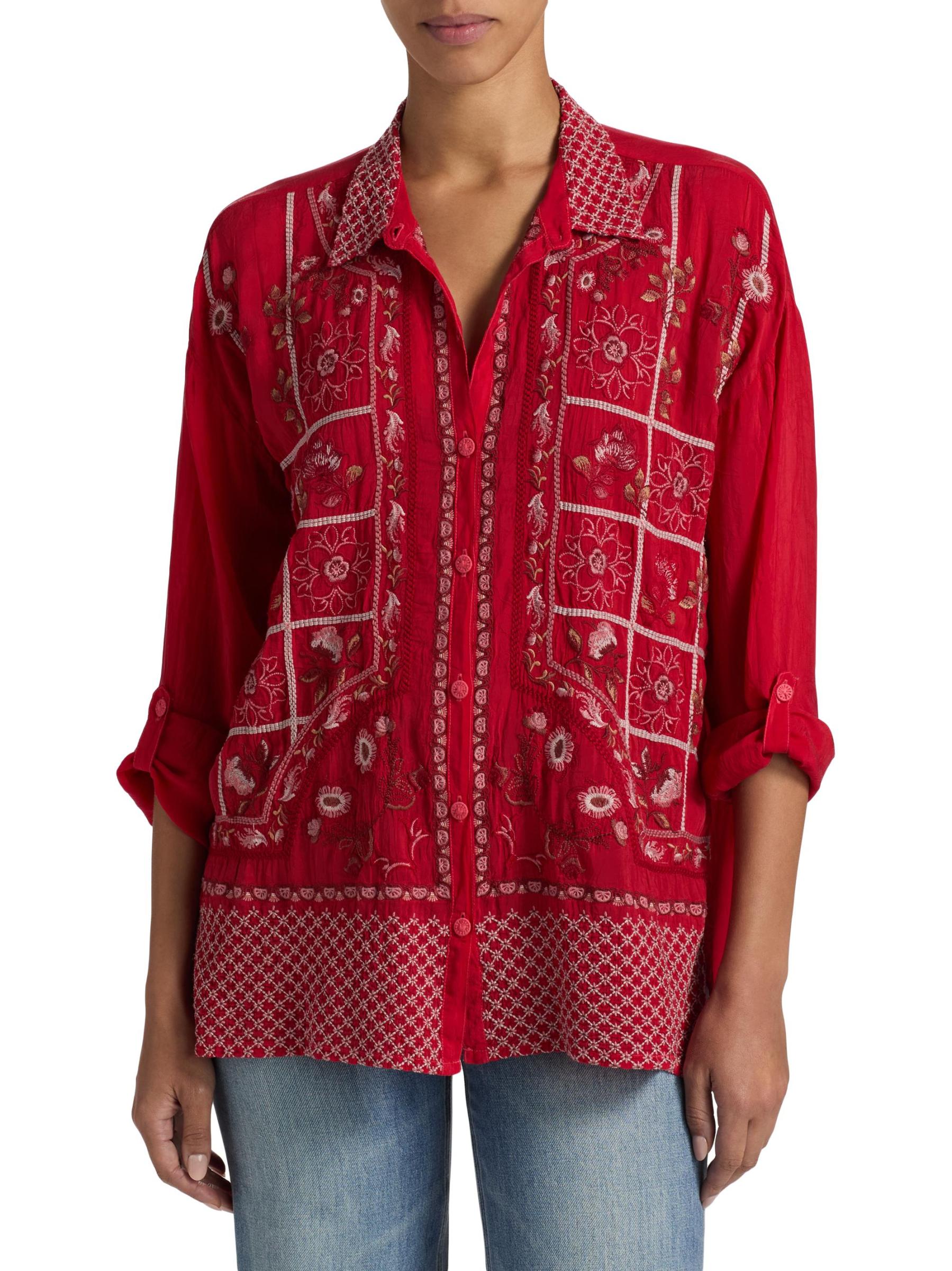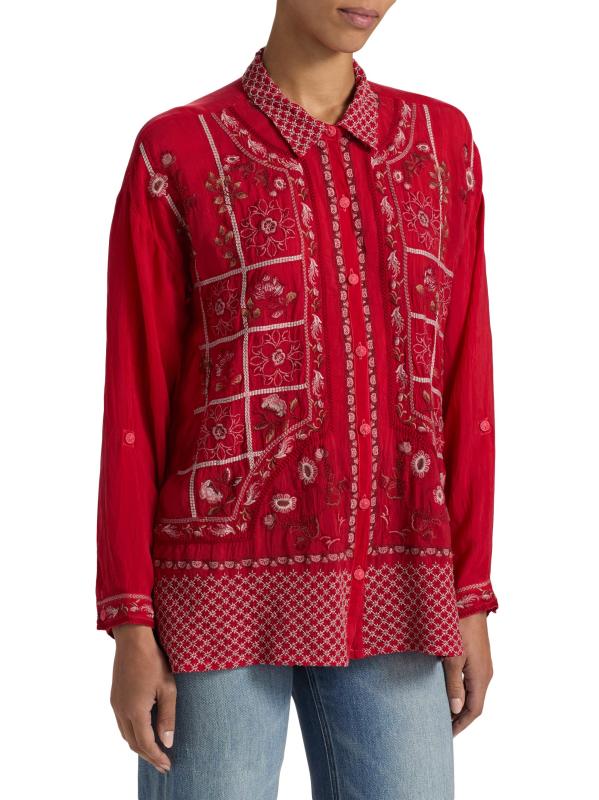 يتميز قميص Slim Audrey من Johnny Was بتصميم تطريز مختلط نابض بالحياة. تتميّز هذه القطعة، المُصمّمة بأزرار أمامية، بياقة واسعة وأكمام طويلة وأساور مُحاطة.