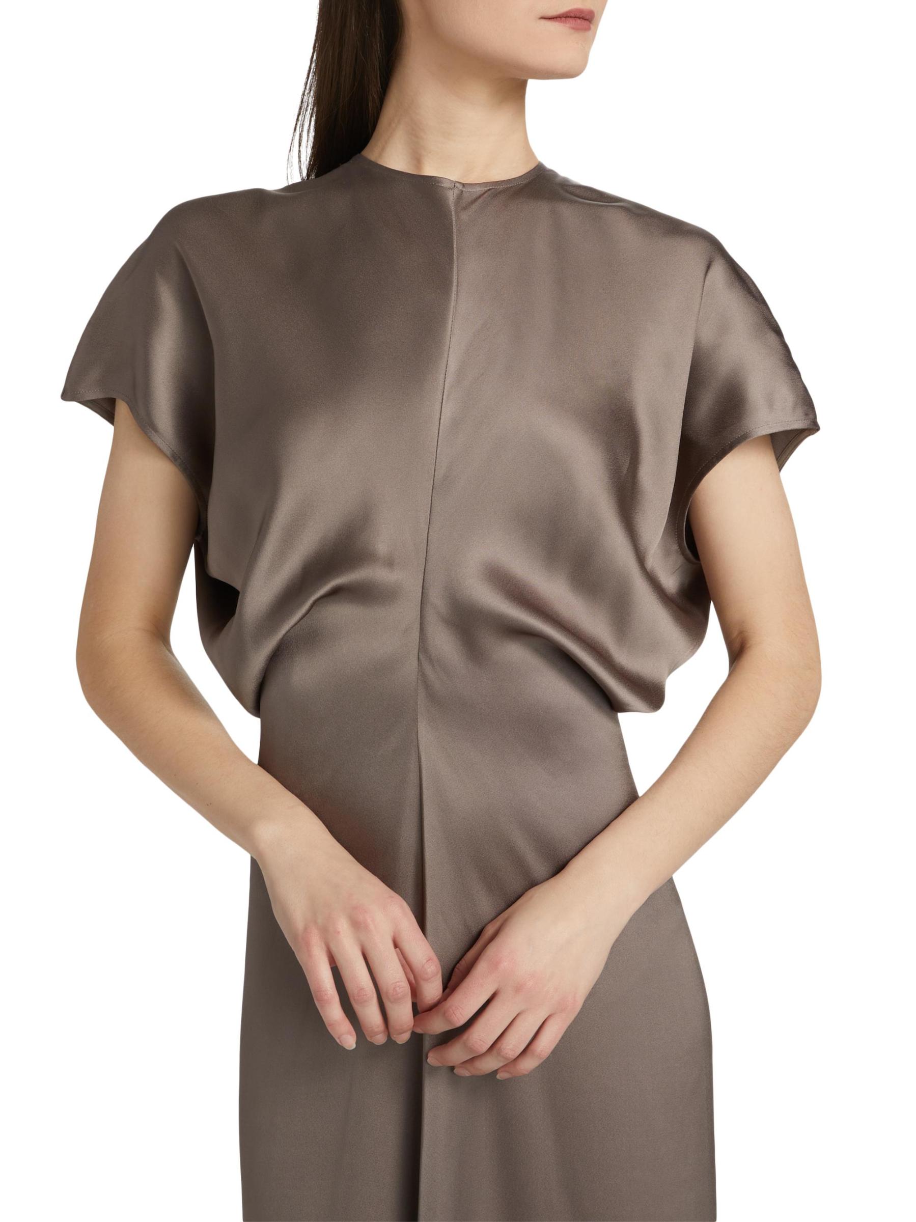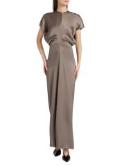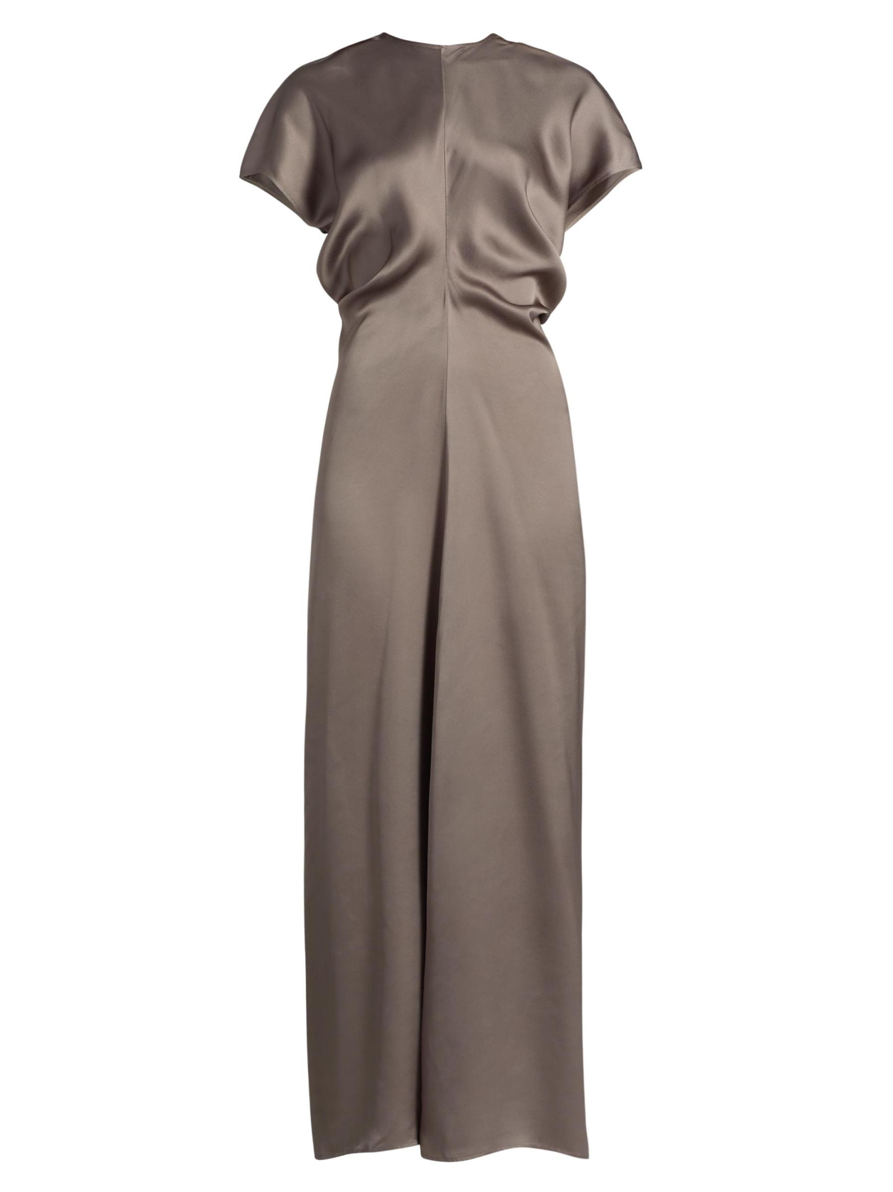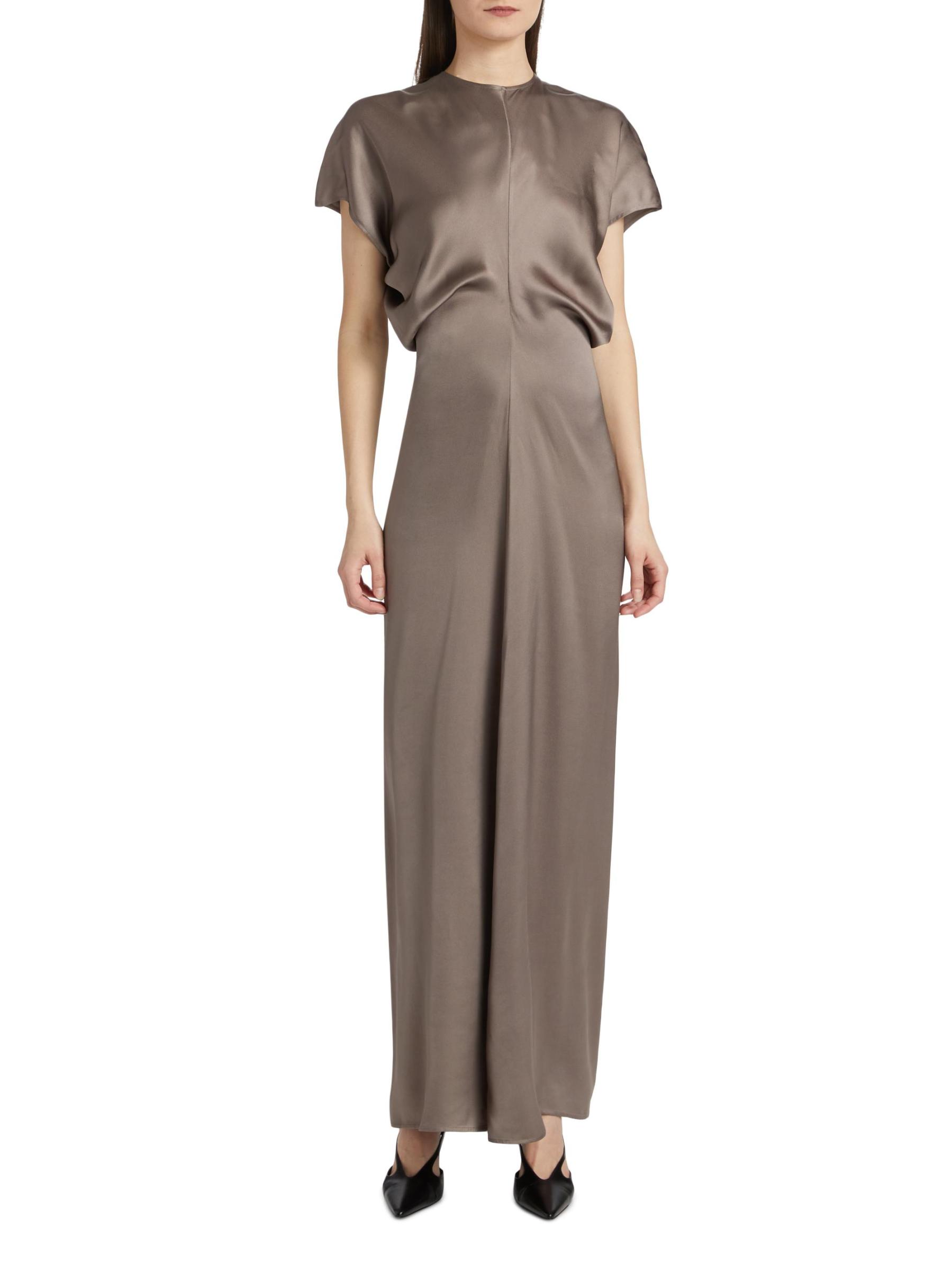 هذا الفستان الطويل من Toteme مصنوع من الساتان ويتميز بألواح منحنية مخيطة معًا لخلق تأثير مترهل عند الخصر وحاشية منسدلة على الأرض.