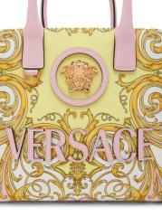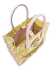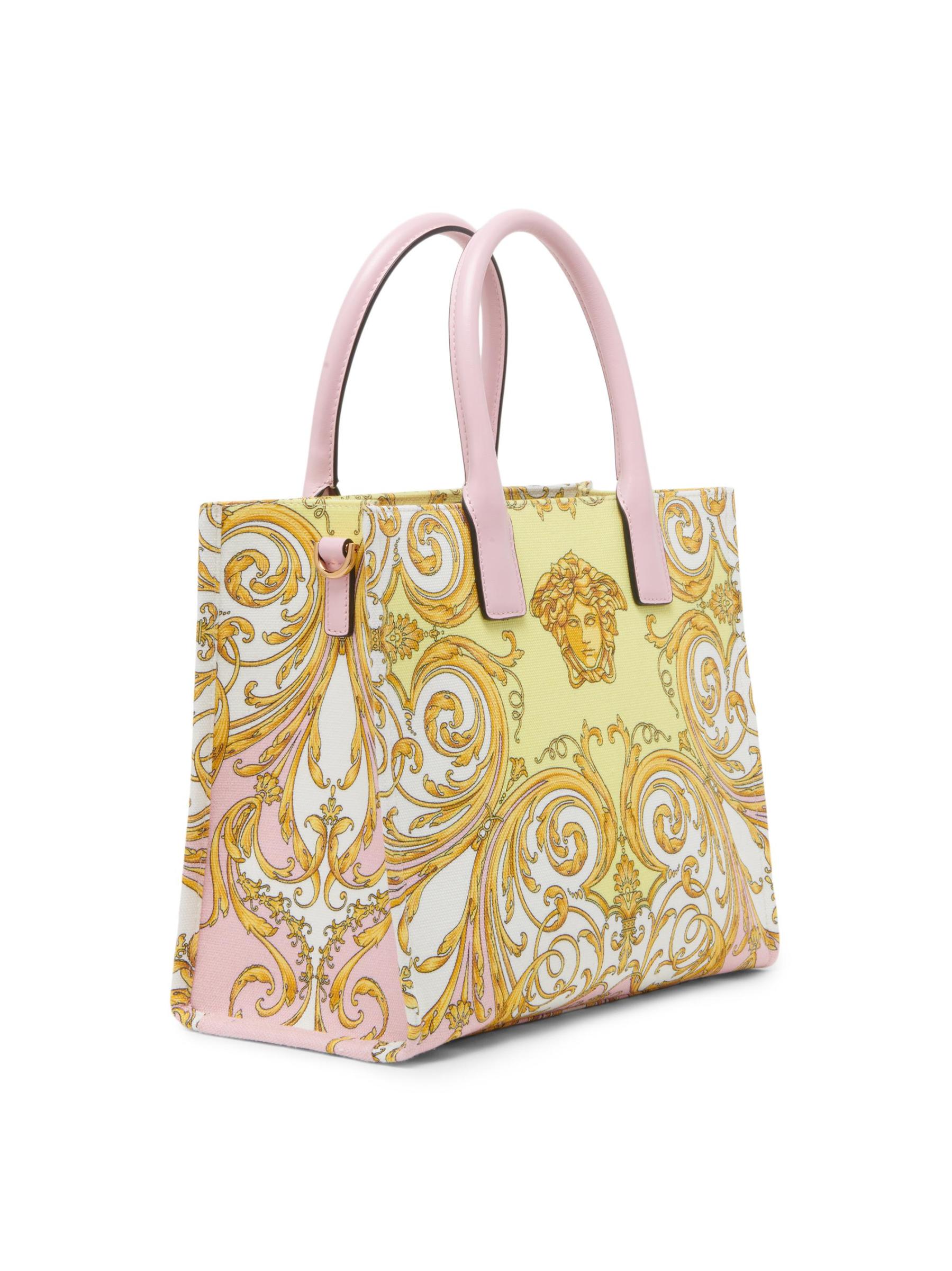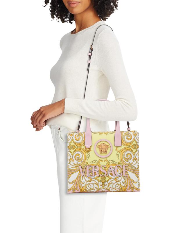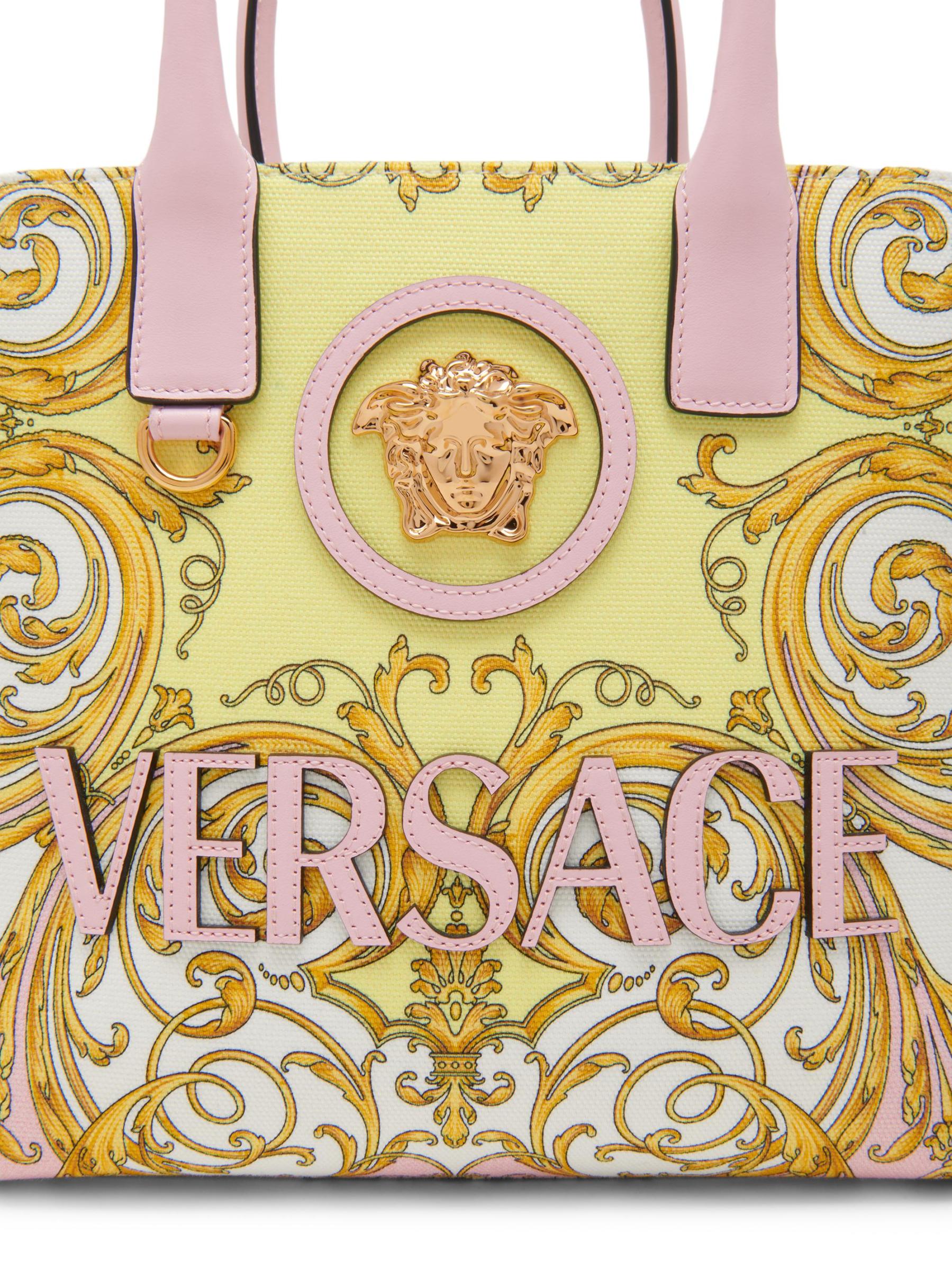 هذه الحقيبة الصغيرة من فيرساتشي مصنوعة من القطن المميز المطبوع على الطراز الباروكي مع زخرفة جلدية وتتميز بتفاصيل رأس ميدوسا.