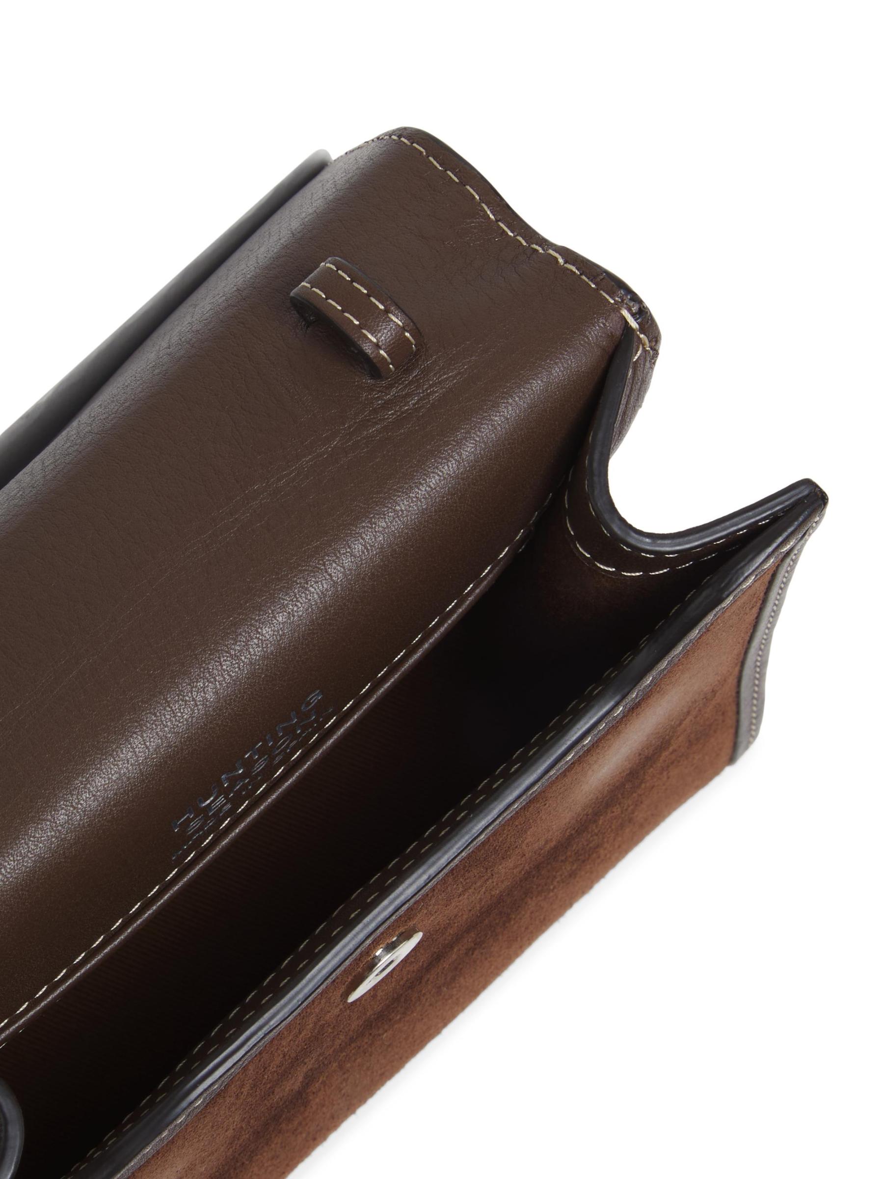 حقيبة Hunting Season الصغيرة ذات المقبض العلوي مصنوعة من الجلد المدبوغ الفاخر. صُنعت هذه القطعة في إسبانيا، وتتميز بحزام قابل للإزالة والتعديل وإغلاق بغطاء مغناطيسي مخفي للتخزين الآمن.