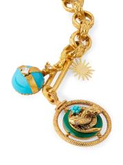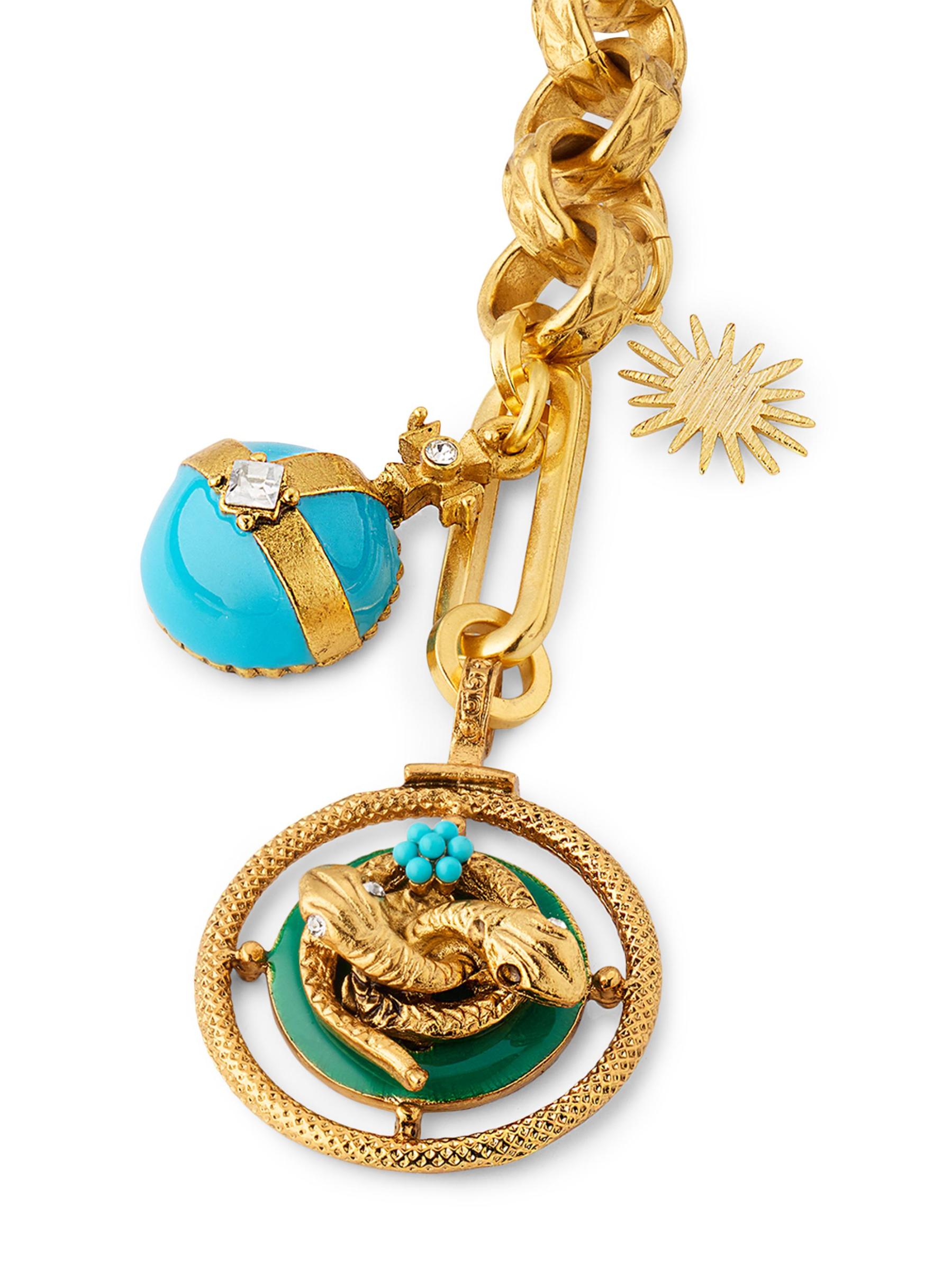 تتدلى زخرفة الأفعى المزدوجة من سحر حقيبة الأفعى المطلية بالذهب عيار 24 قيراطًا من إليزابيث كول. تتميز القطعة بسحرتين إضافيتين مزينتين بالمينا والكريستال المختلط.