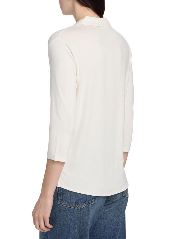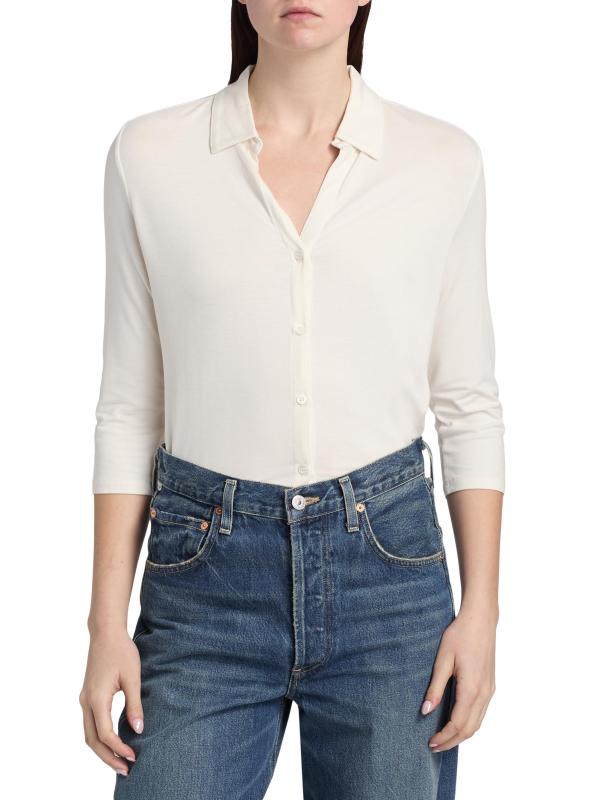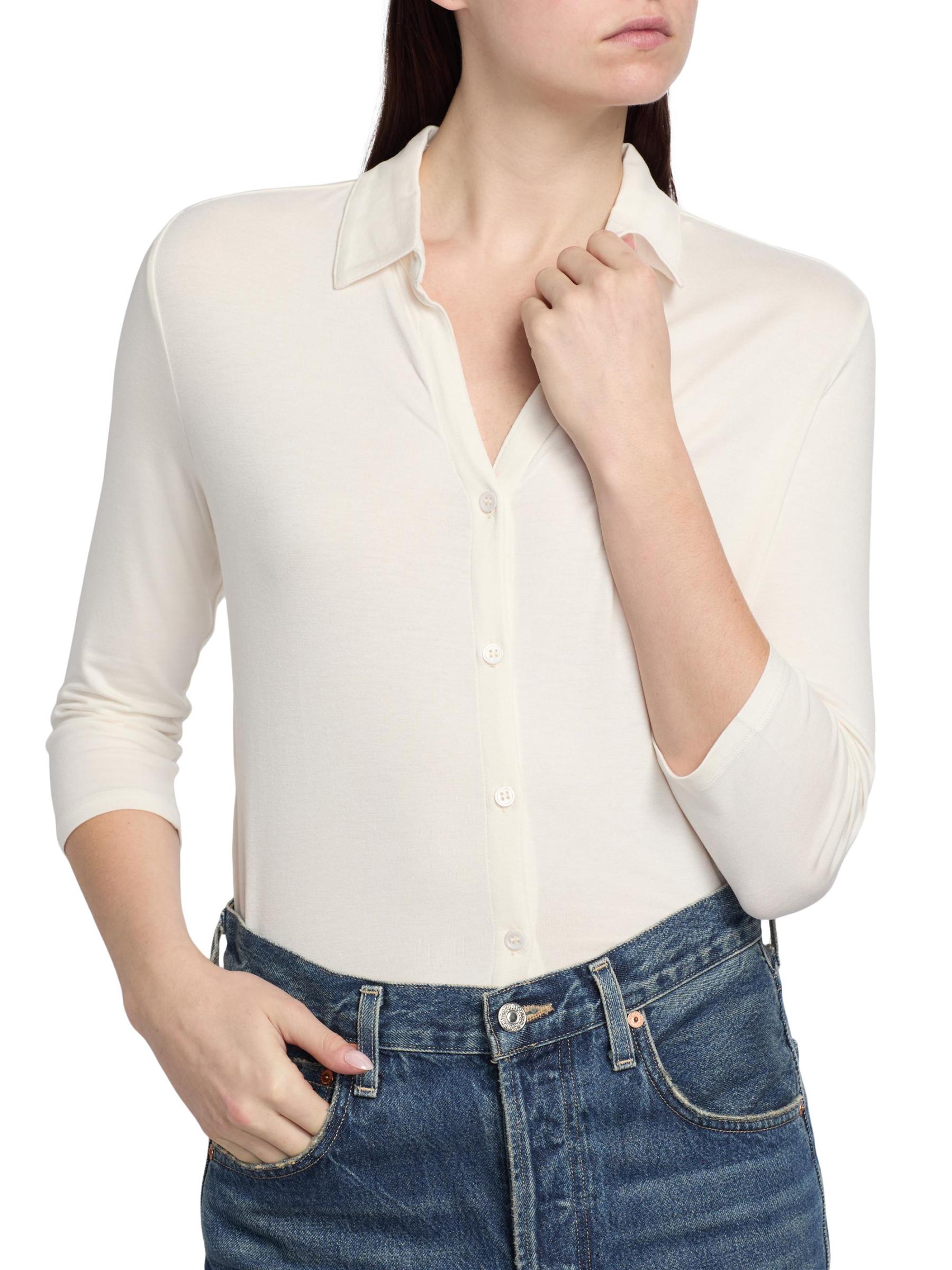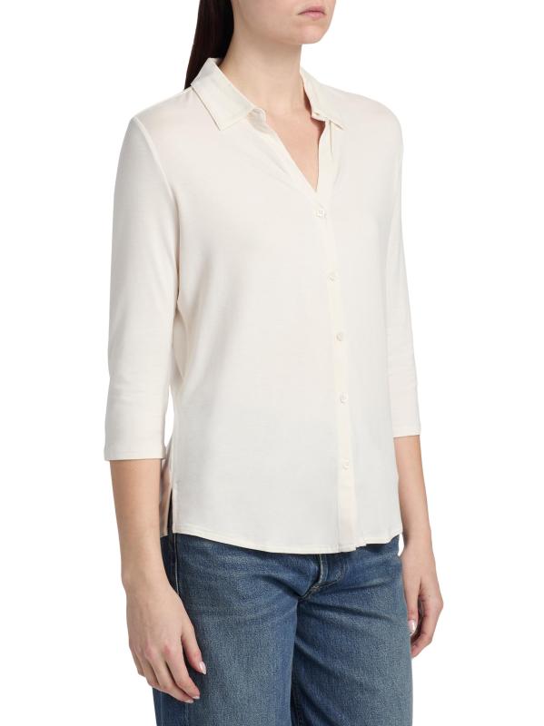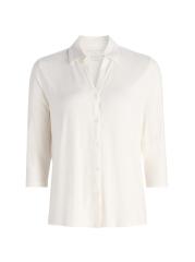 تم تصميم قميص سوفت تاتش هذا من Majestic Filatures، المصنوع من قماش قابل للتمدد، بقصة شبه مريحة. يُكمل المظهر ياقة واسعة وأكمام بطول ثلاثة أرباع وفتحة بأزرار أمامية.