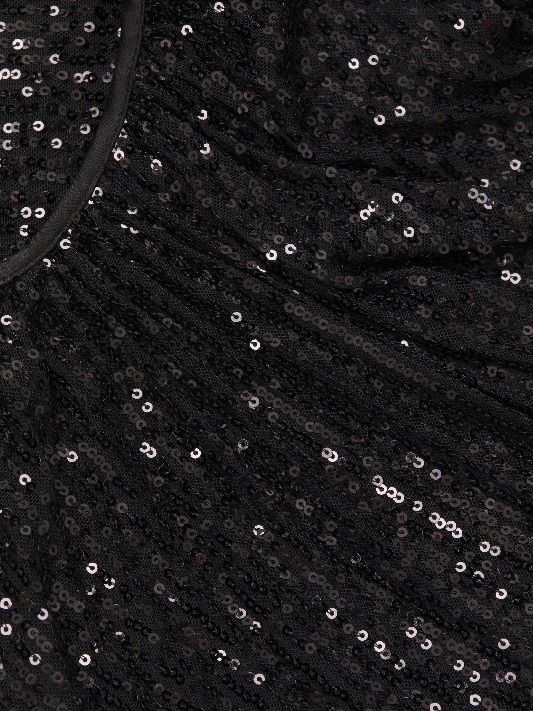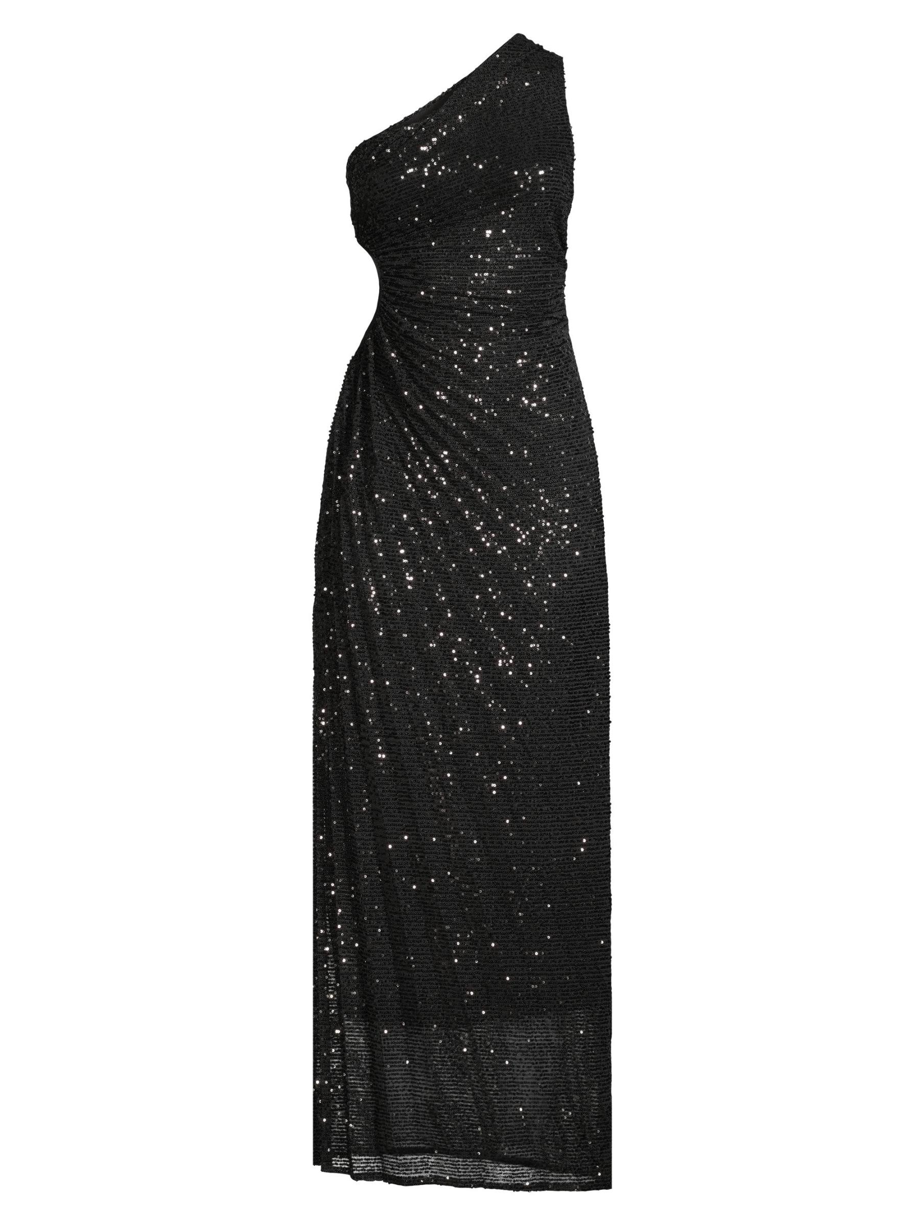 تم تصميم فستان Solie من Delfi المُزين بالترتر اللامع مع صورة ماكسي غير متماثلة وفتحة عند الورك.