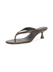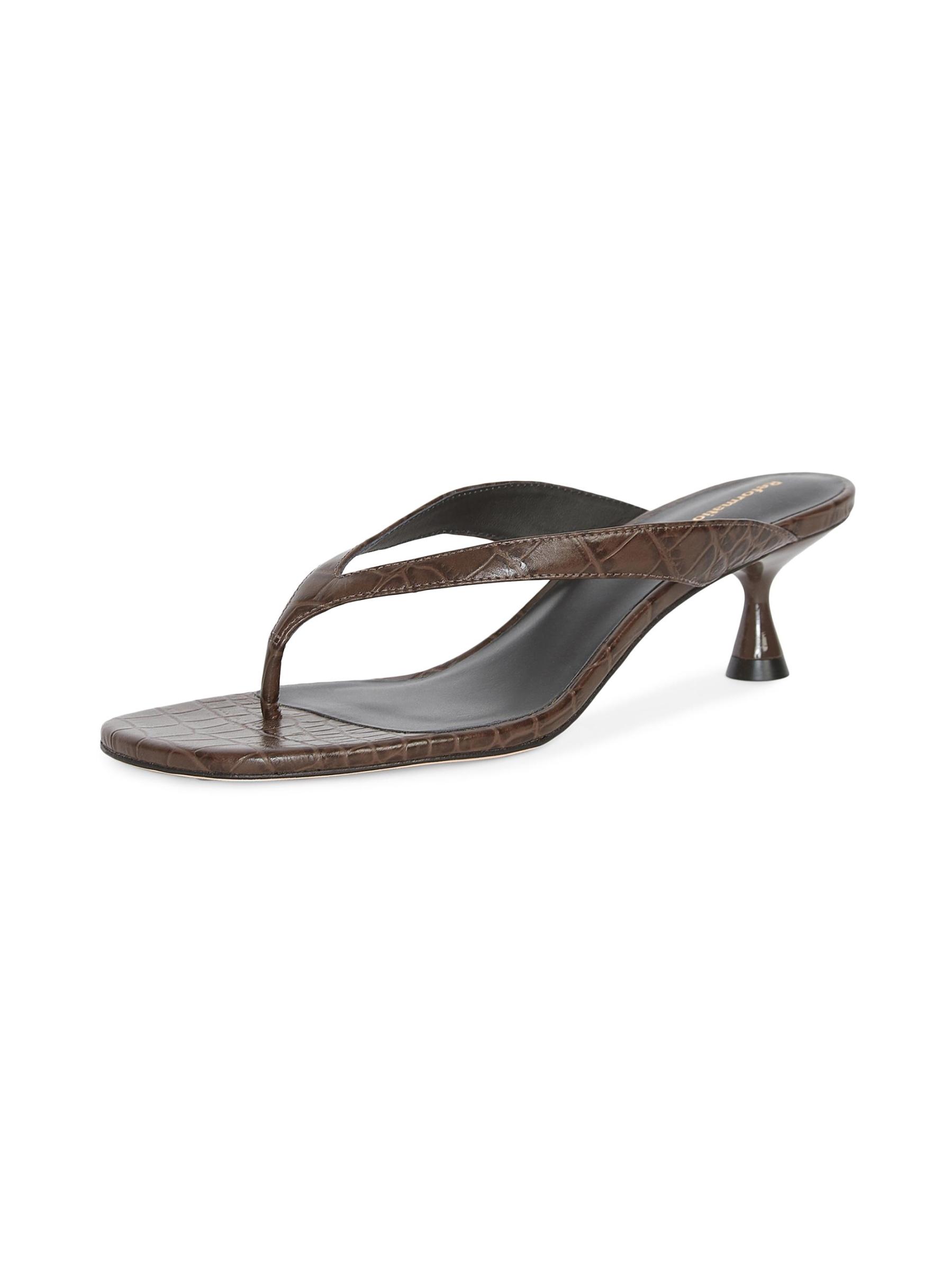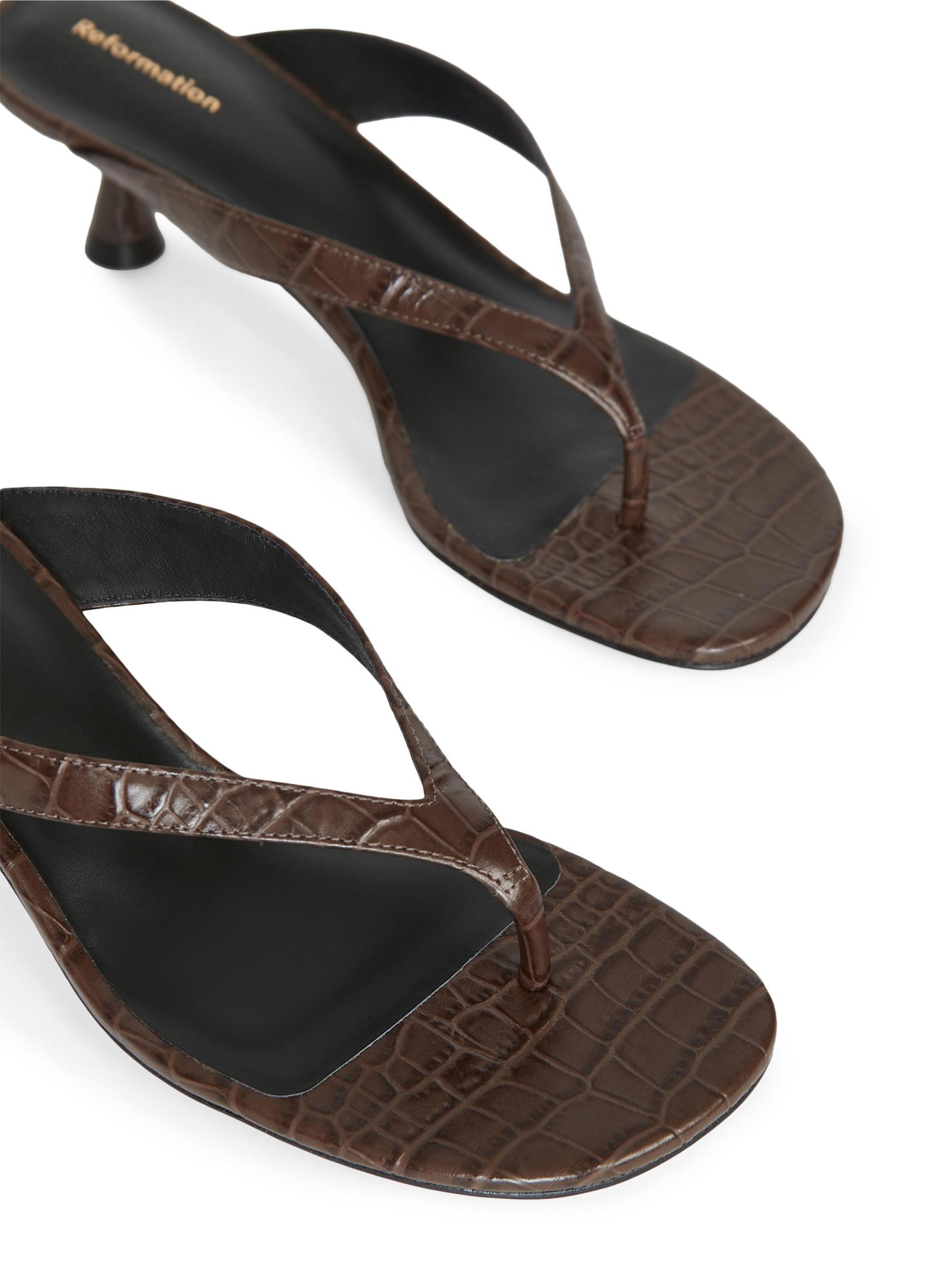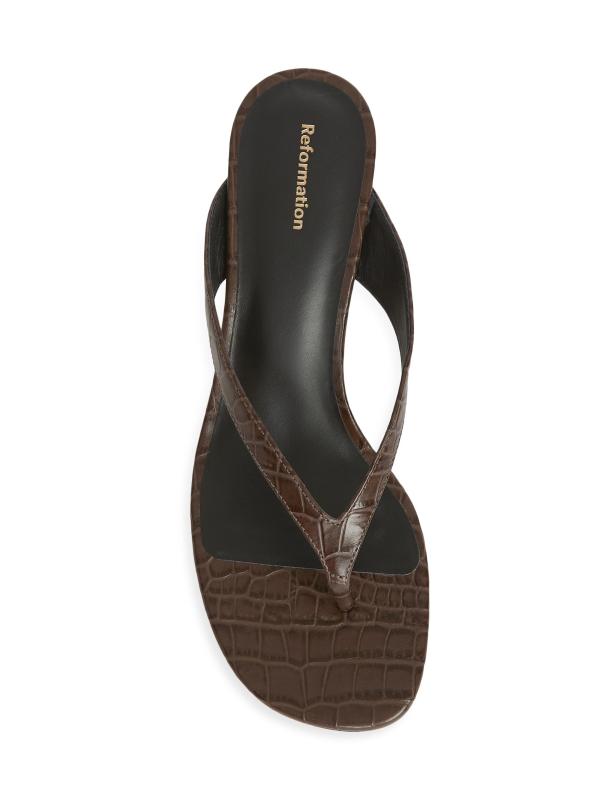 يُبرز صندل صوفي ذو الكعب العالي من ريفورمينت، المصنوع من الجلد المنقوش بالتماسيح، إصبع القدم بنمط ثونغ وكعب صغير مغطى ذاتيًا.