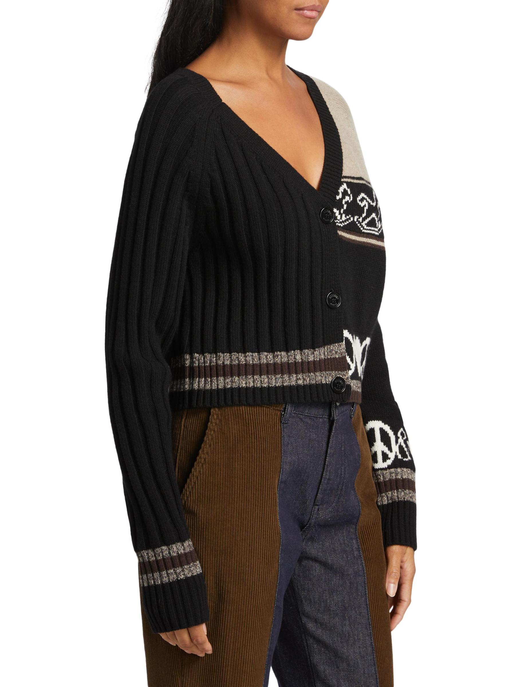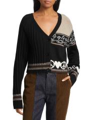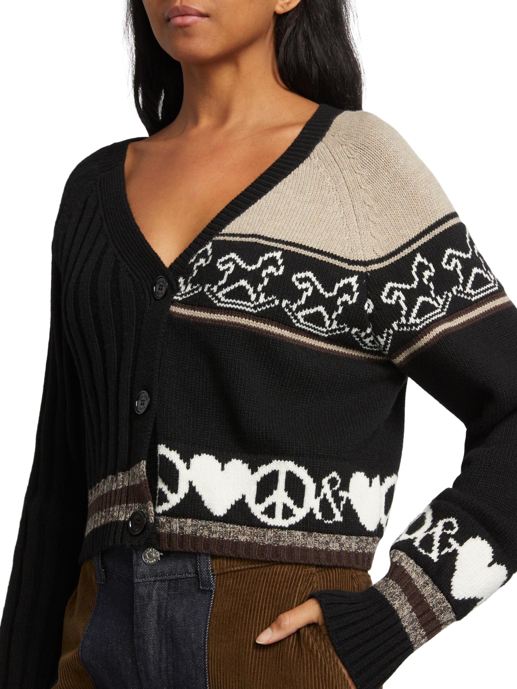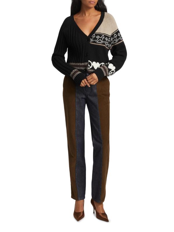 يُبرز كارديجان سبليت من موسكينو جينز التصميم بتقنية القص والخياطة، ويتميز برقبة على شكل حرف V وأكمام طويلة وتقليم مضلع.