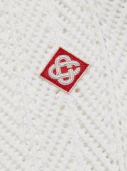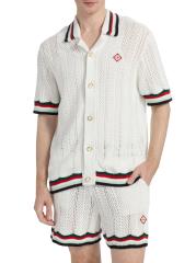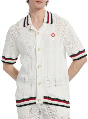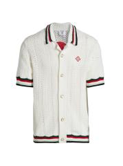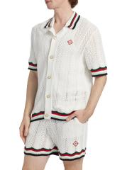 يتميز قميص كازابلانكا هذا المصنوع من القطن المحبوك بشيفرون بزخرفة مخططة محبوكة على شكل أضلاع عند ياقة المخيم والأساور والحاشية. تُبرز الأزرار المصنوعة من اللؤلؤ الصناعي الفتحة الأمامية للحصول على لمسة نهائية راقية.طوق المخيم أكمام قصيرة تقليم مضلع إغلاق بأزرار أمامية قطن بنسبة 100% الزينة: 100% أكريليك تنظيف جاف مستوردة