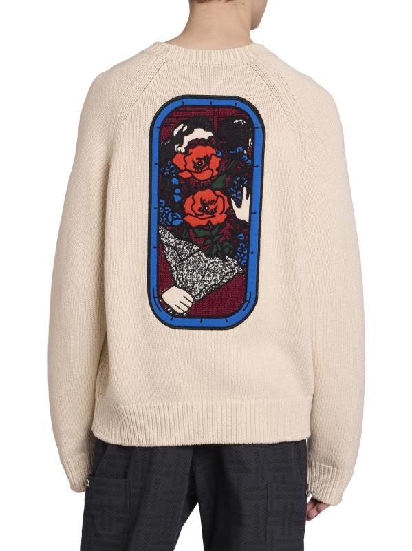 صُنعت هذه السترة ذات الرقبة المستديرة من كينزو من مزيج الصوف، وهي مطرزة من الخلف بزخارف وردية نابضة بالحياة مستوحاة من الزجاج الملون.