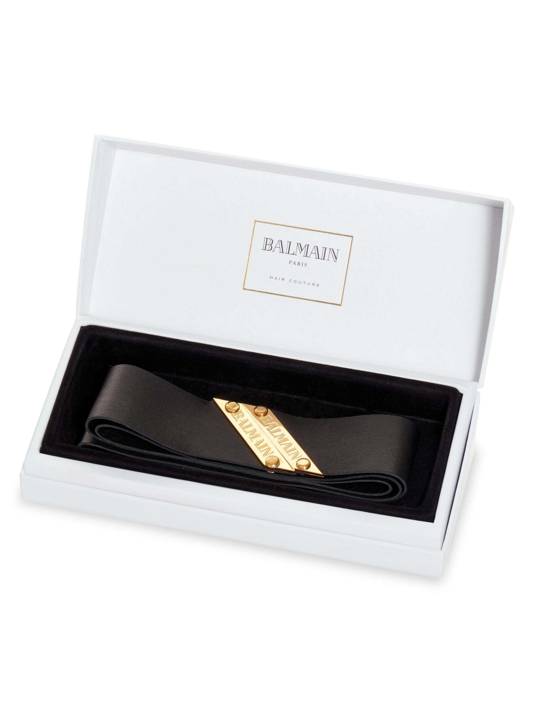 من المجموعة القياسية. ربطة الرأس الجلدية من Balmain مصنوعة من جلد نابا الأصلي ومصممة بالتفاصيل الذهبية المميزة للعلامة التجارية. يضيف ملحق الشعر الفاخر الراقي لمسة من الأناقة إلى أي تسريحة شعر ويسمح بإمكانيات إبداعية لا حصر لها. مثالي للارتداء كطوق للرأس أو ربطة عنق على شكل قوس أو استخدامه لإبراز تسريحة ذيل حصان أنيقة أو ضفيرة فوضوية. جلد نابا ونوبوك. صُنع في إسبانيا.