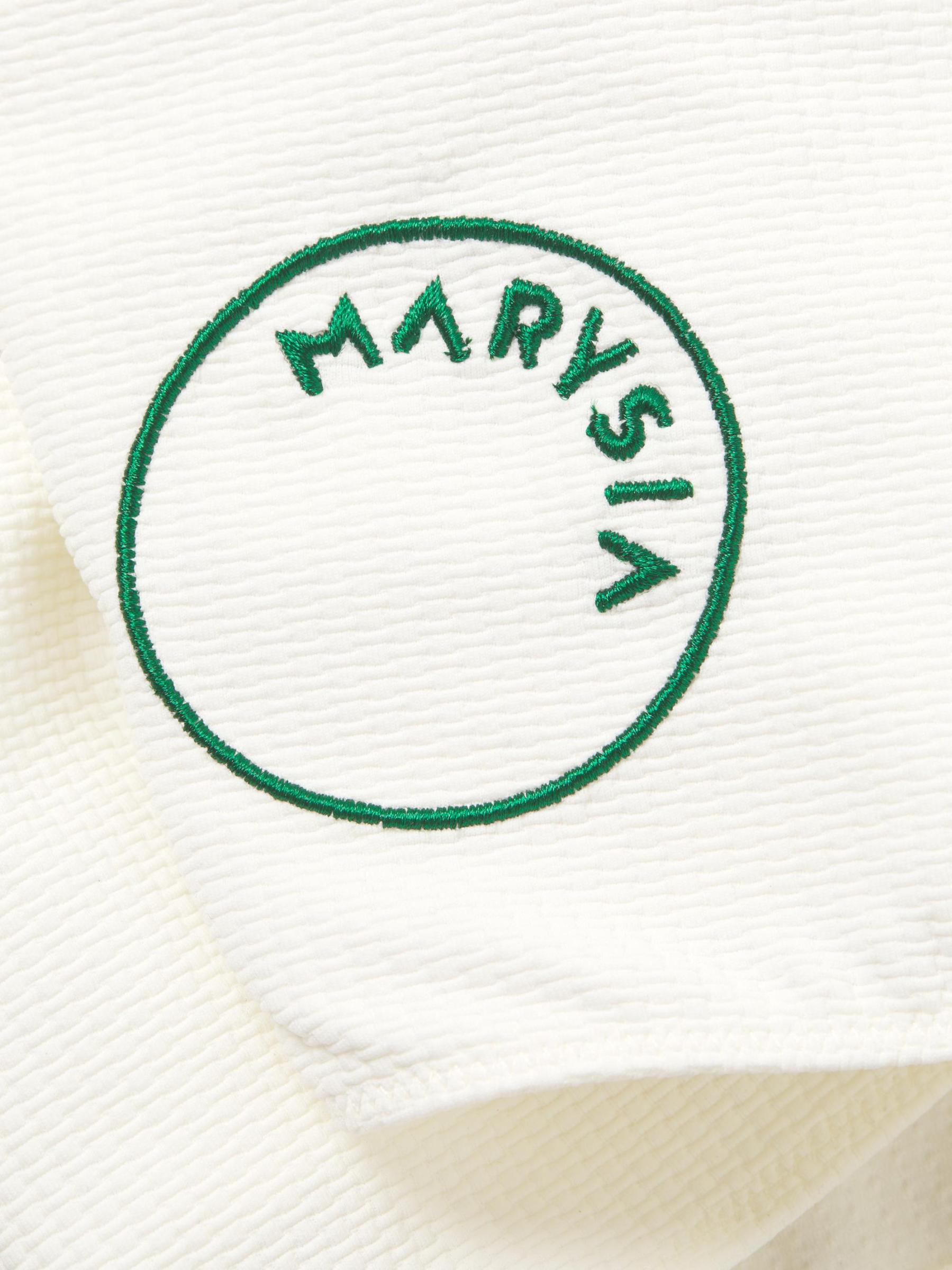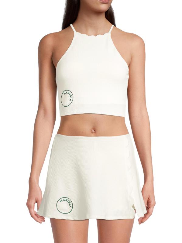 تتميّز هذه البلوزة الرياضية القصيرة بشعار على الحافة مع فتحة رقبة صدفية.