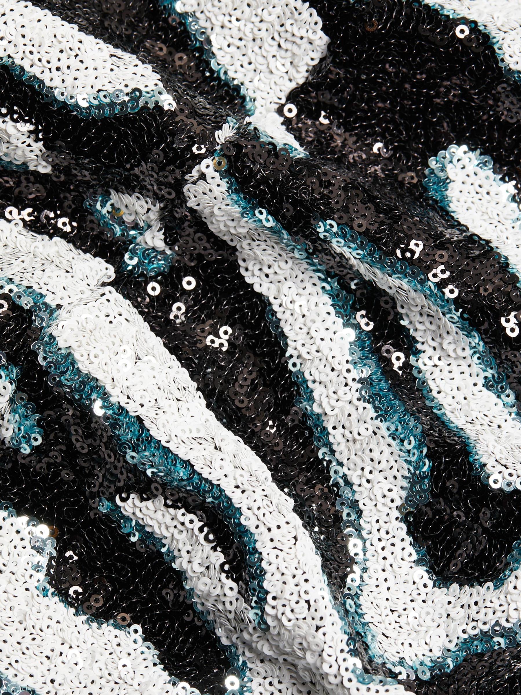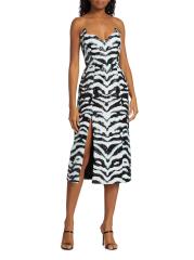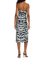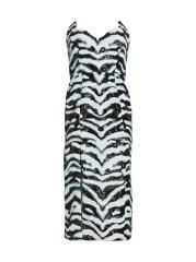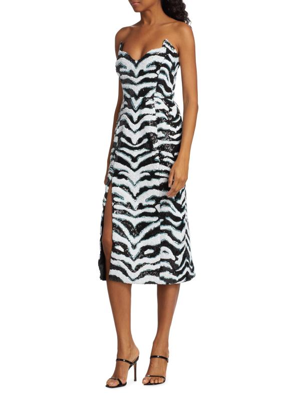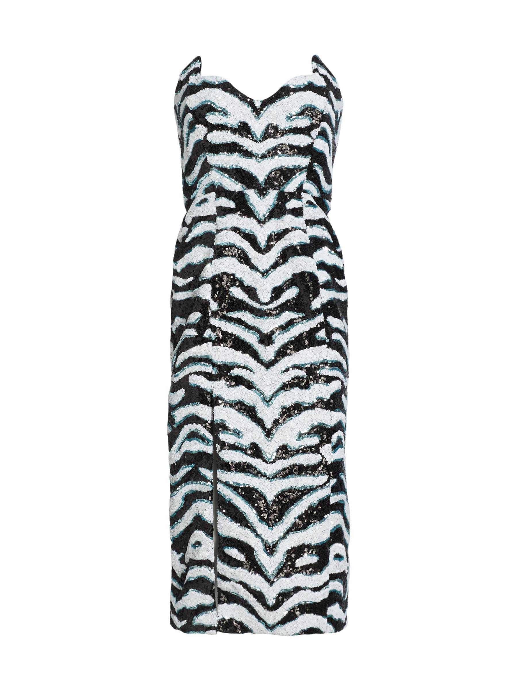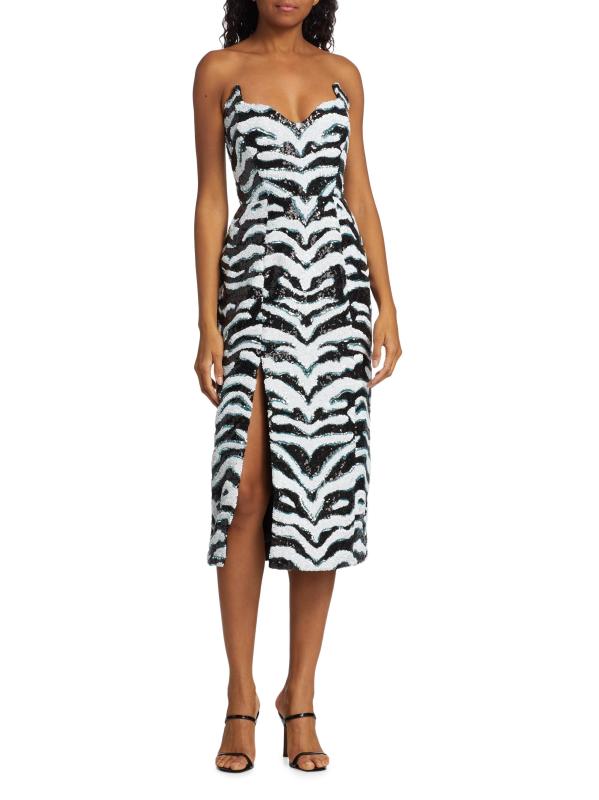 يتميّز فستان Halpern متوسط الطول بدون حمالات والذي يتميّز برقبة صدفيّة واسعة على شكل حرف V وتصميم مزيّن بالترتر مستوحى من الحمار الوحشي.