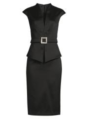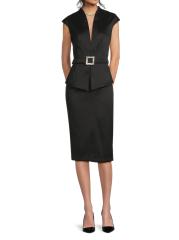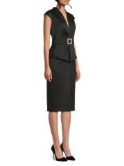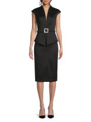 يتميز فستان الكوكتيل الغمد من Aidan Mattox، الذي تم تشطيبه باللون الميكادو المرن، برقبة واسعة على شكل حرف V وأكمام على شكل قبعة ومشبك مزخرف.
