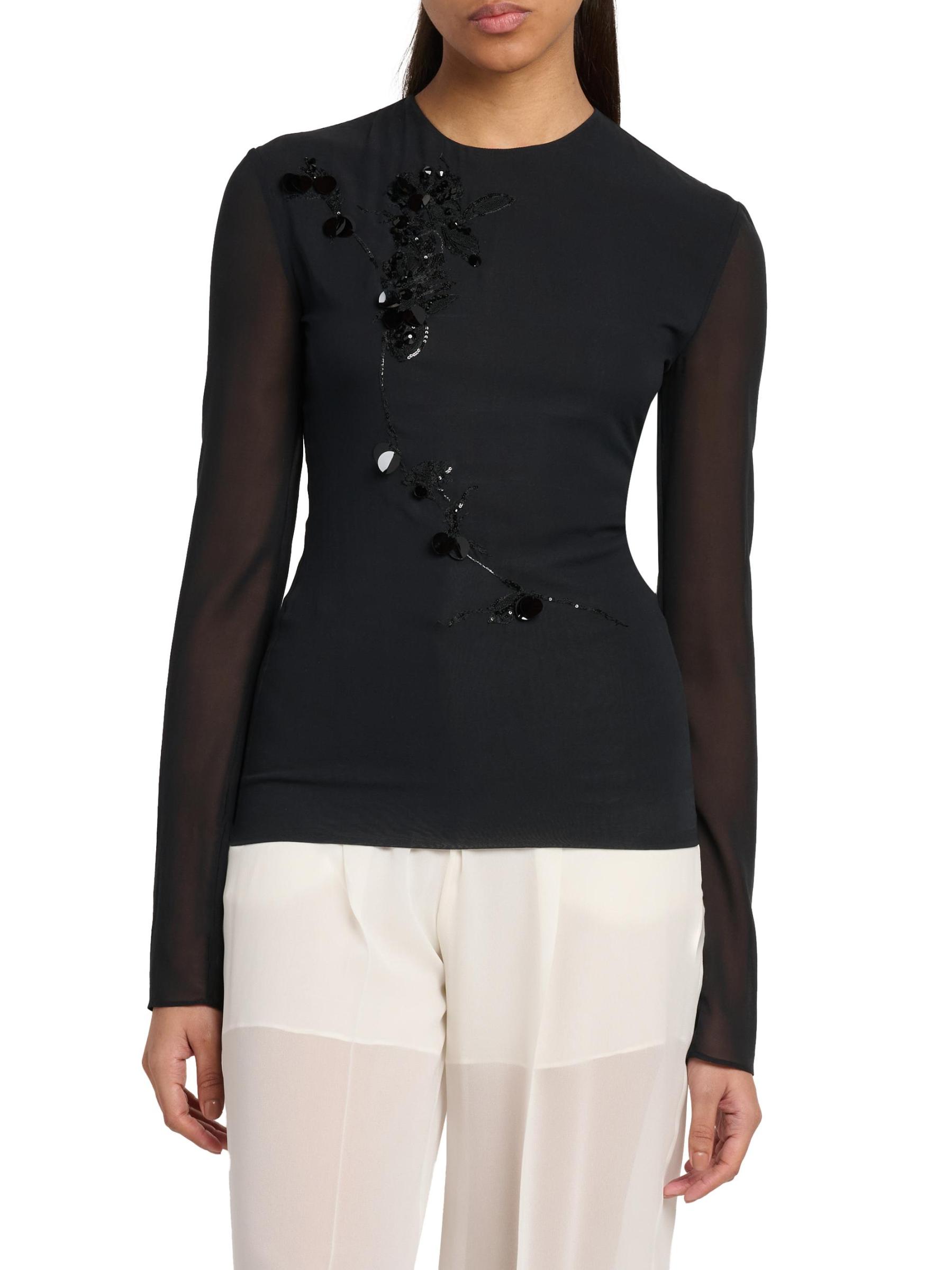 هذه البلوزة من Alberta Ferretti مصنوعة من الحرير المرن وتتميز بتفاصيل مطرزة وزخارف كريستالية.
