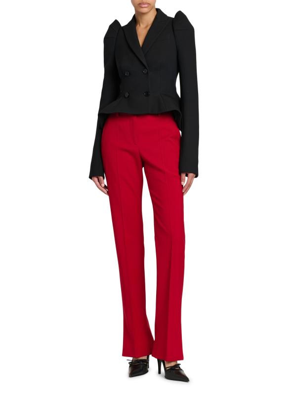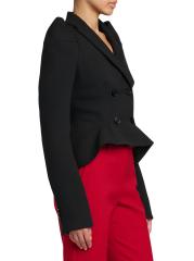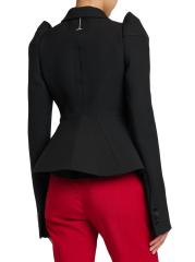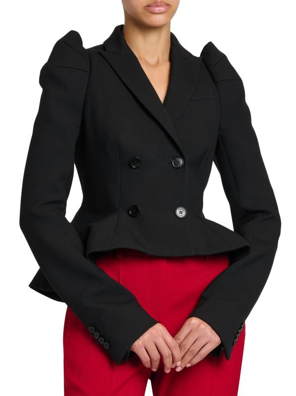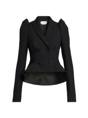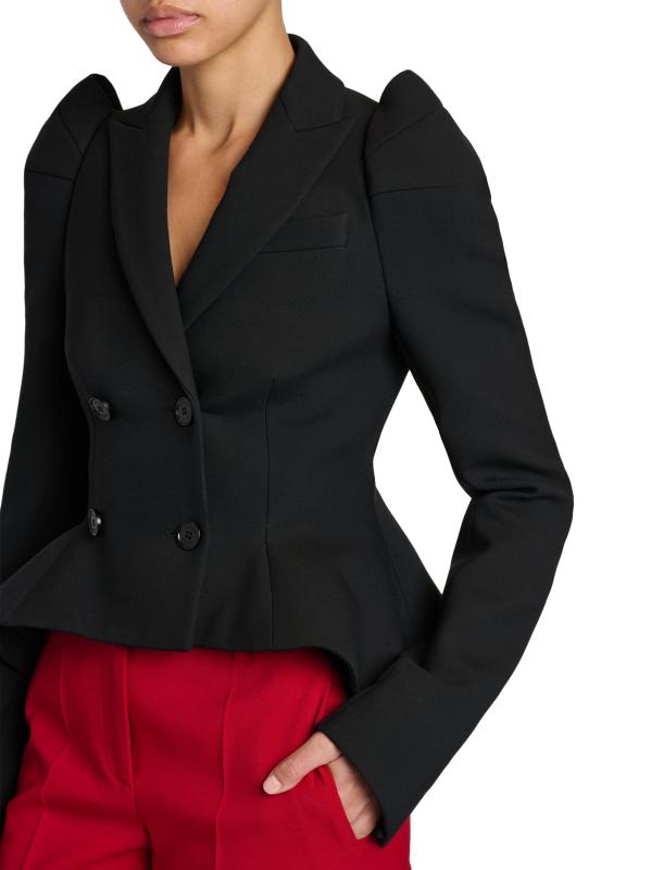 تتميّز هذه السترة القصيرة ذات الصدر المزدوج من ماكوين، المصنوعة من صوف الجبردين المرن، بأكتاف منفوخة ديناميكية وحافة بيبلوم واسعة ومنخفضة.