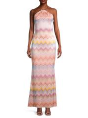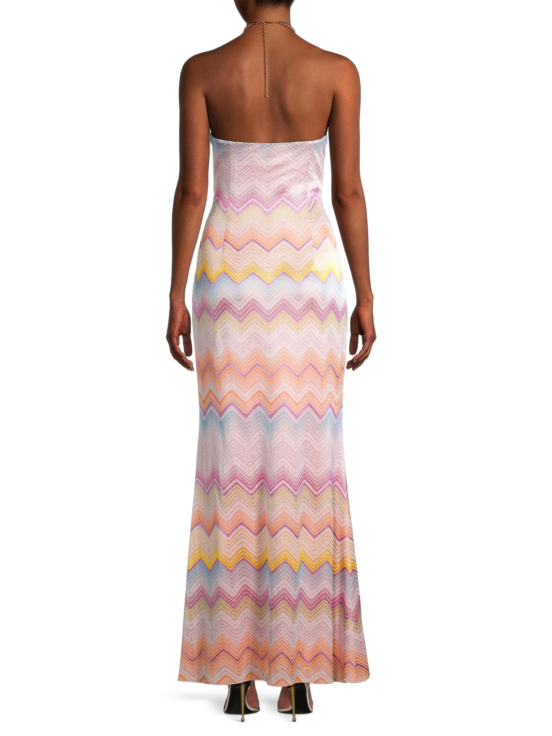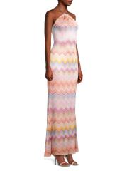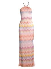 صُمم هذا الفستان الطويل بدون أكمام من Liv Foster من الجاكار المقلّم برقبة رسن وظهر مفتوح.