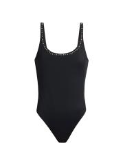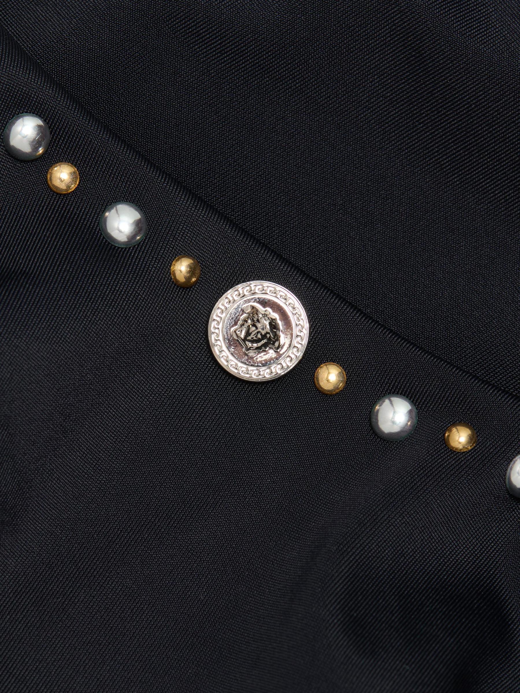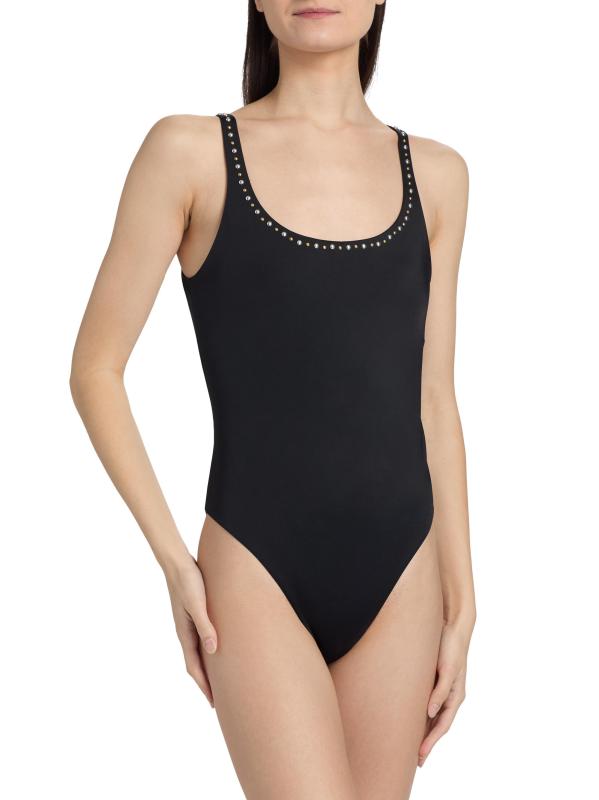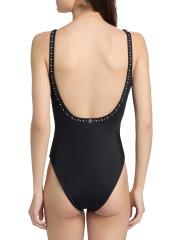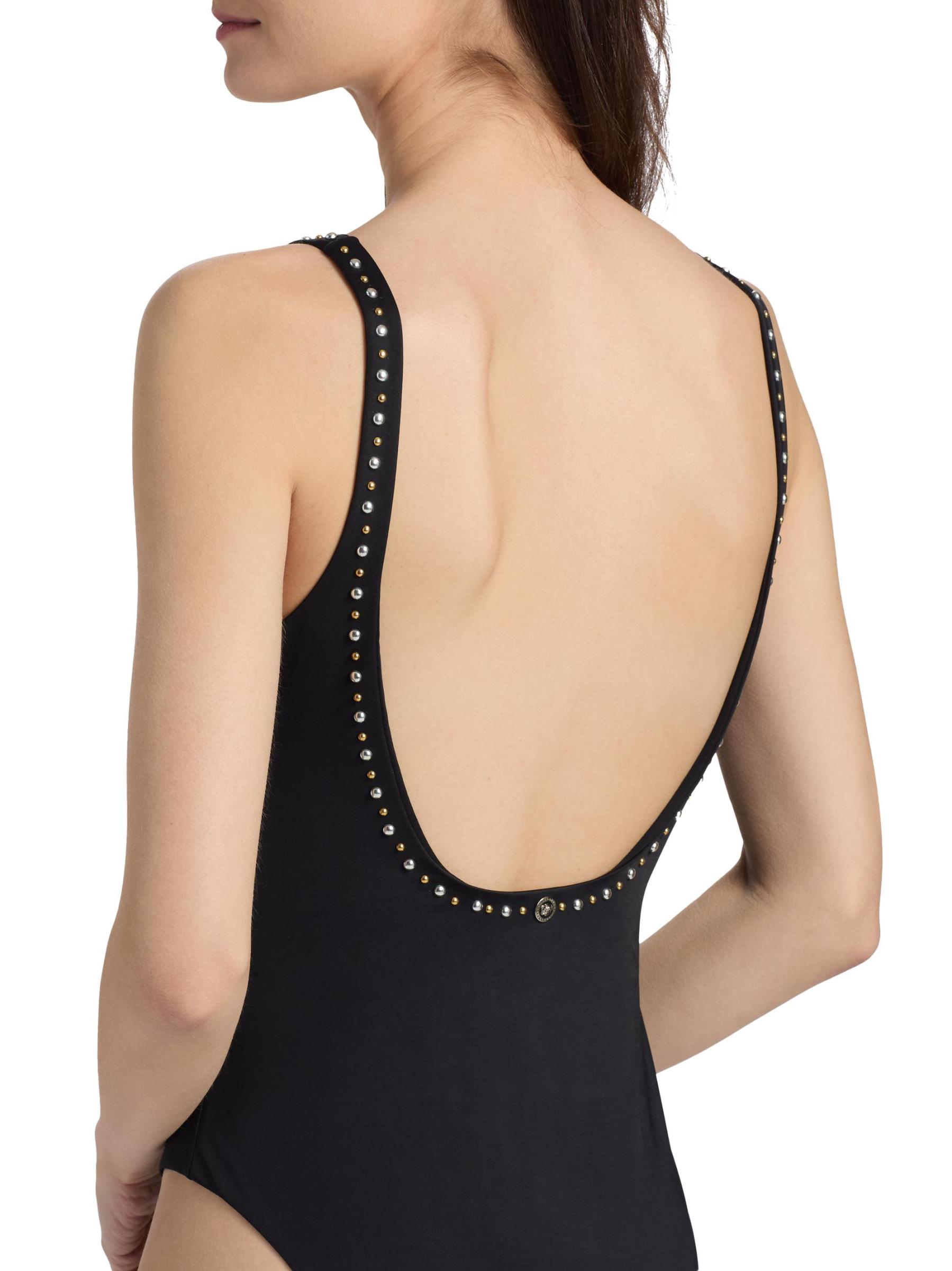 تتميز ملابس السباحة هذه المكونة من قطعة واحدة من فيرساتشي بأزرار مختلطة معقدة على طول الأحزمة وخط العنق في الأمام والخلف.
