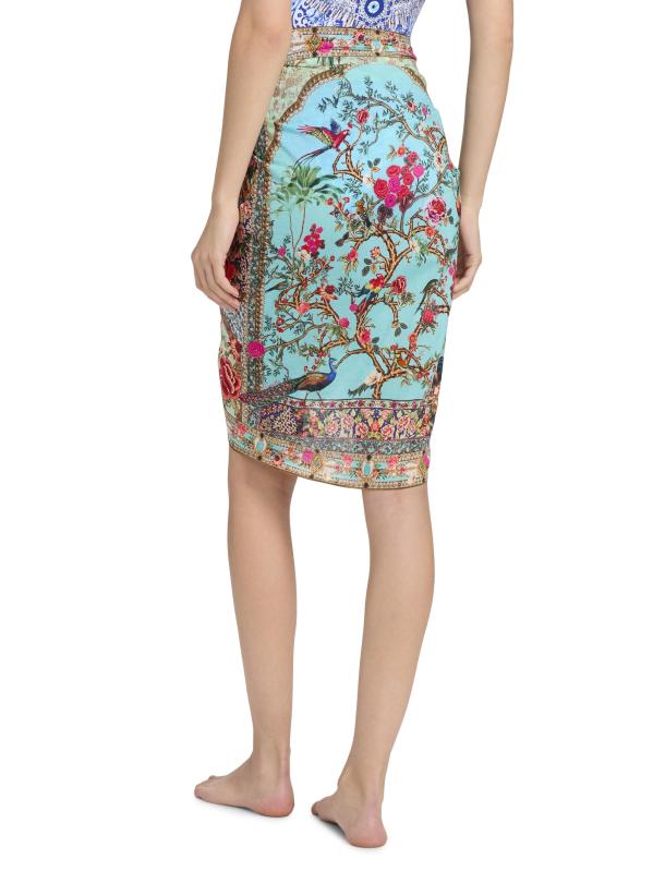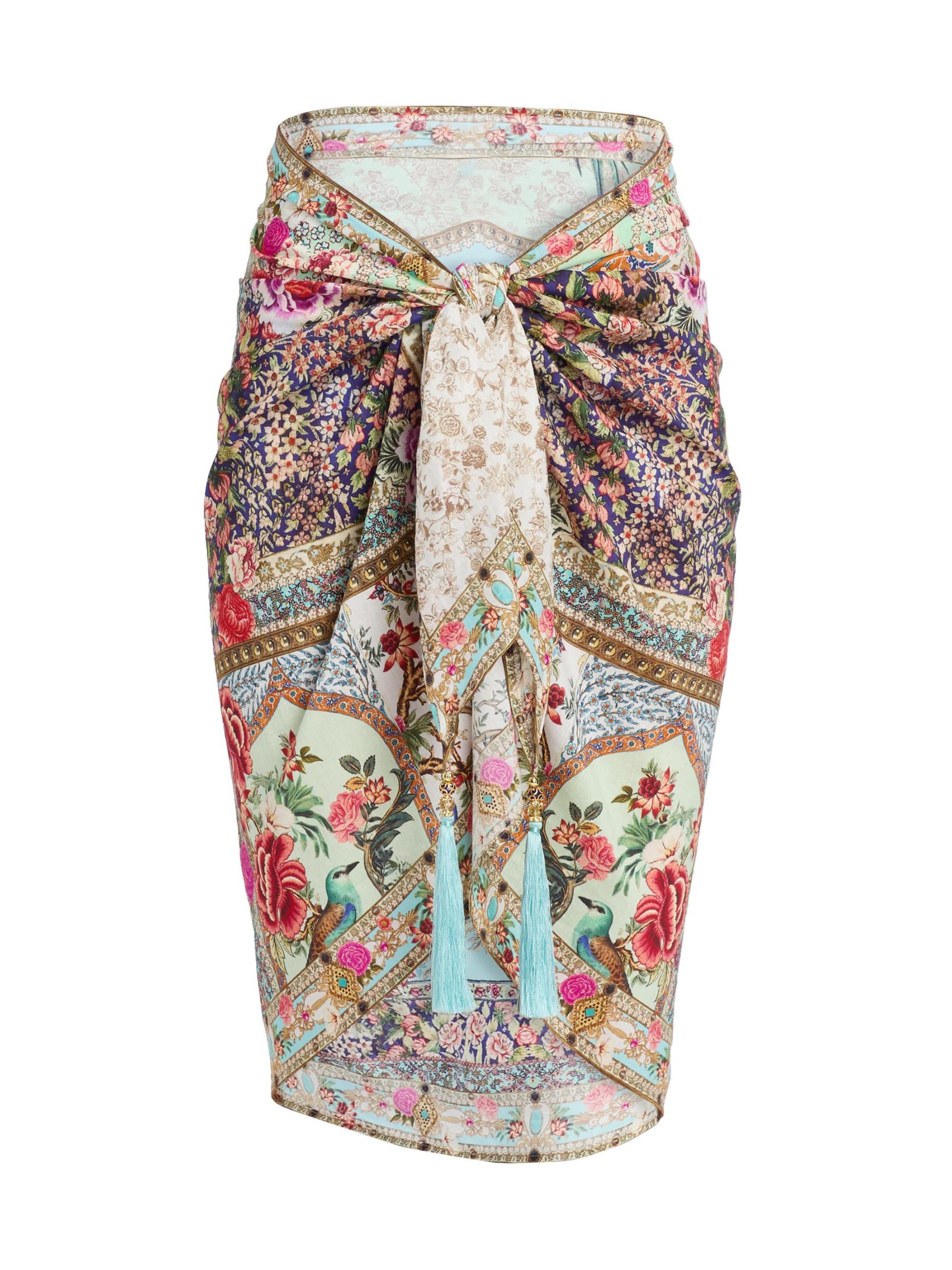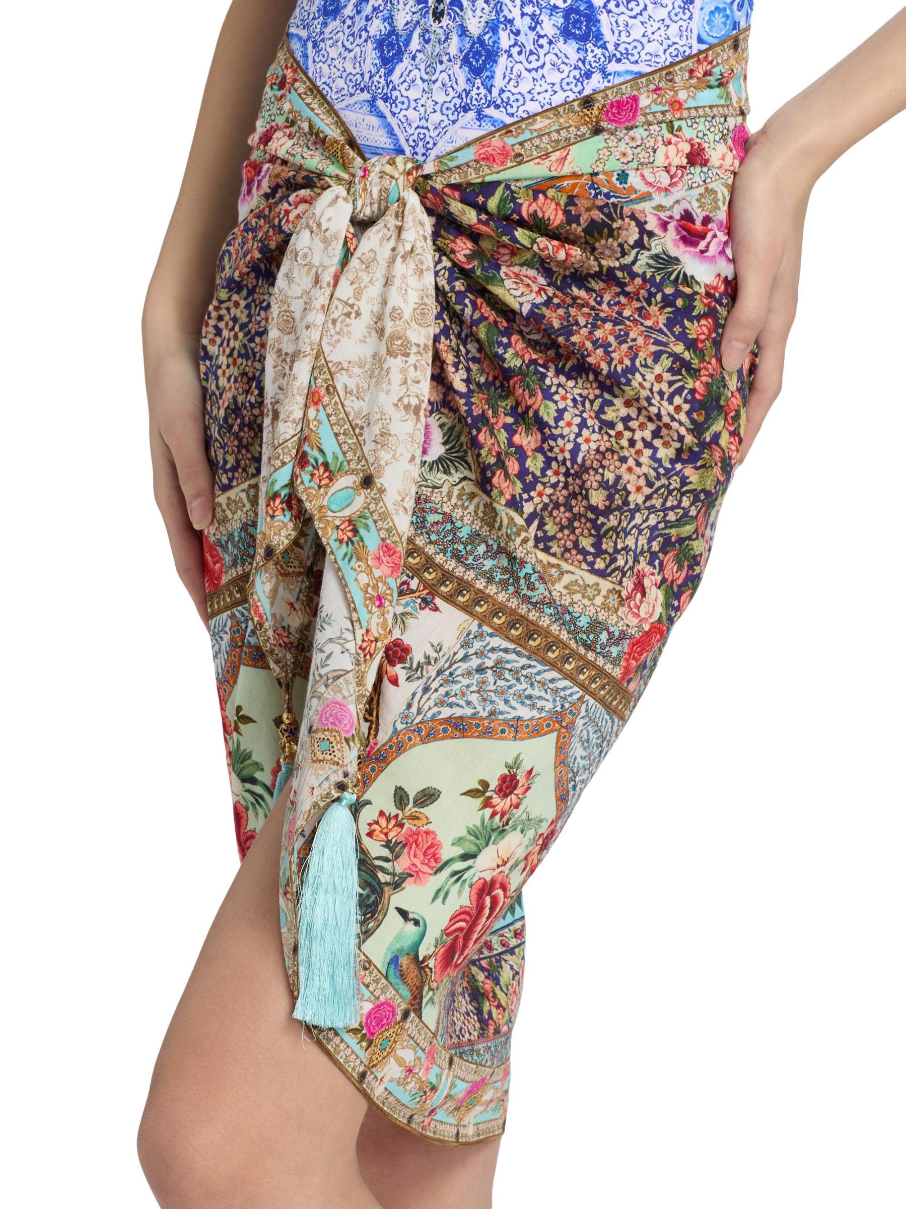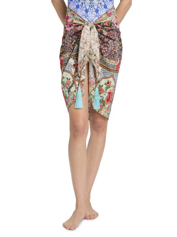صُنع هذا السارونغ القصير من Camilla من مزيج القطن والحرير، ويتميز بطبعة Sultans And Queens النابضة بالحياة مع زخارف نباتية وزخارف مزينة بشراشيب مطرزة بالخرز.